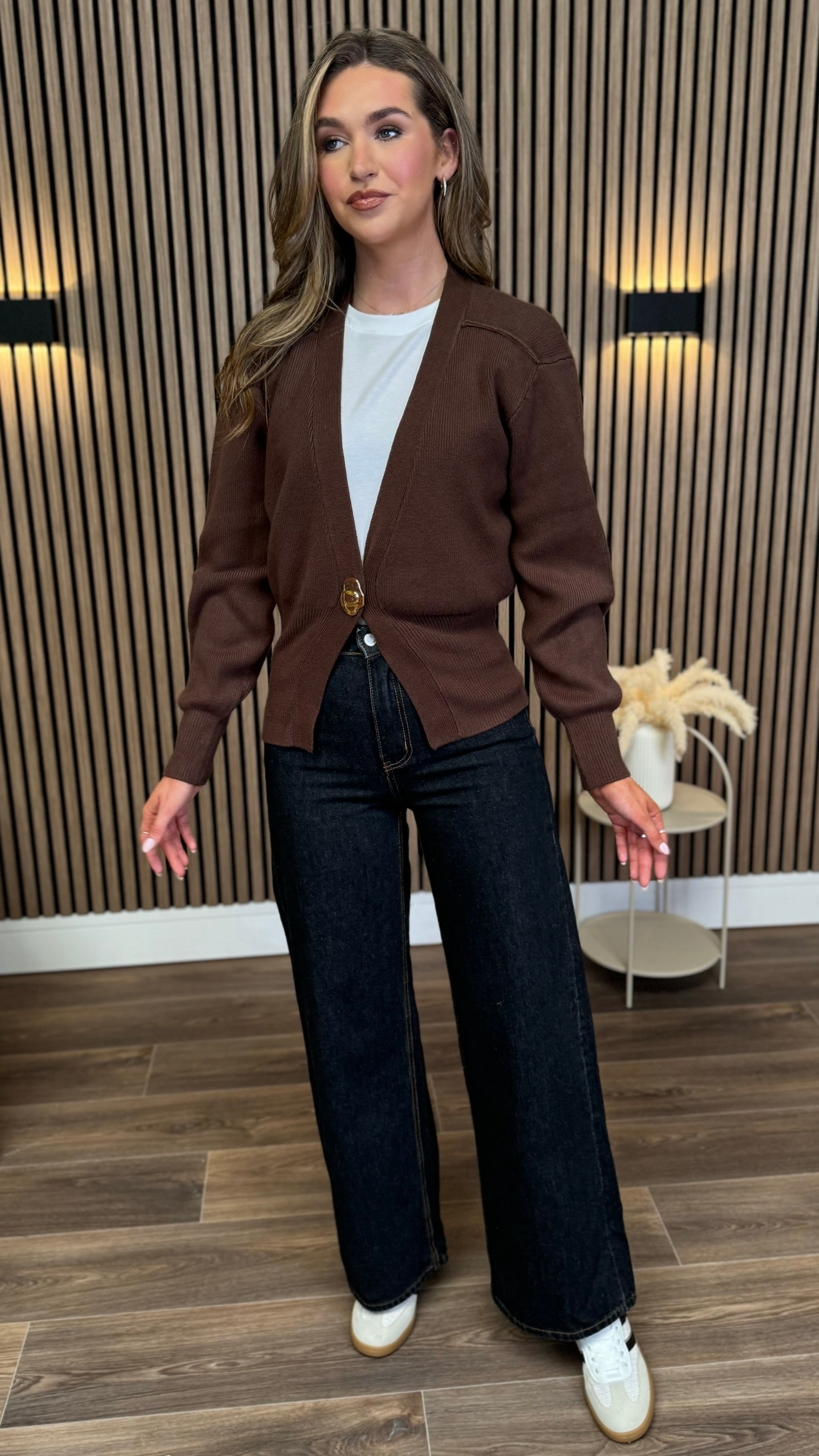 Wrap yourself in cosy charm with the Brinley Brown Gold Button Cardigan! ✨ This stylish piece features shiny gold buttons that add a splash of fun and flair to your look. Perfect for layering on chilly days or jazzing up your outfit, it’s your new go-to for comfort and cuteness. 🍂💛