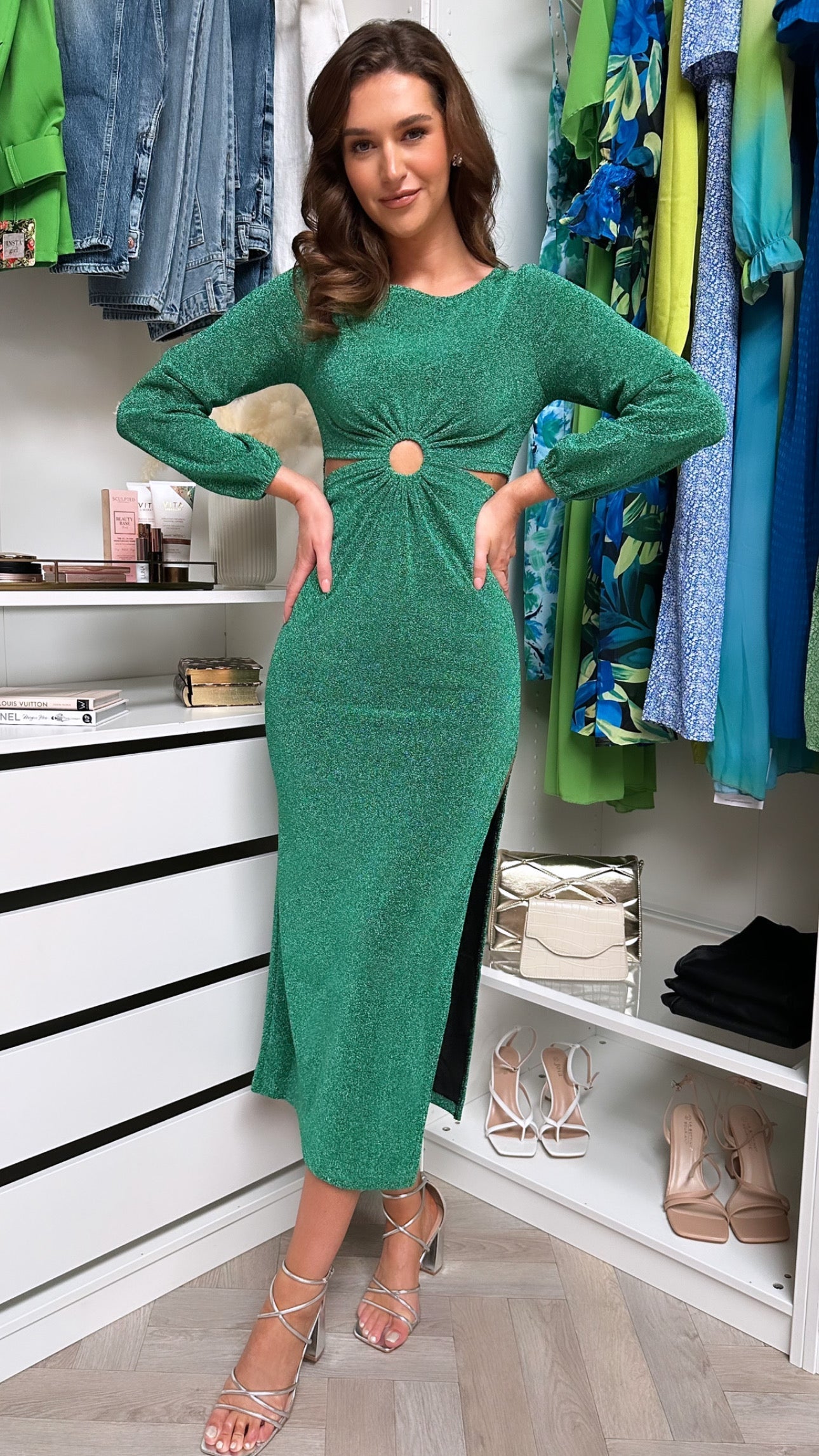 This Britta Green Cut Out Midi Dress is a killer way to make a statement! From its midi length to its cut out accents, this dress is sure to turn heads with its daring yet classy style. Show off your legs with the side splits and battle the cold with the long sleeves! You won't be able to resist this classy and timeless wardrobe staple.