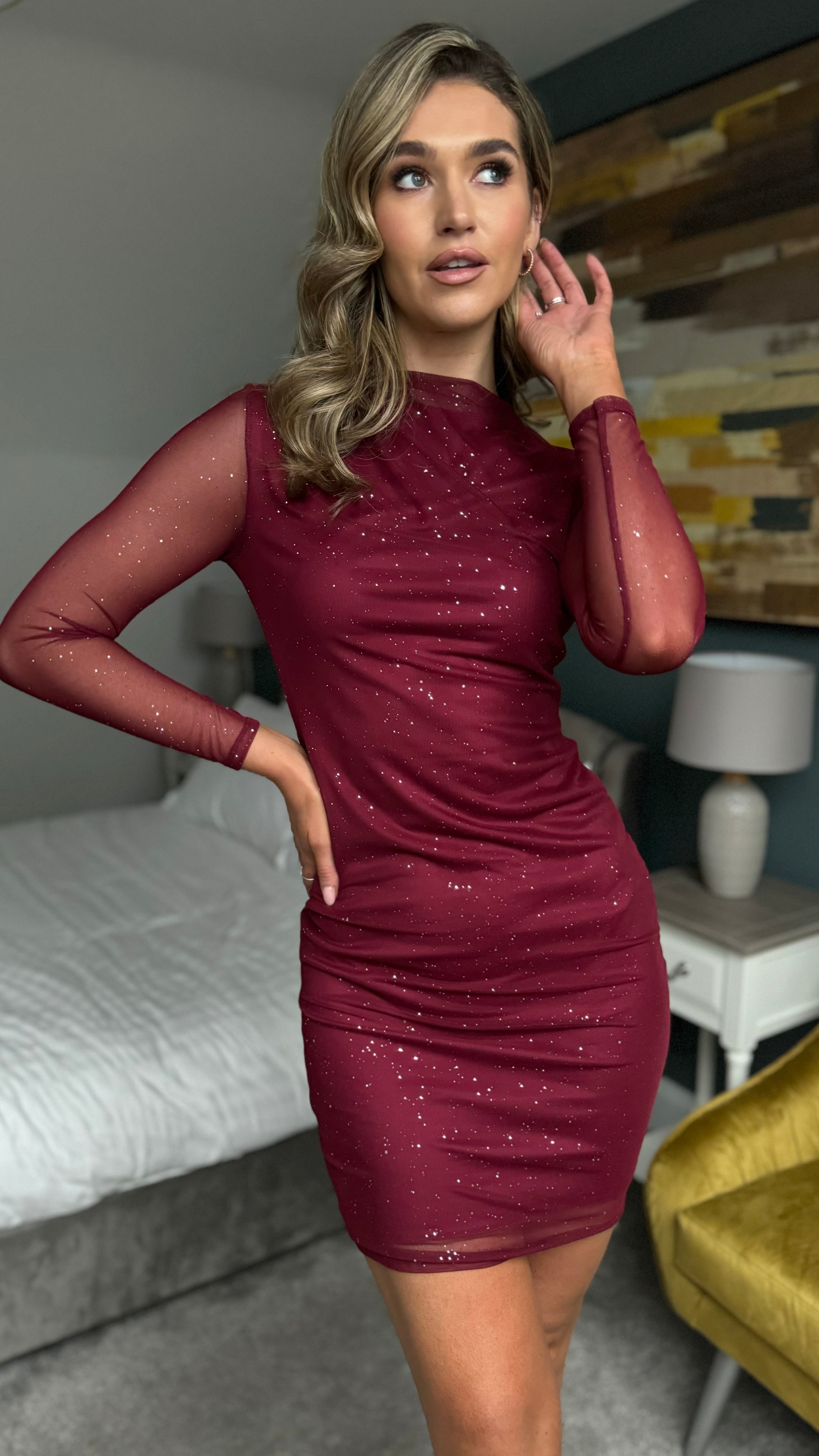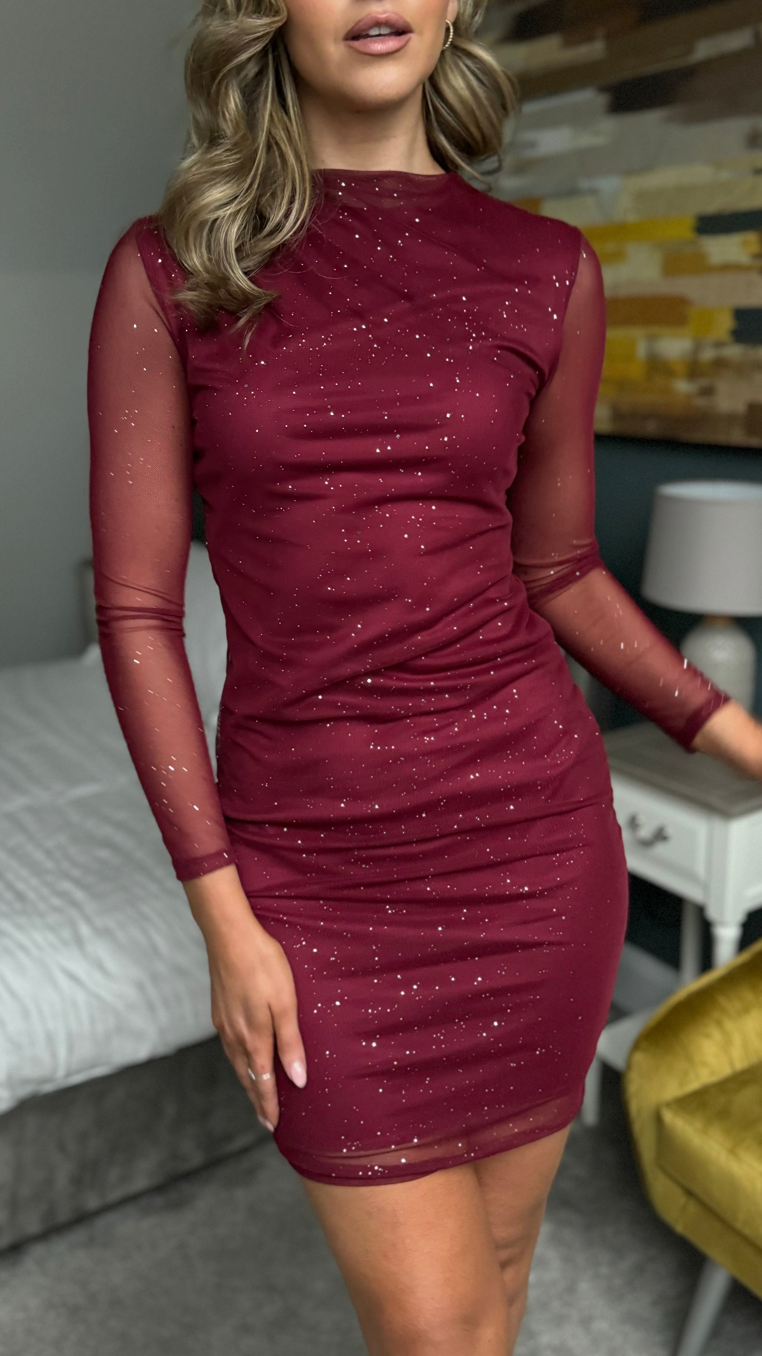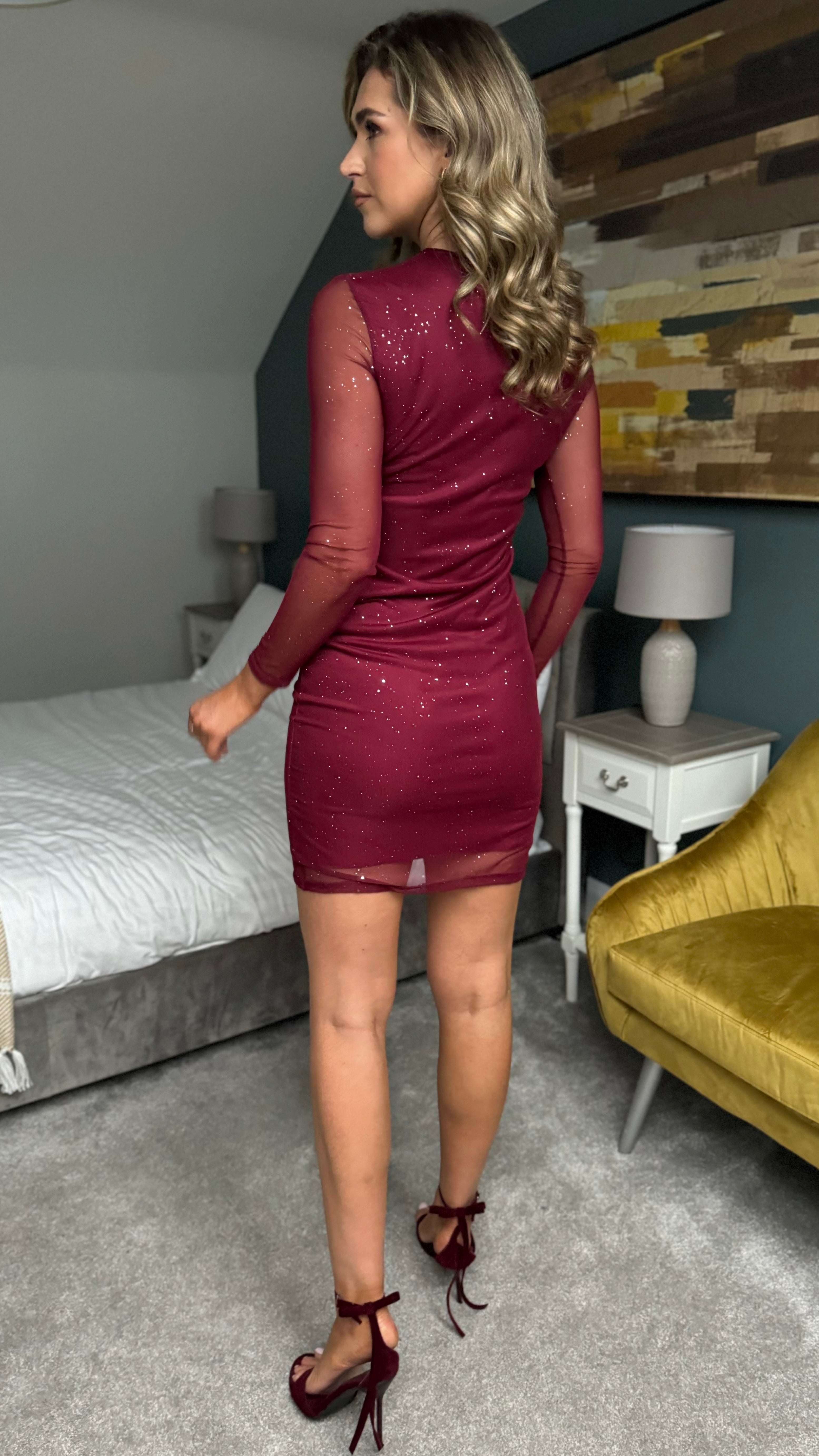 Cameron Burgundy Mesh Sparkle Detail Mini Dress