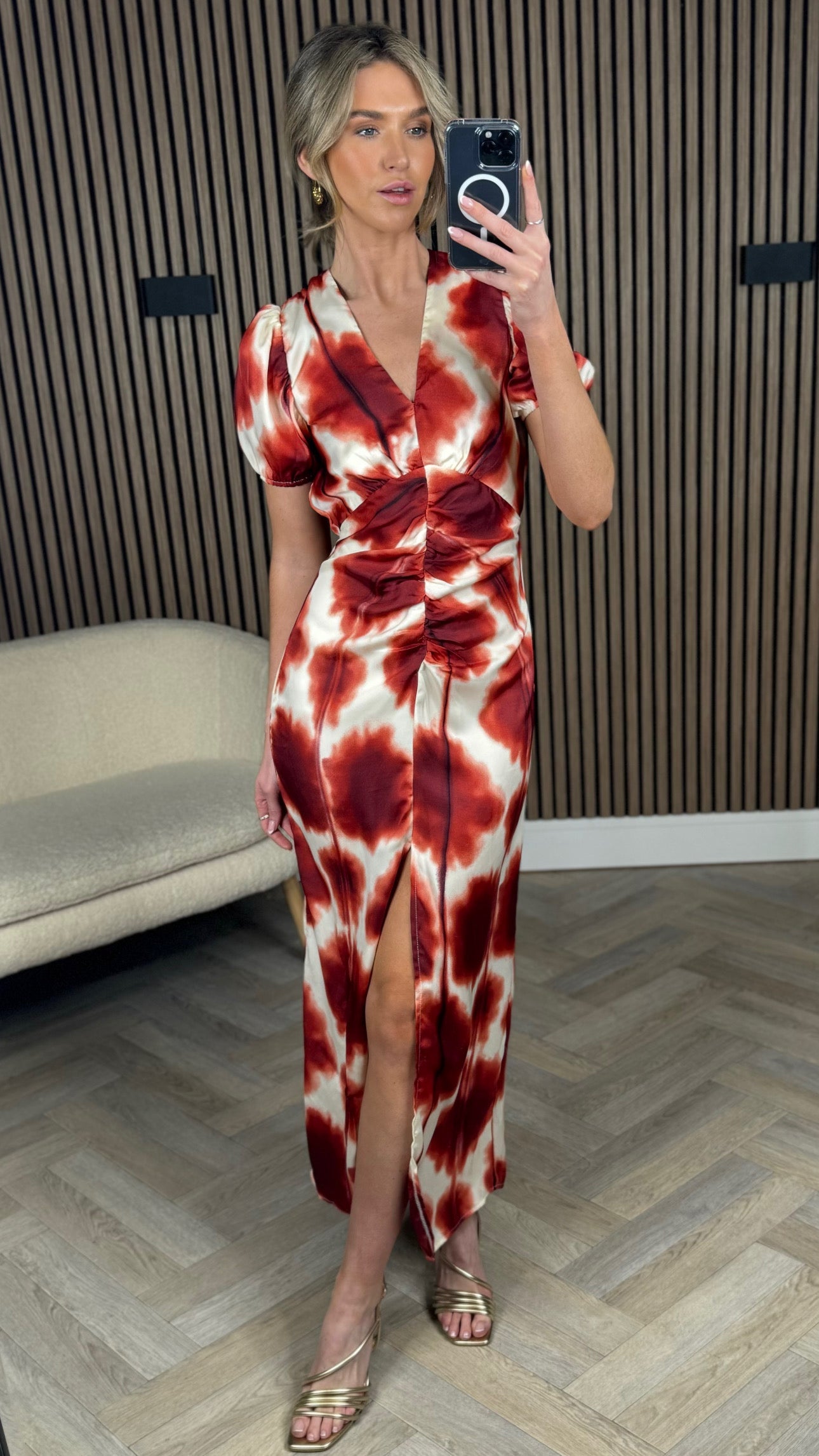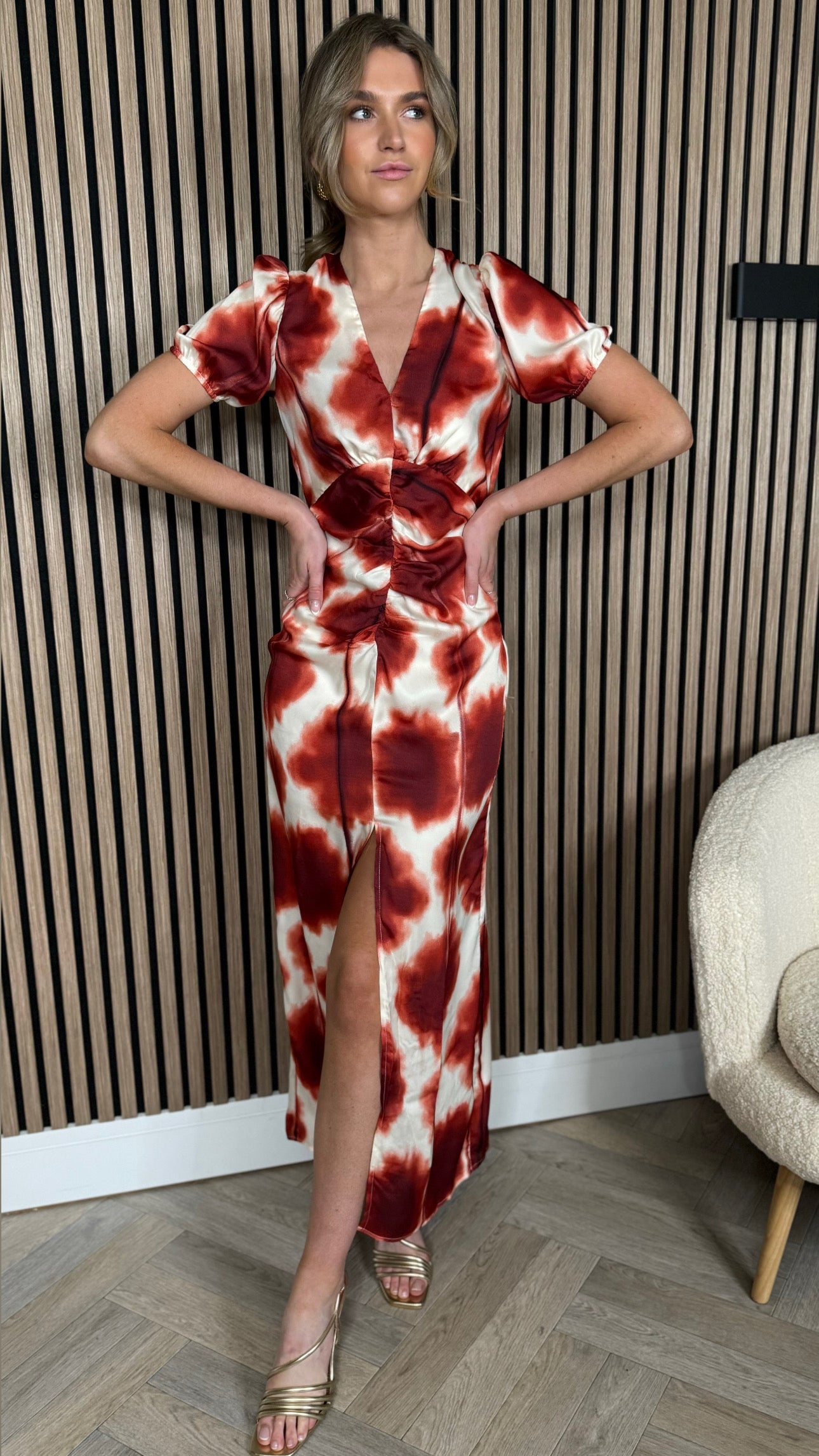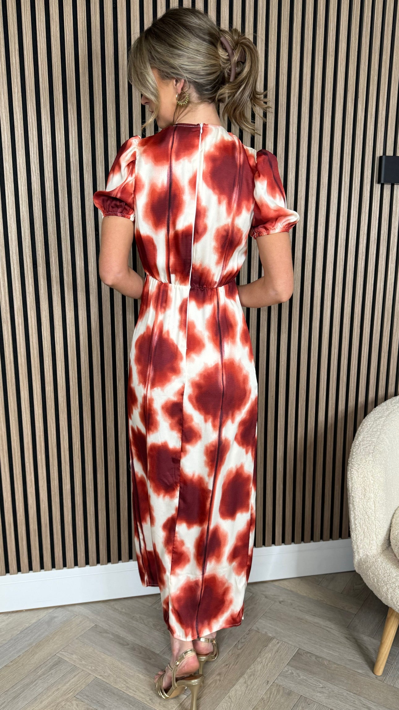 Carlota Rust Printed Puff Sleeve Front Split Midi Dress