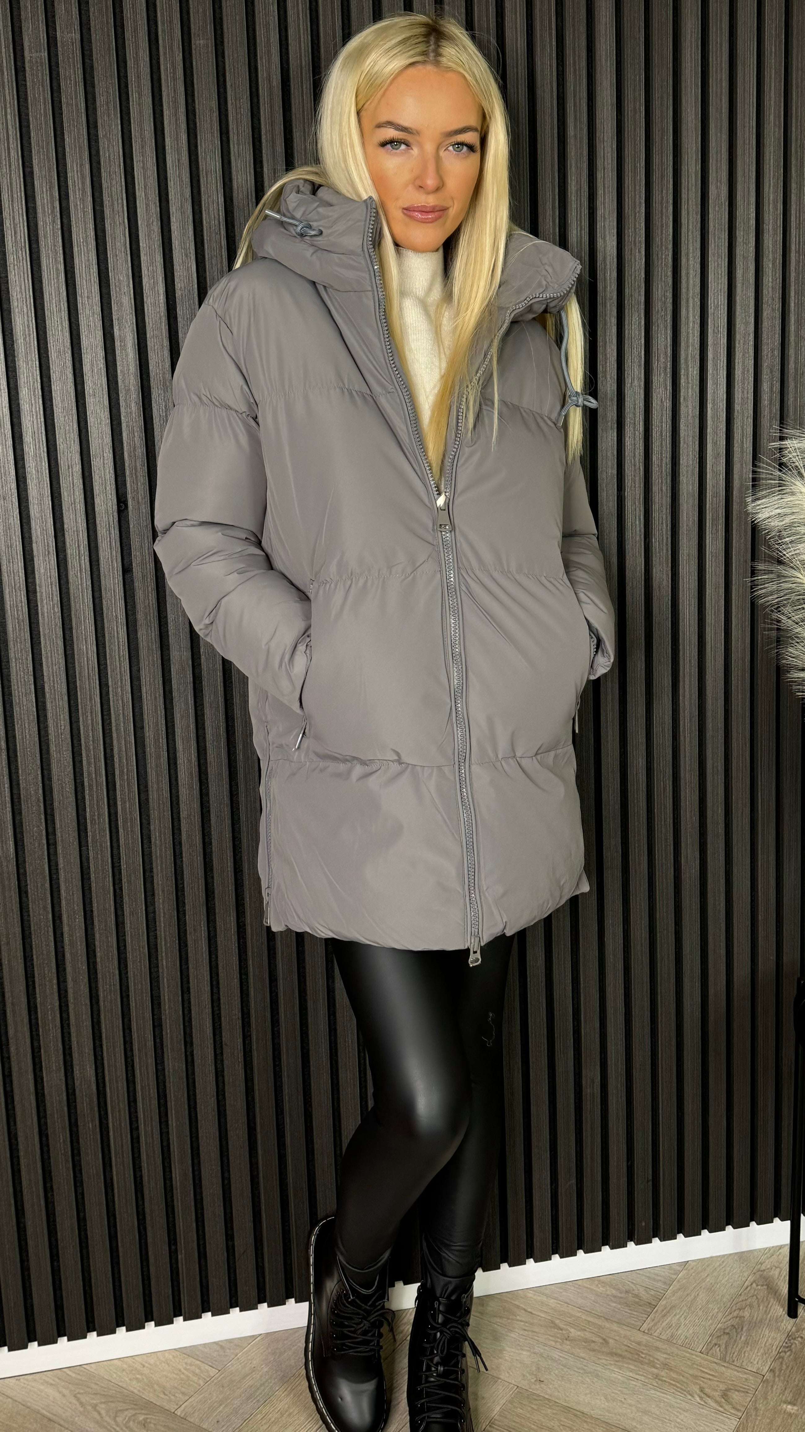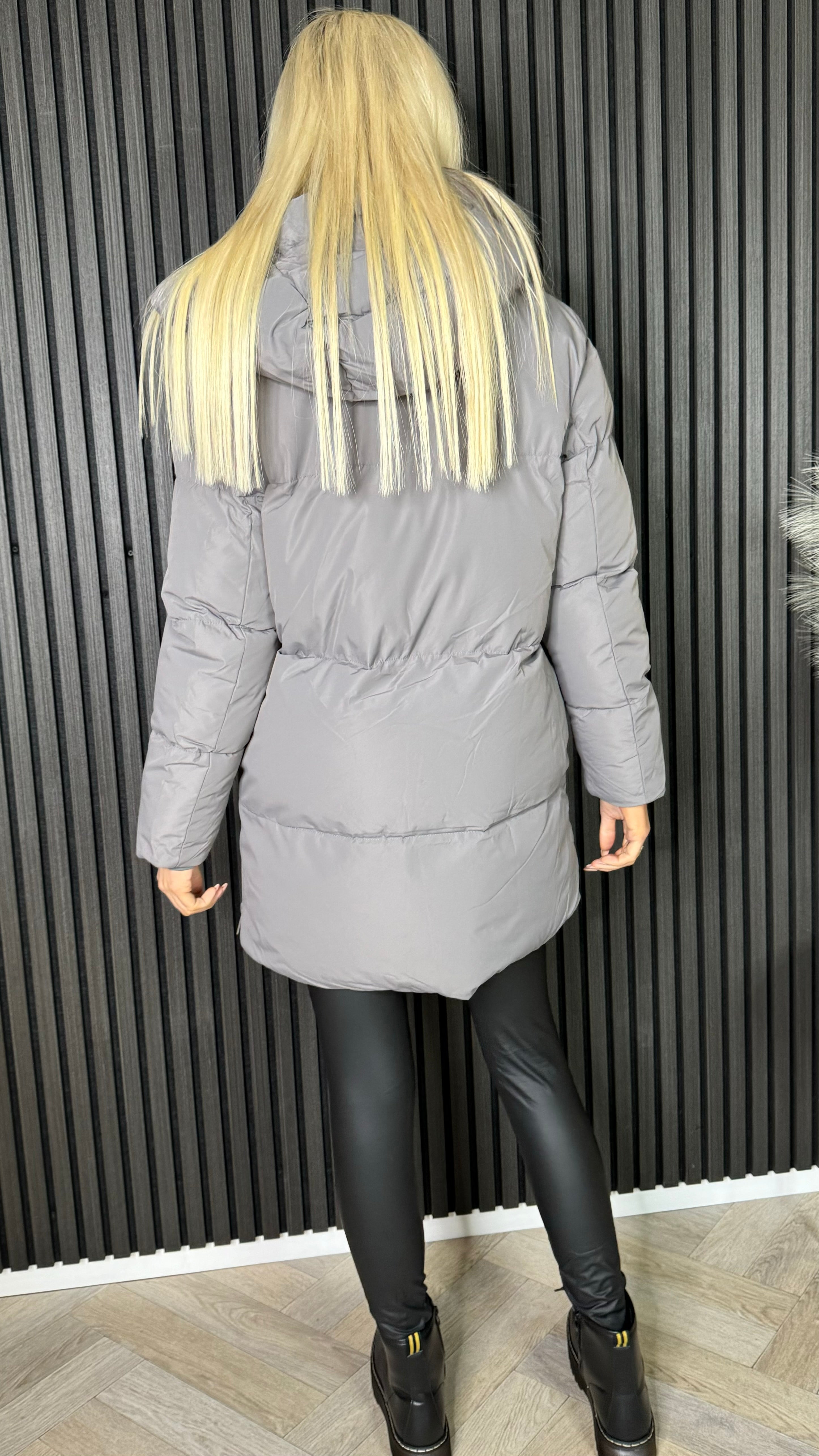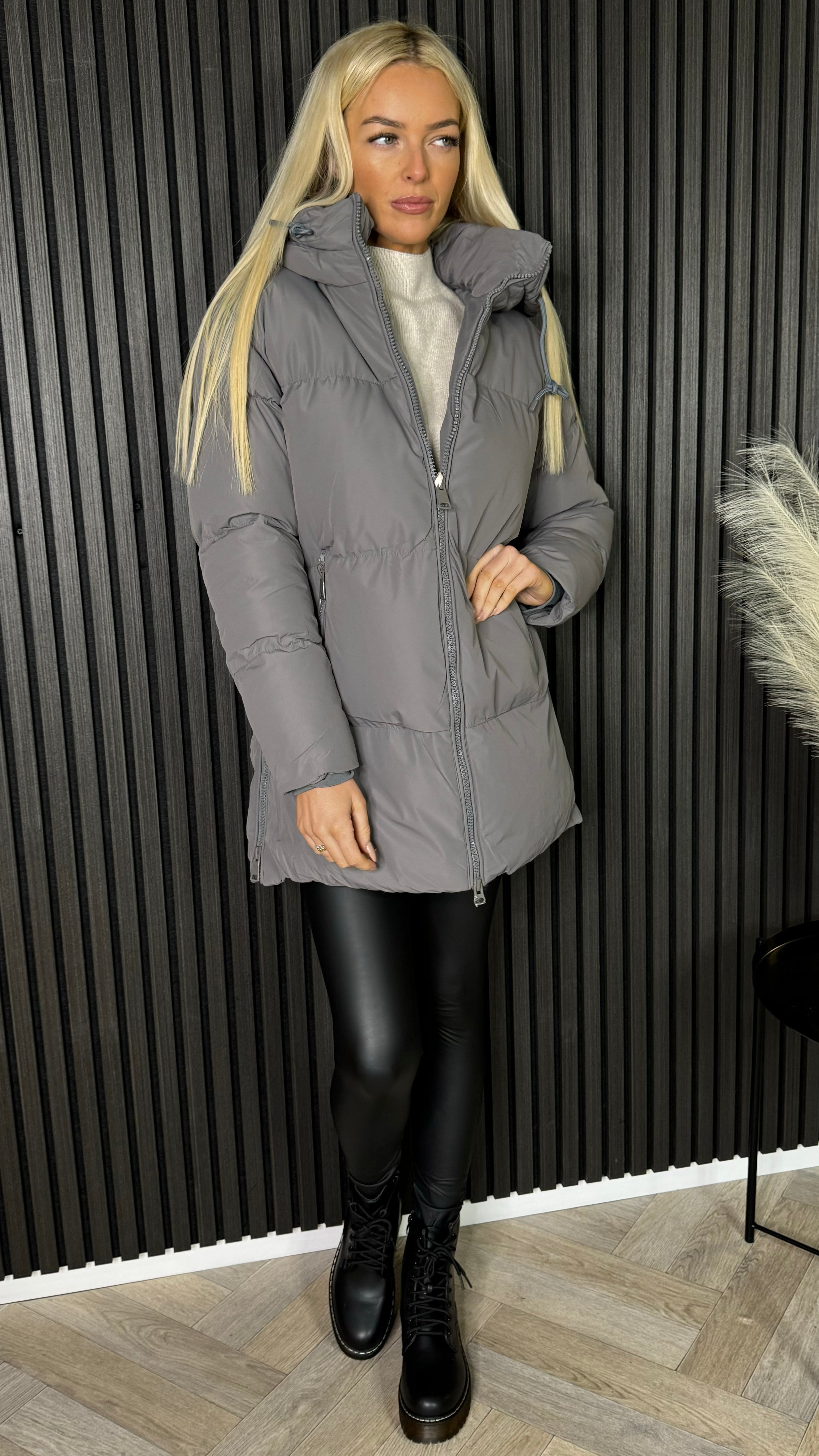 Stay cozy and stylish with our Carmella Charcoal Grey Puffer Hooded Coat. This mid-thigh length coat features a double zip design and side zips for added comfort and convenience. The cuffed sleeves and zipped pockets add extra flair to this must-have winter essential.