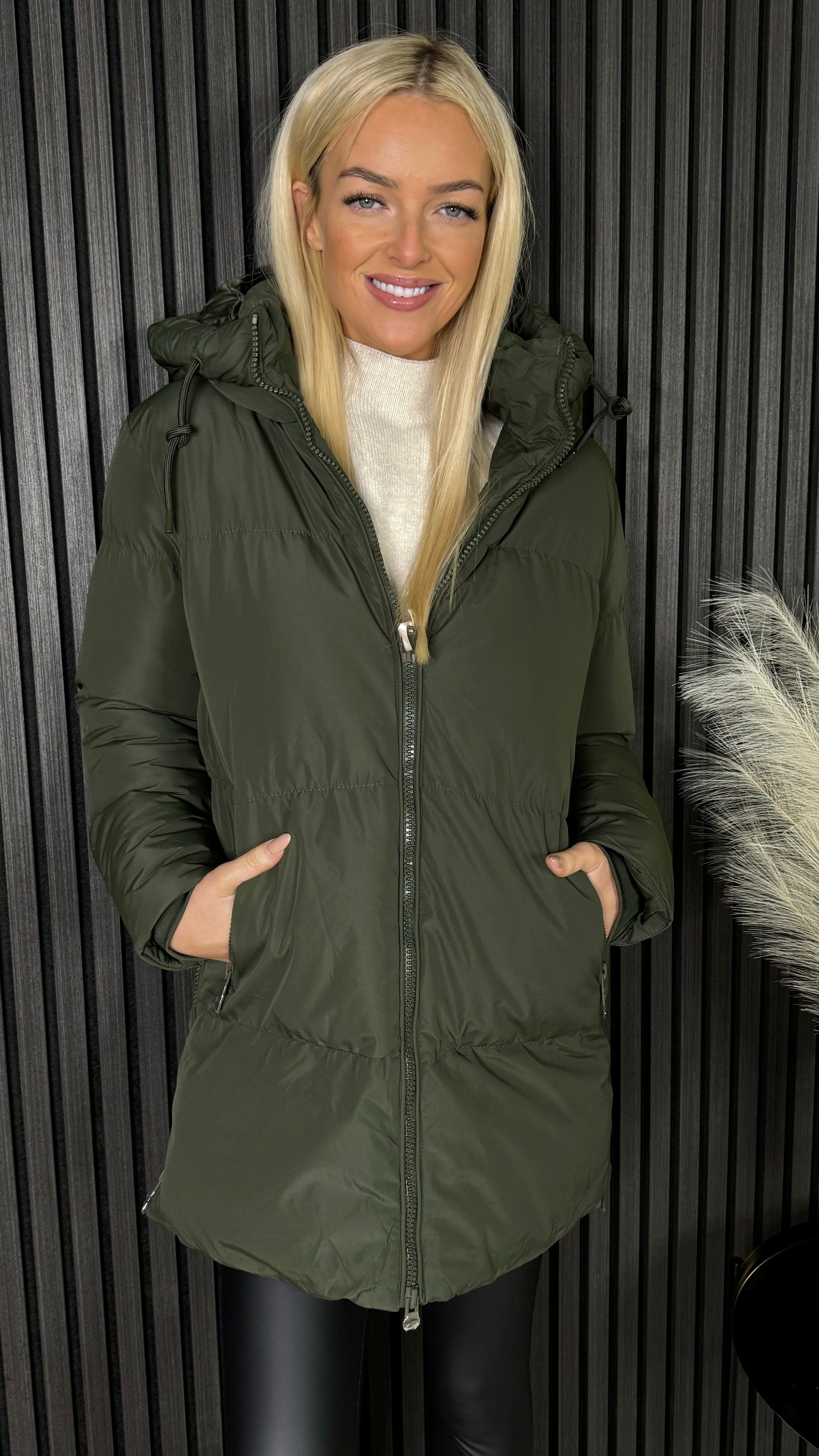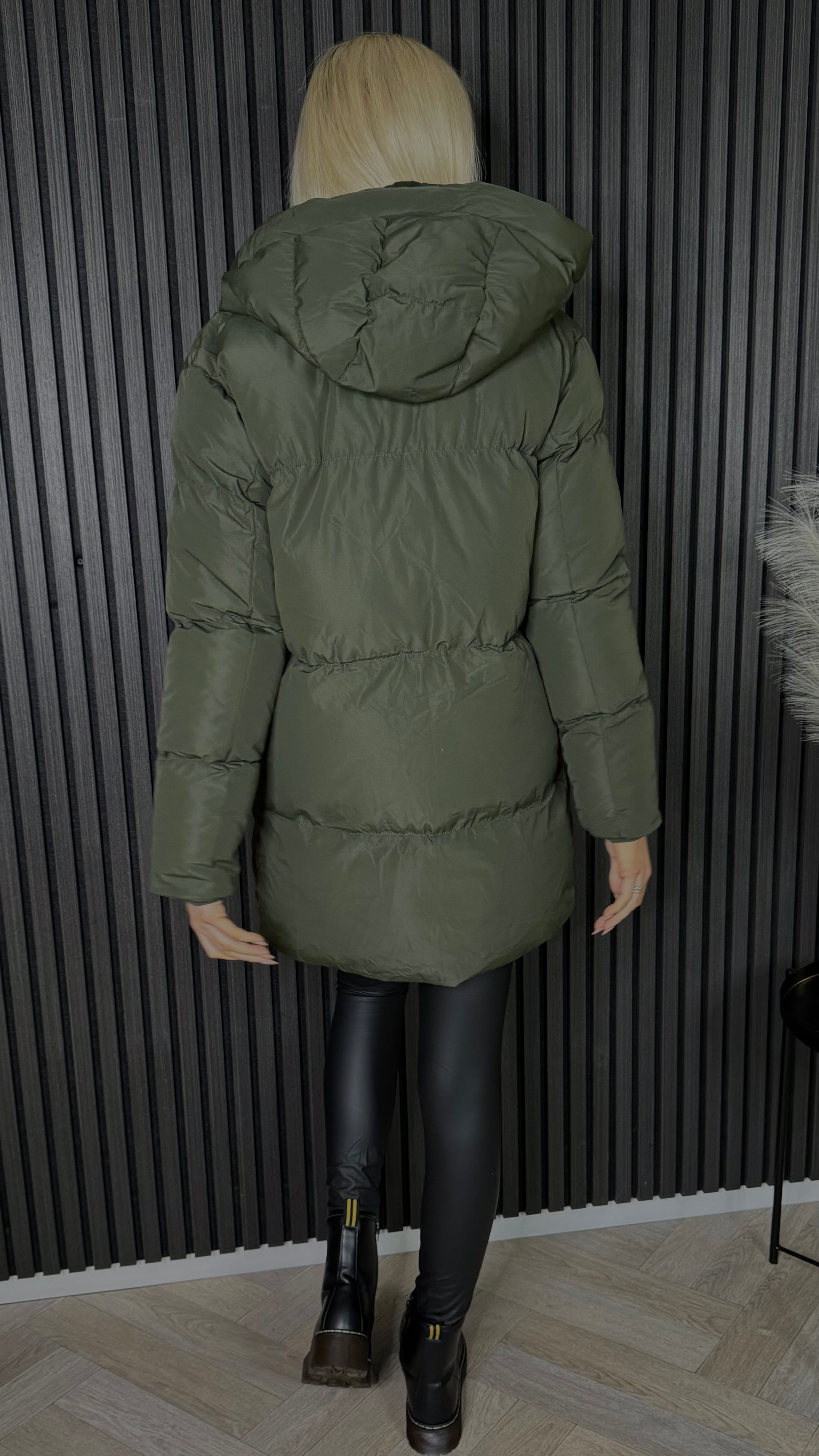 Stay cozy and stylish with our Carmella Khaki Puffer Hooded Coat. This mid-thigh length coat features a double zip design and side zips for added comfort and convenience. The cuffed sleeves and zipped pockets add extra flair to this must-have winter essential.