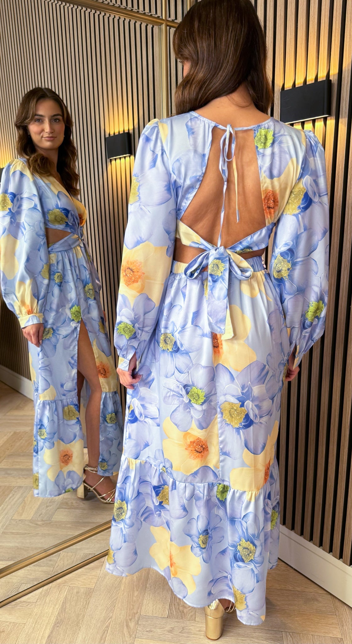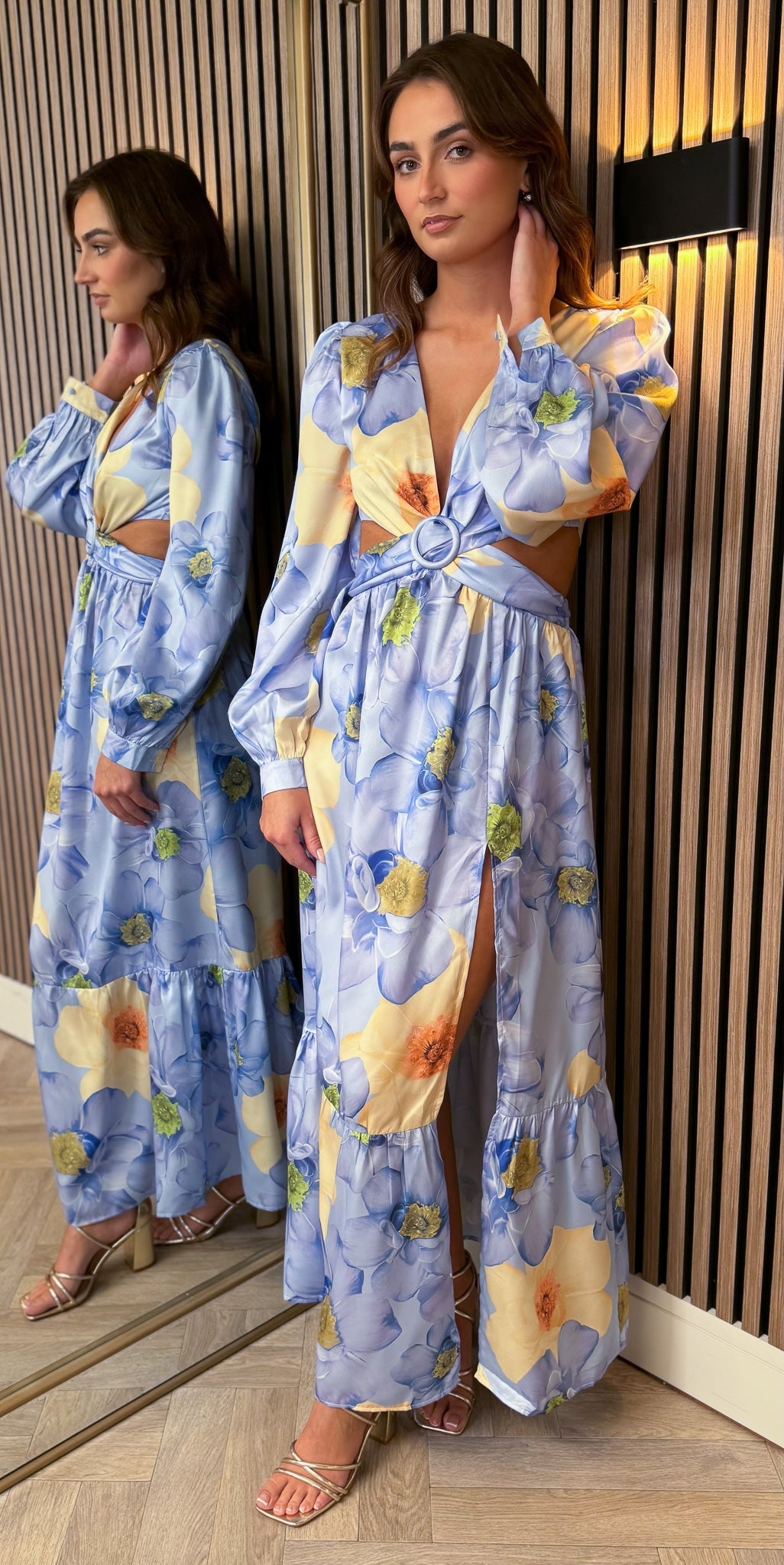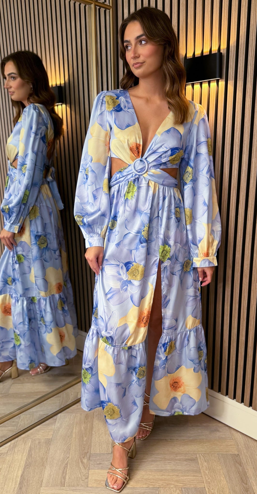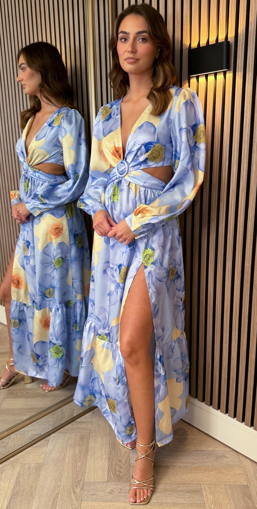 Christine Blue Floral Printed Cut Out Detail Midi Dress