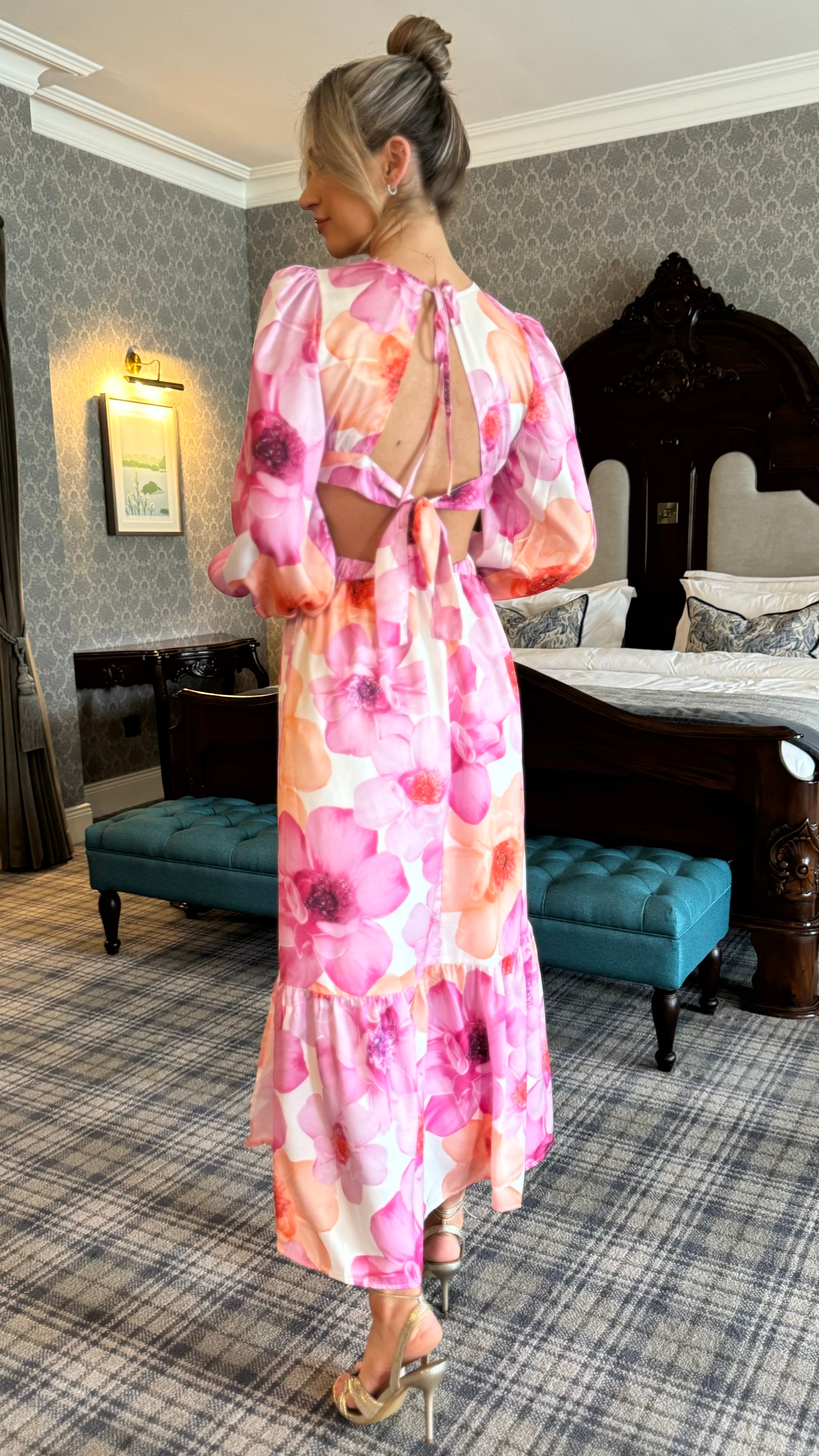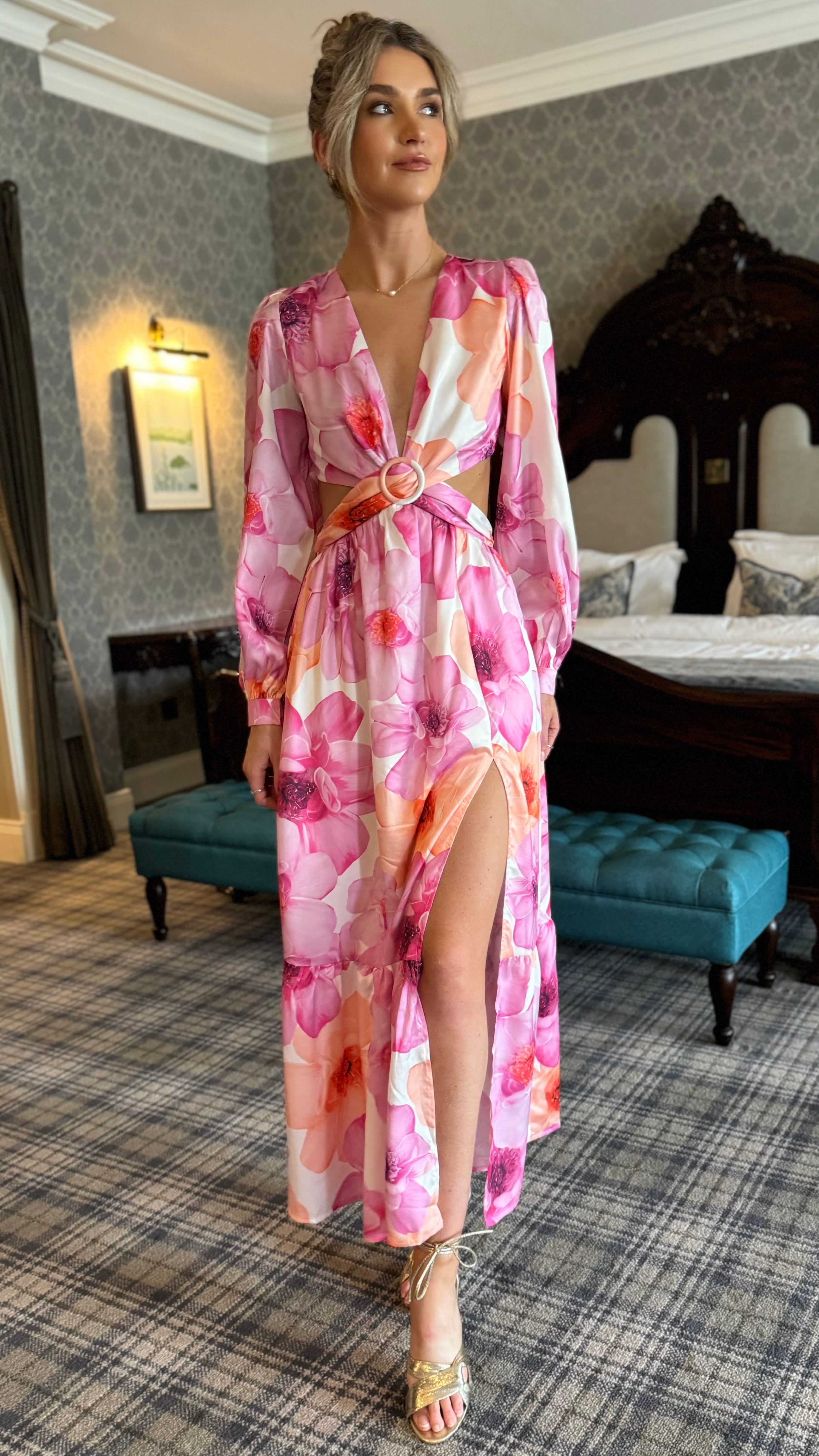 Christine Pink Floral Printed Cut Out Detail Midi Dress