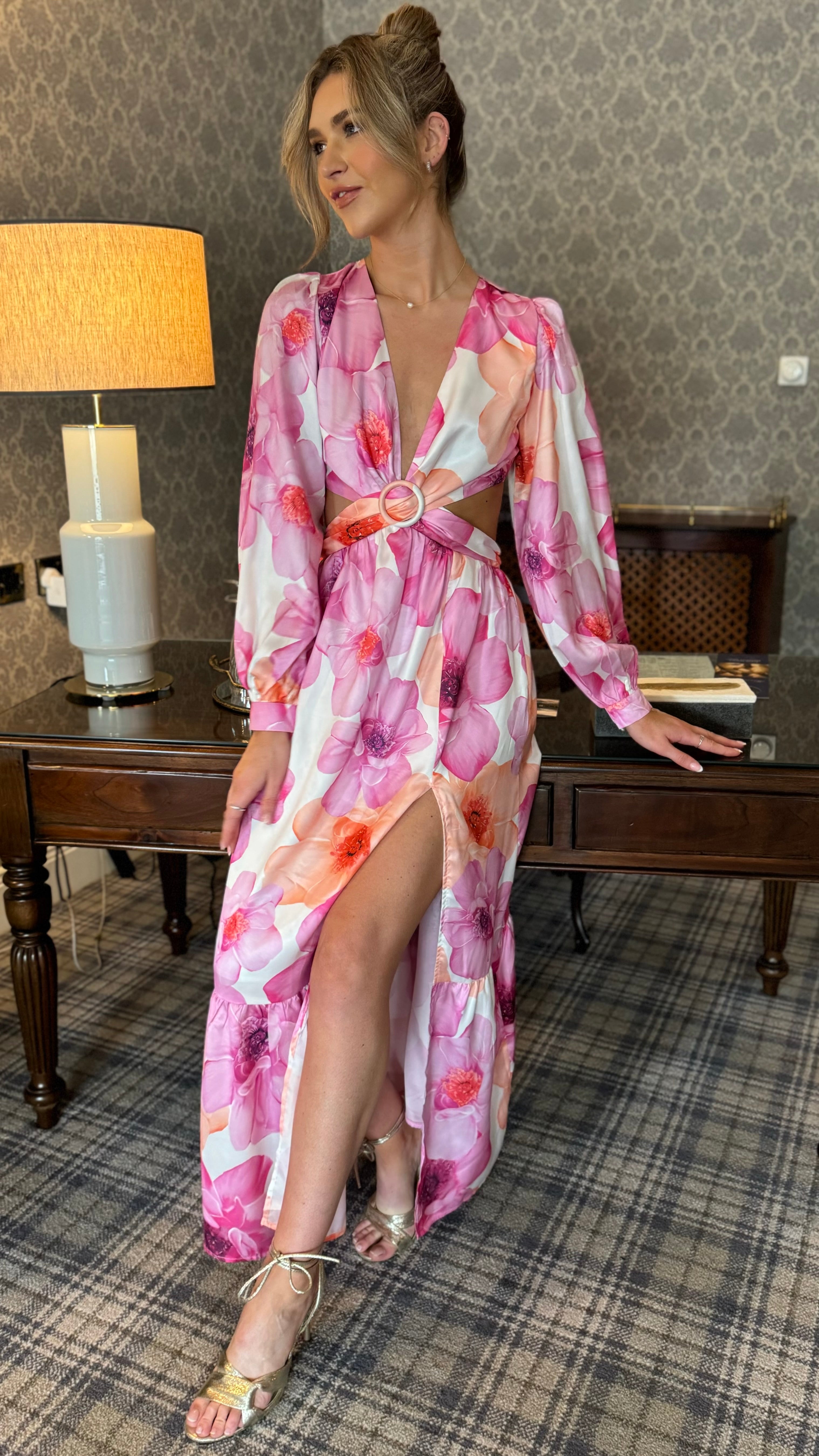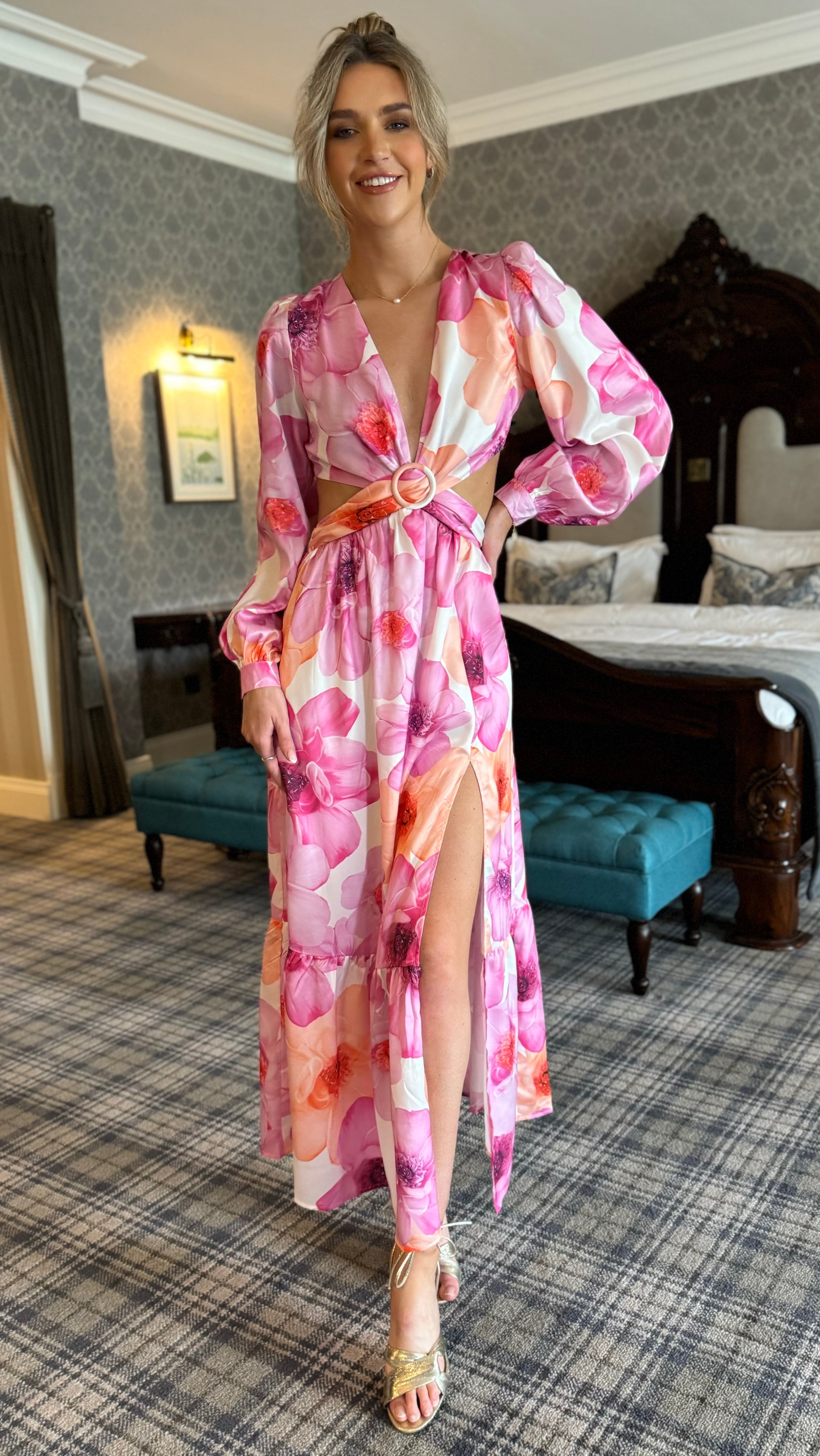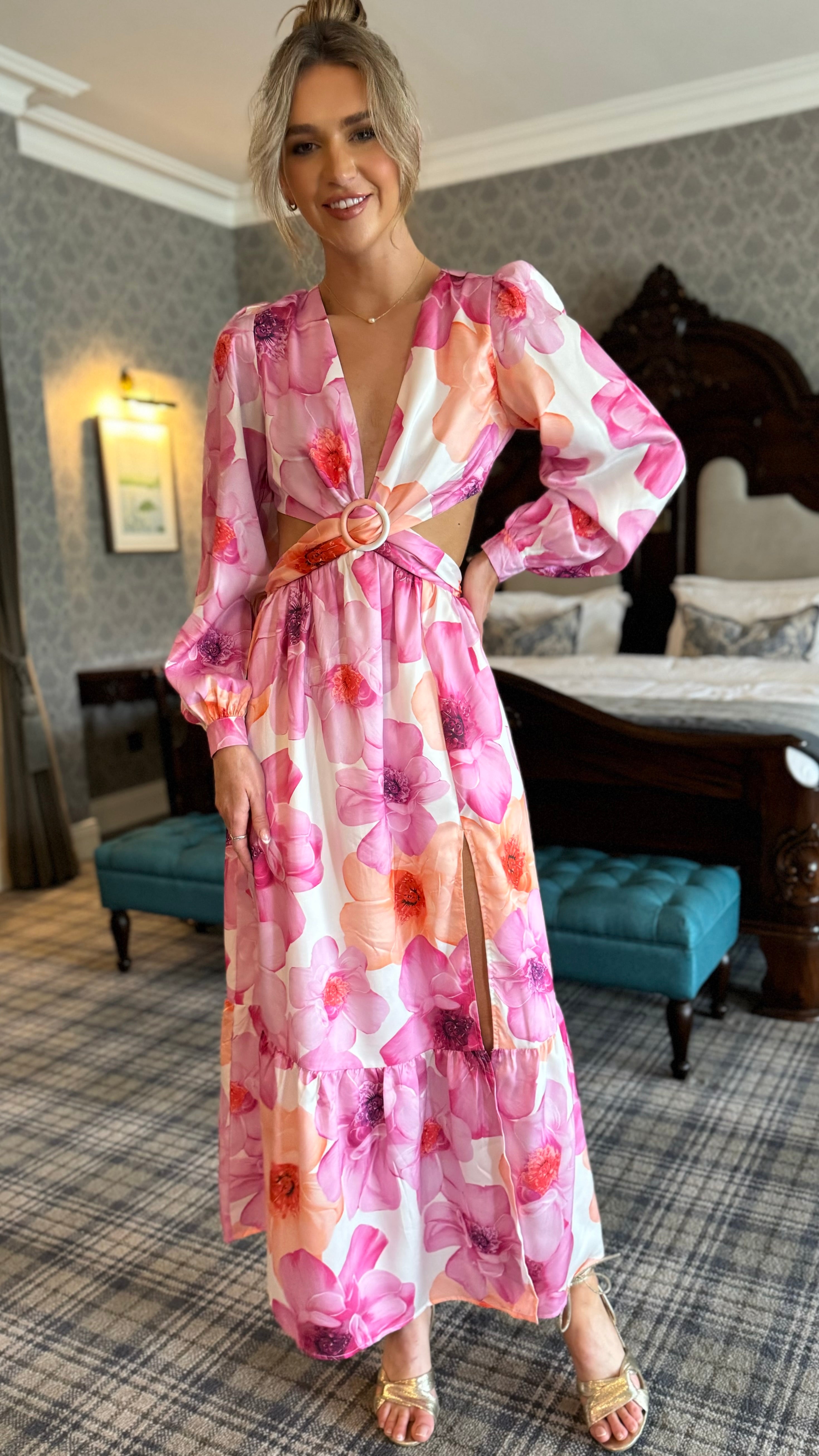 Get ready to stand out in this floral-printed midi dress! With a unique cut-out detail, long sleeves, and a trendy buckle feature, this dress is the perfect combination of playful and chic. Perfect for any occasion, you'll feel confident and stylish in this Christine Pink dress. 🌺😍