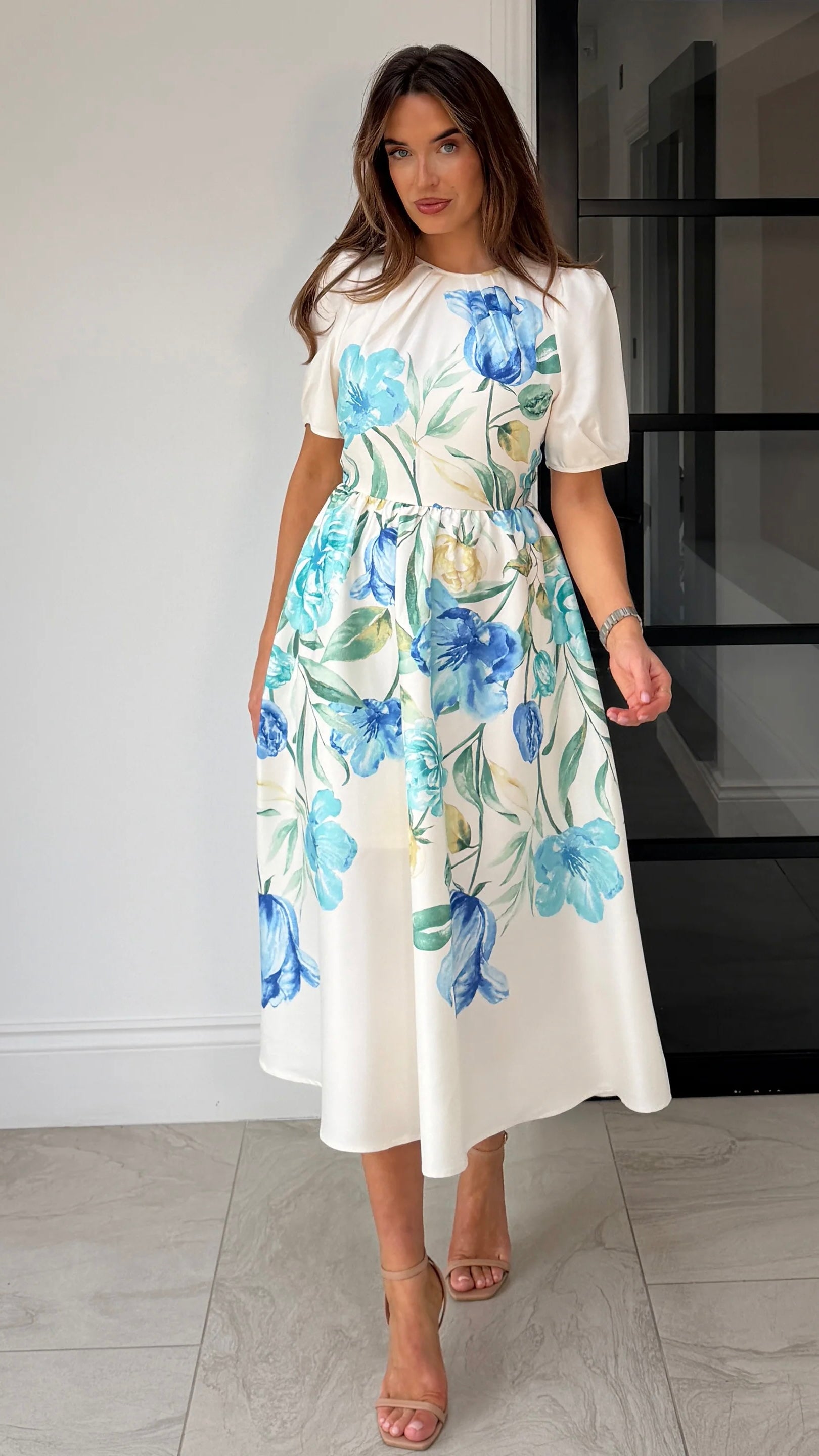 Clodagh White & Blue Floral A Line Midi Dress (PRE-ORDER)