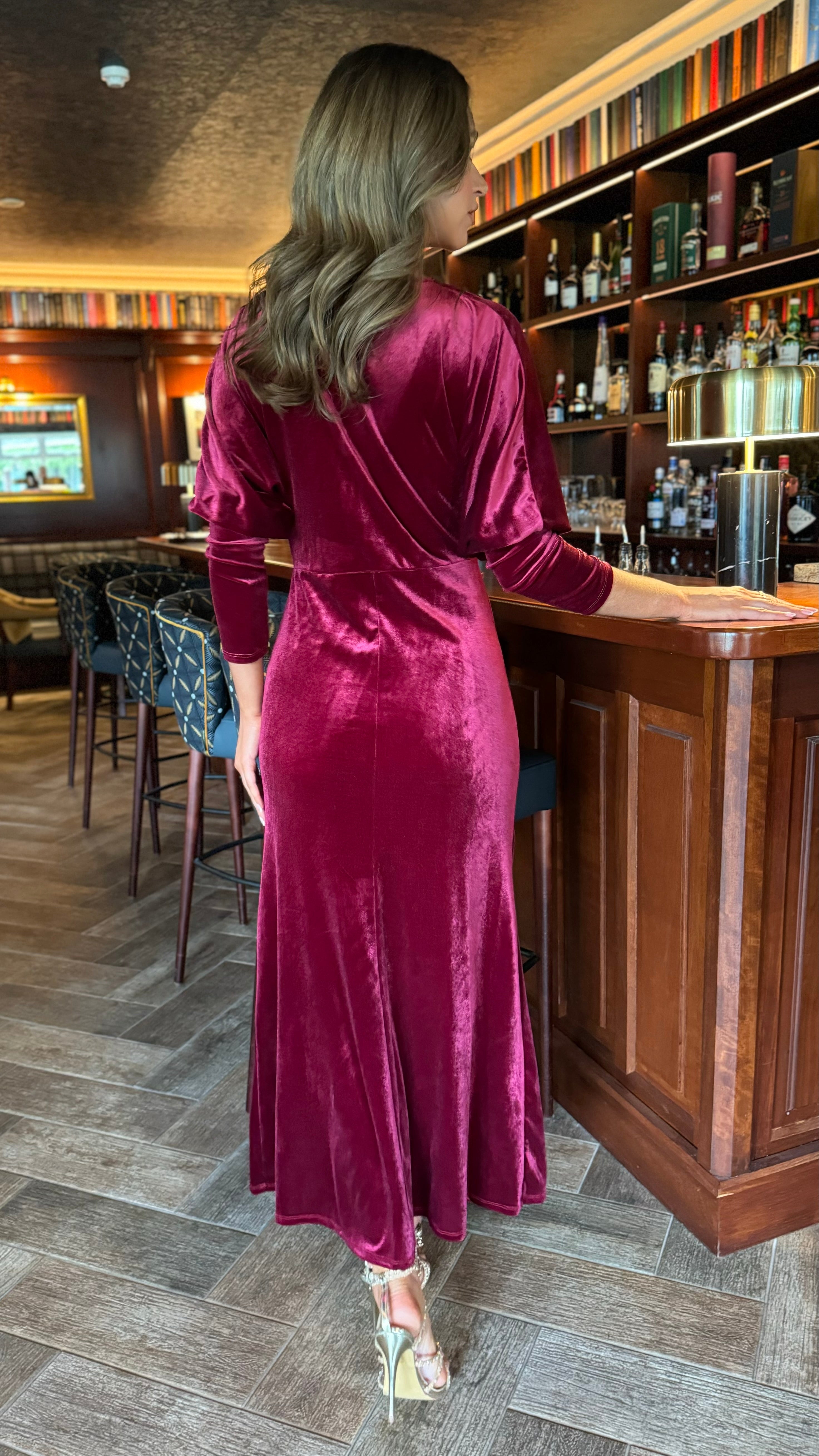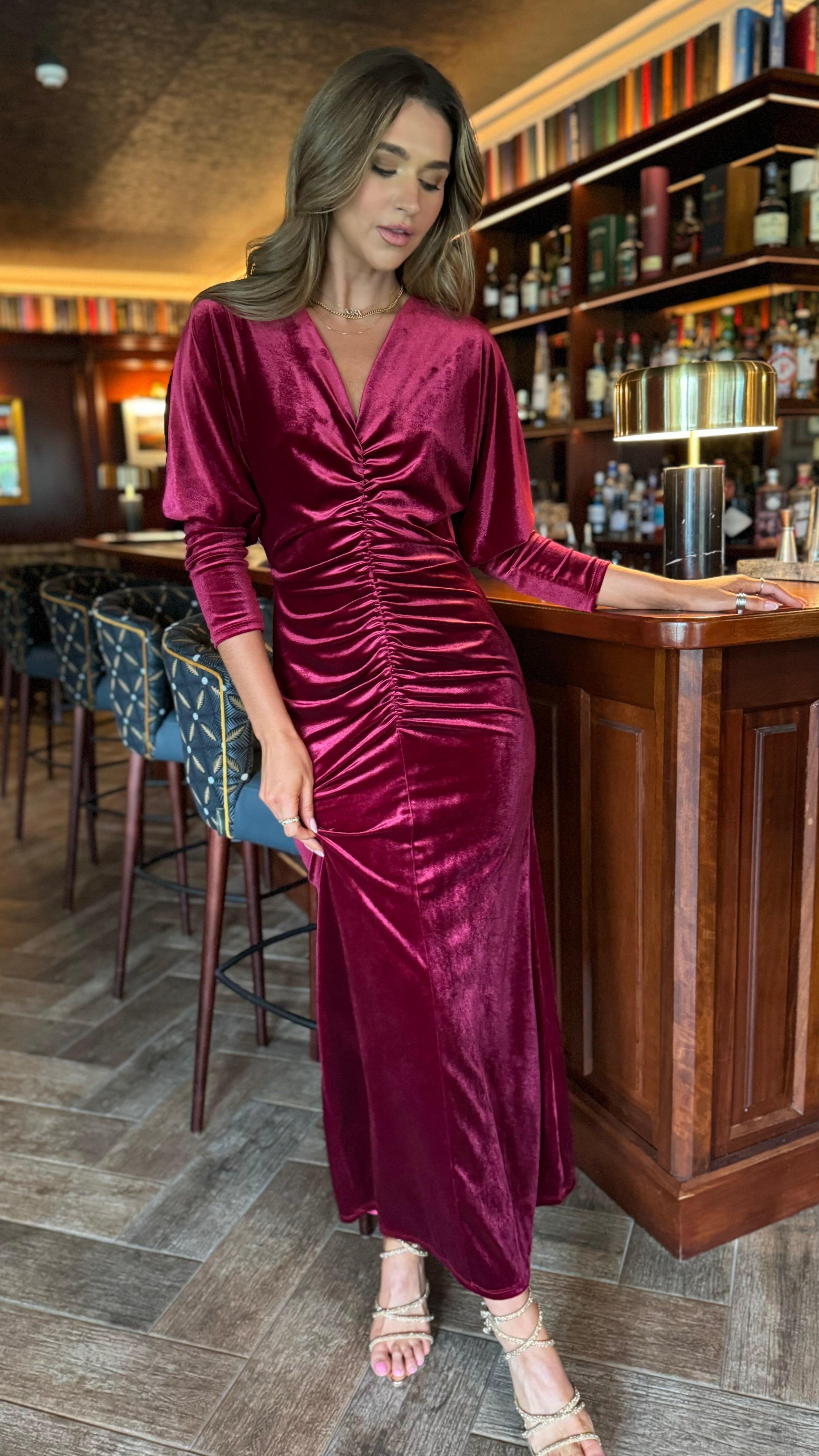 Colleen Burgundy Velvet Finish Ruched Midi Dress