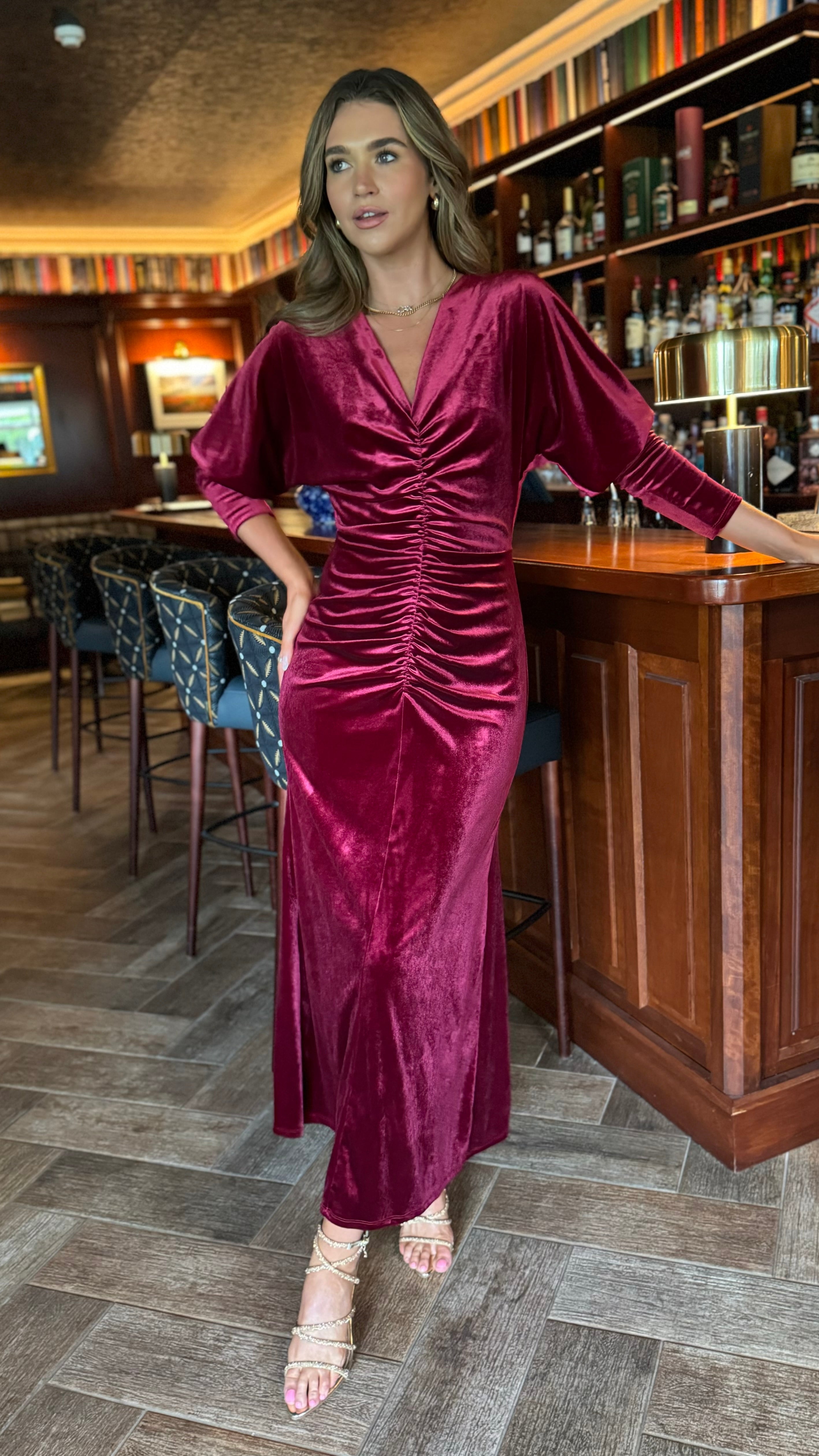 Get ready to turn heads in the Colleen Burgundy Velvet Ruched Midi Dress! With a v neckline and ruched detailing, this dress flatters your figure in all the right places. The wide to fitted style sleeves add a touch of playfulness to this elegant piece. Perfect for any special occasion! 🔥