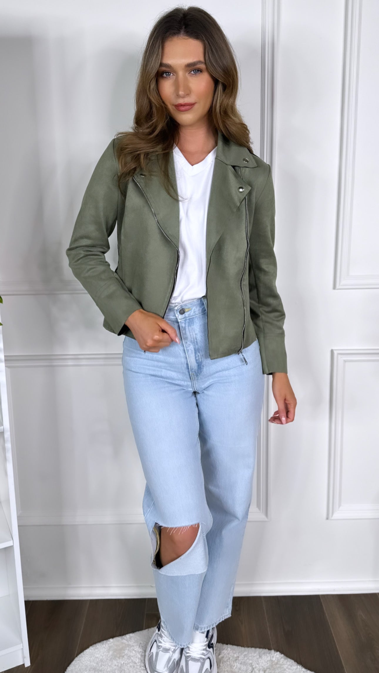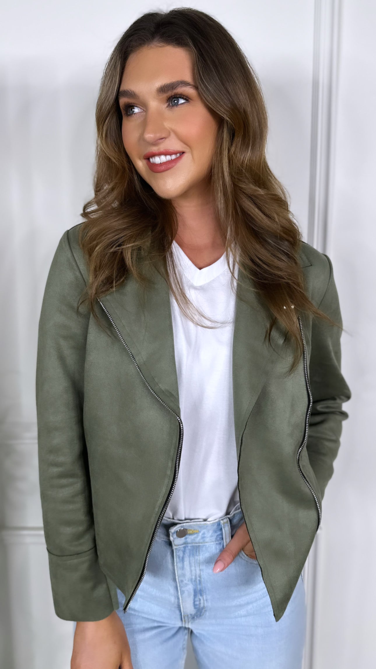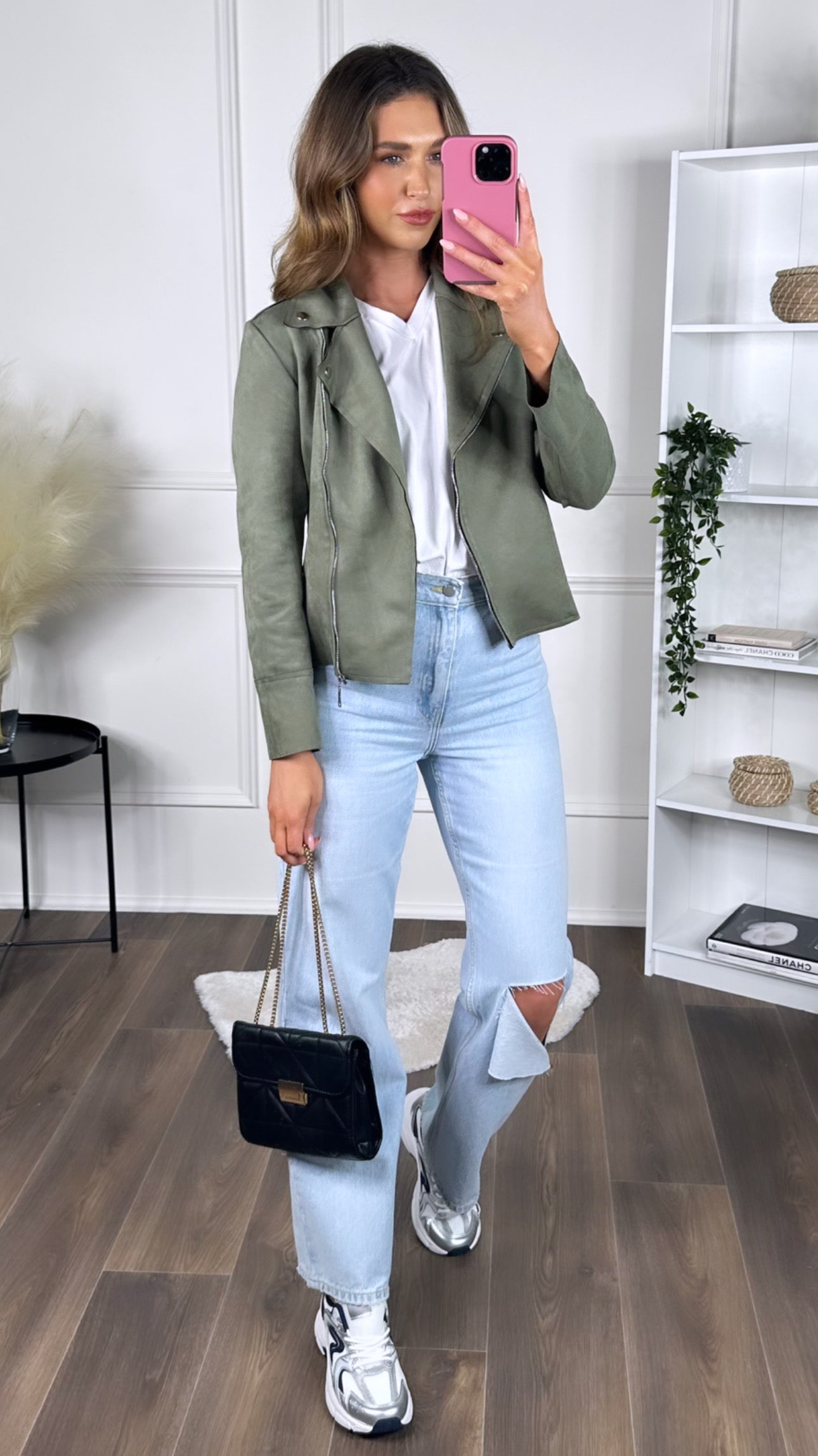 Zip up your style game with the Cora Khaki Suede Finish Collared Jacket! This fitted jacket features zip detailing for a touch of edge. Perfect for adding a playful twist to any outfit! 🧥💥