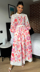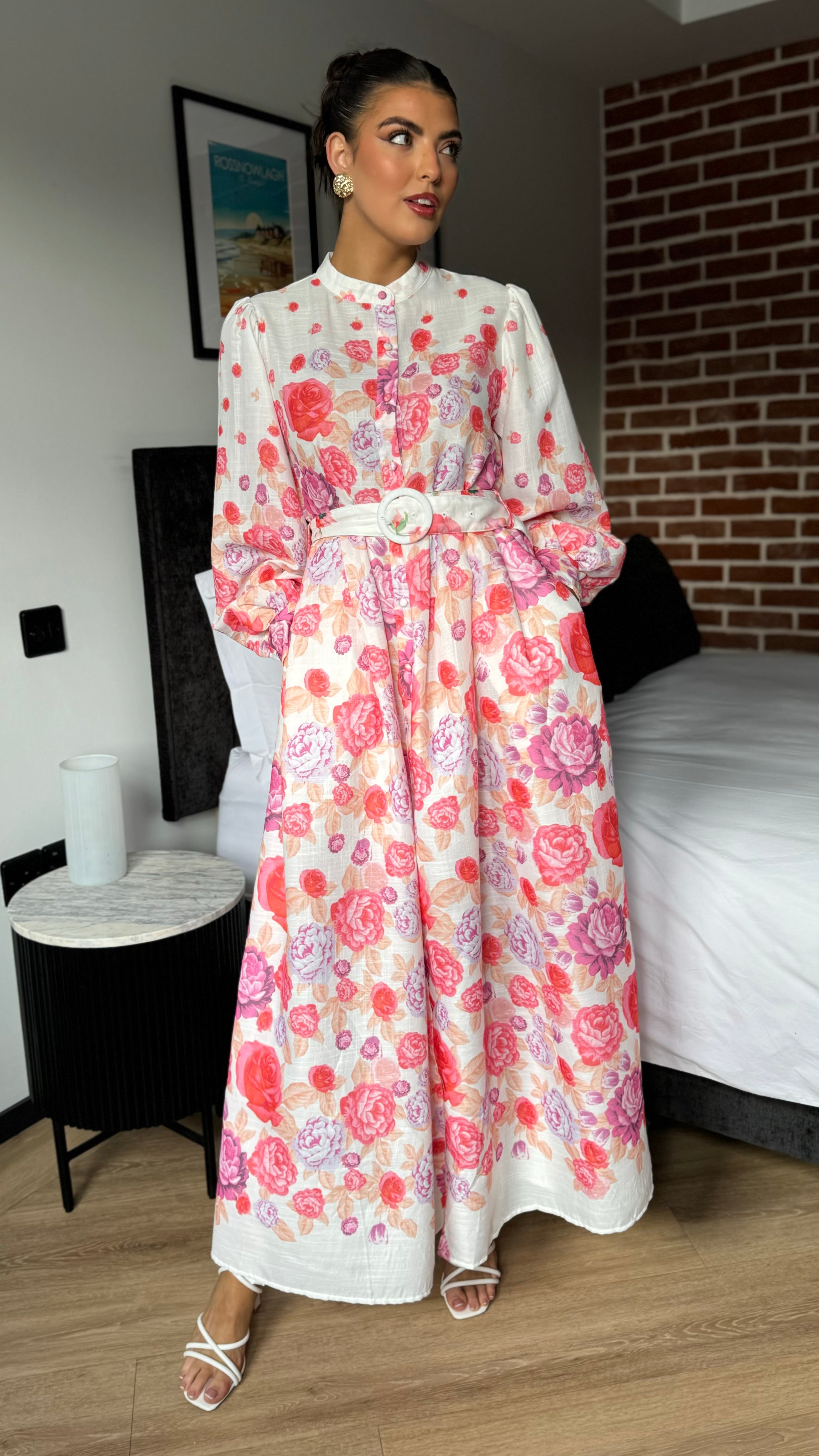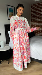 Slip into playful elegance with the Coraline Red & Purple Floral Printed Belted Midi Dress. This dress features a dazzling floral print, a covered button down design, and a high neck for a touch of sophistication. The belted waist cinches for a flattering silhouette, while the button detail cuffs add a charming finishing touch. Perfect for any occasion, this dress will have you feeling confident and stylish!
