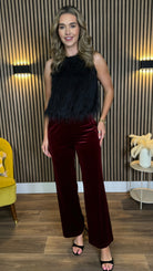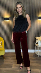 Elevate your wardrobe with these stunning Corey Burgundy Velvet Finish Straight Leg Trousers – the perfect blend of sophistication and sass. Featuring a flattering high-waisted cut that elongates your silhouette, these beauties boast a luxe velvet finish in rich burgundy that's absolutely irresistible. Practical dual fastening with button and zip keeps everything secure, while cleverly placed pockets mean you've got somewhere to stash your essentials. The straight leg silhouette offers timeless style, and the lined interior ensures comfort all day long.