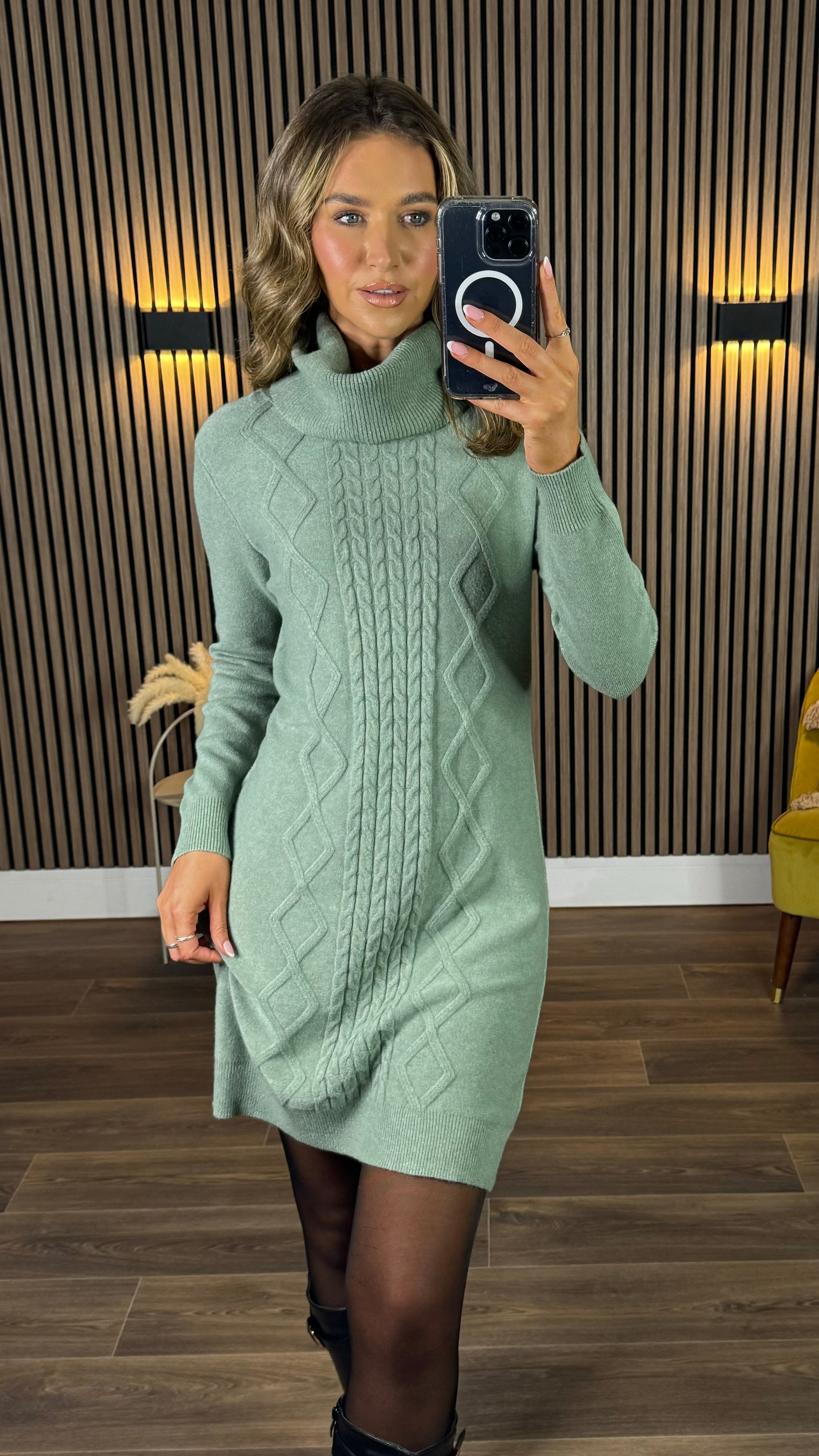 Croia Light Green Cable Knit Polo Neck Jumper Mini Dress