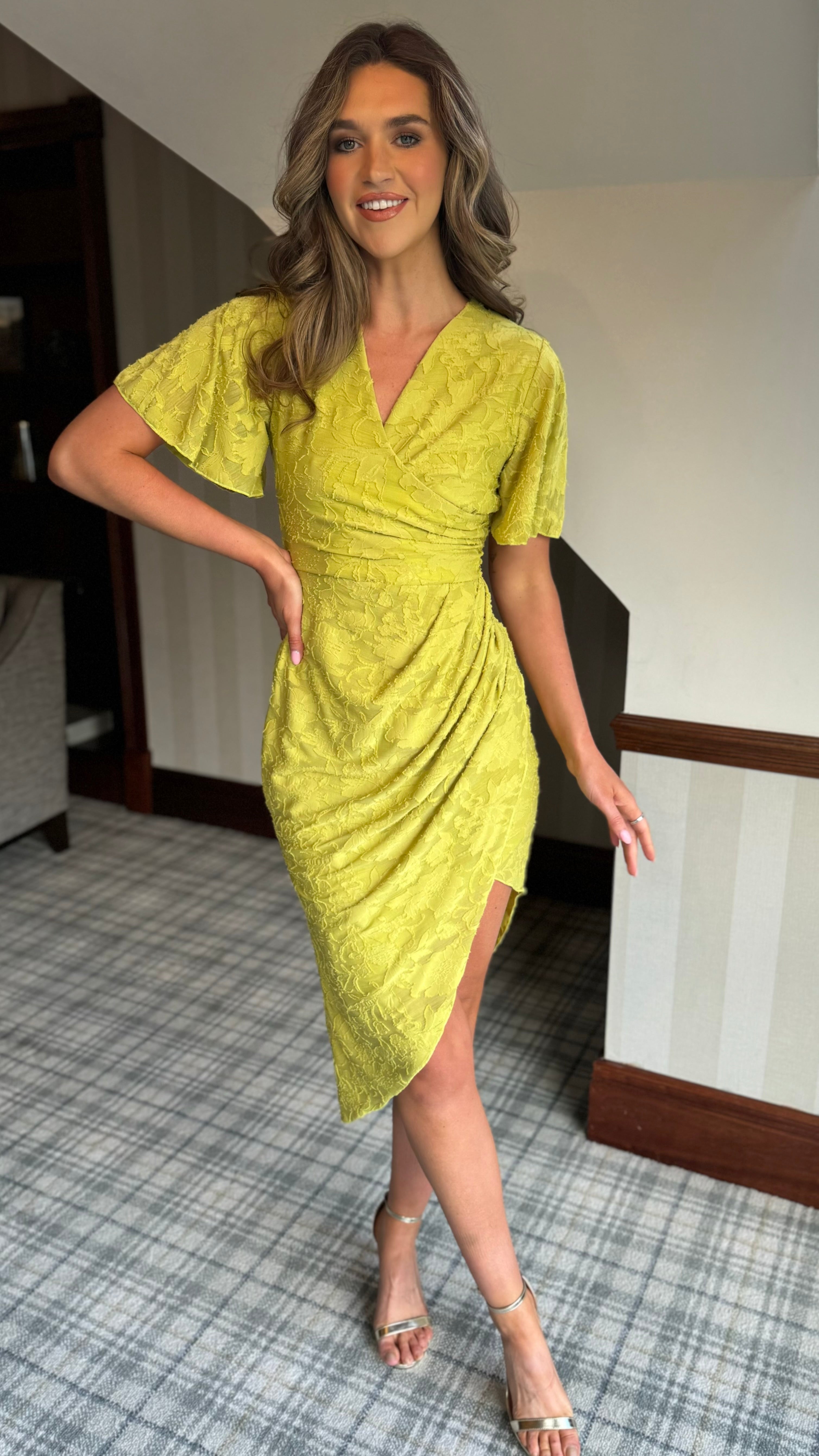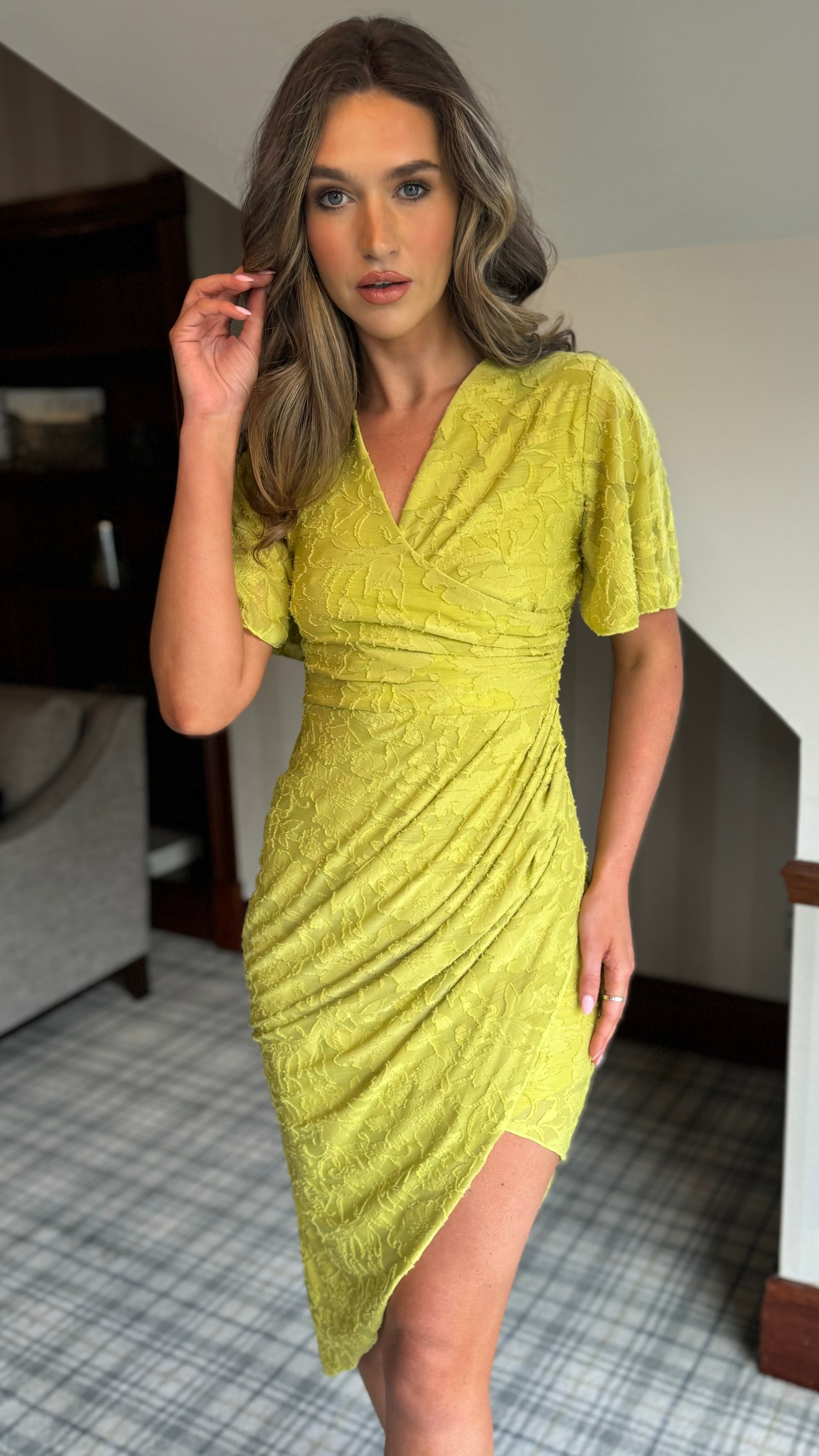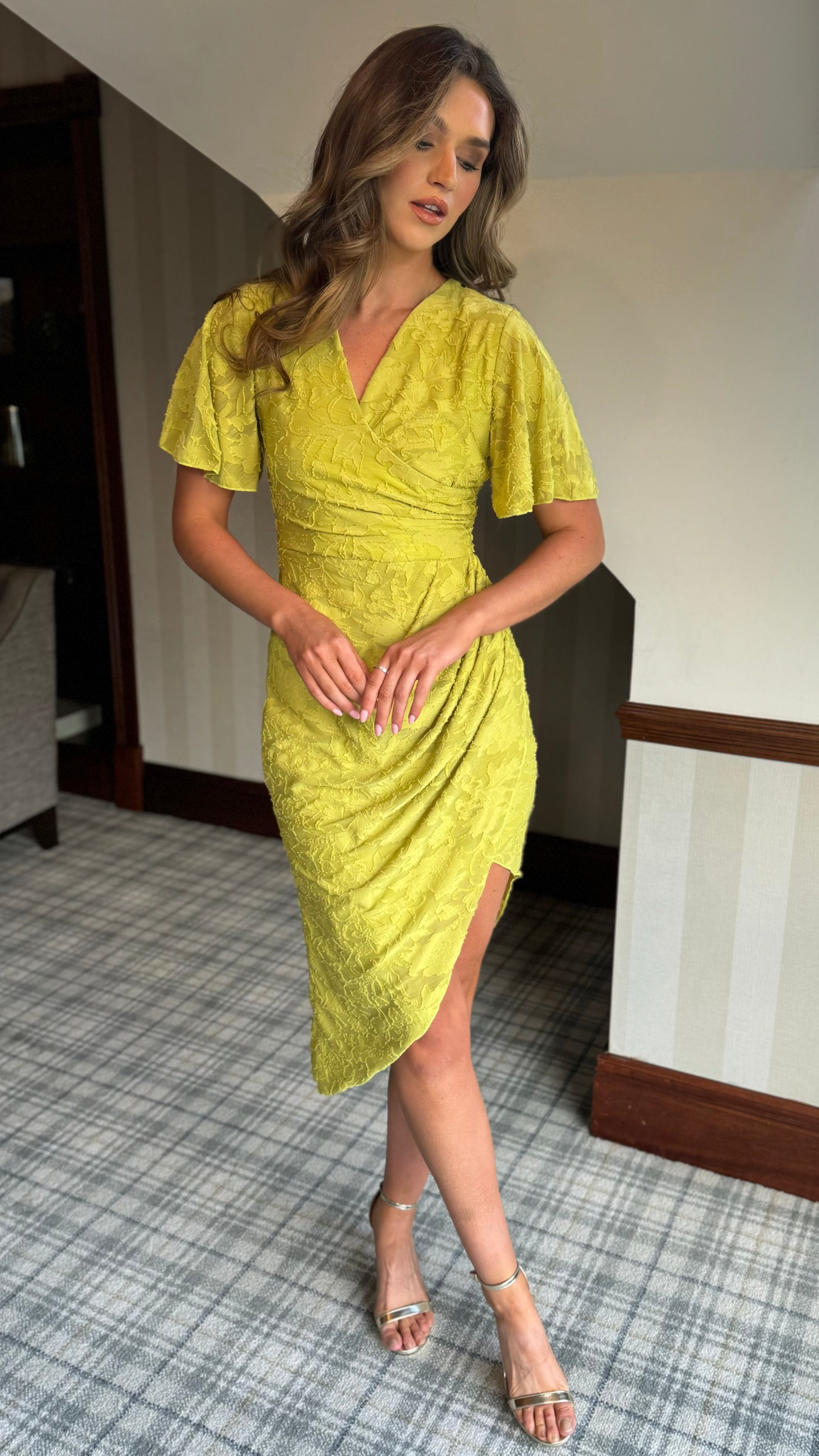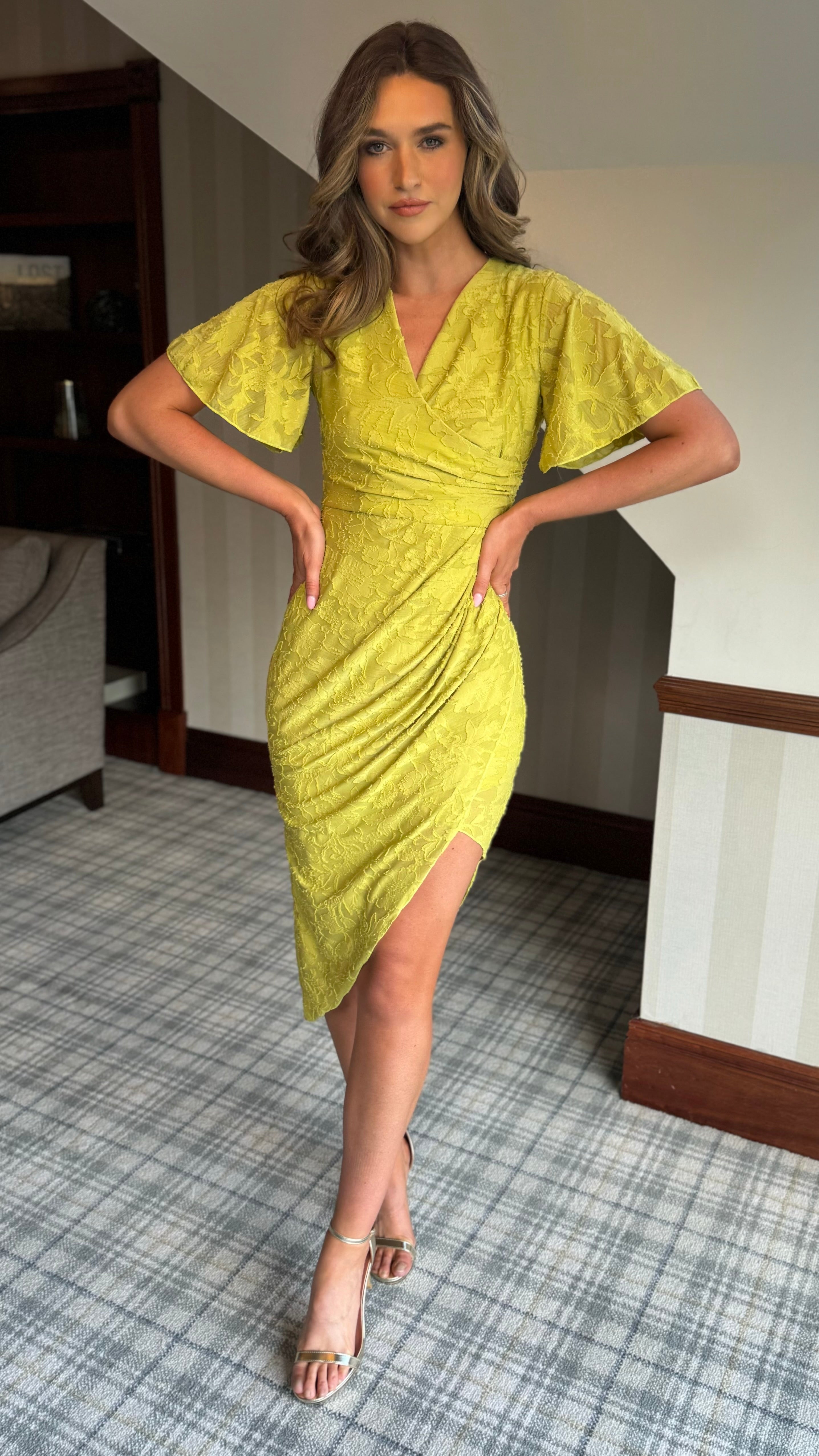 Cyprian Lime Green Angel Sleeve Wrap Midi Dress