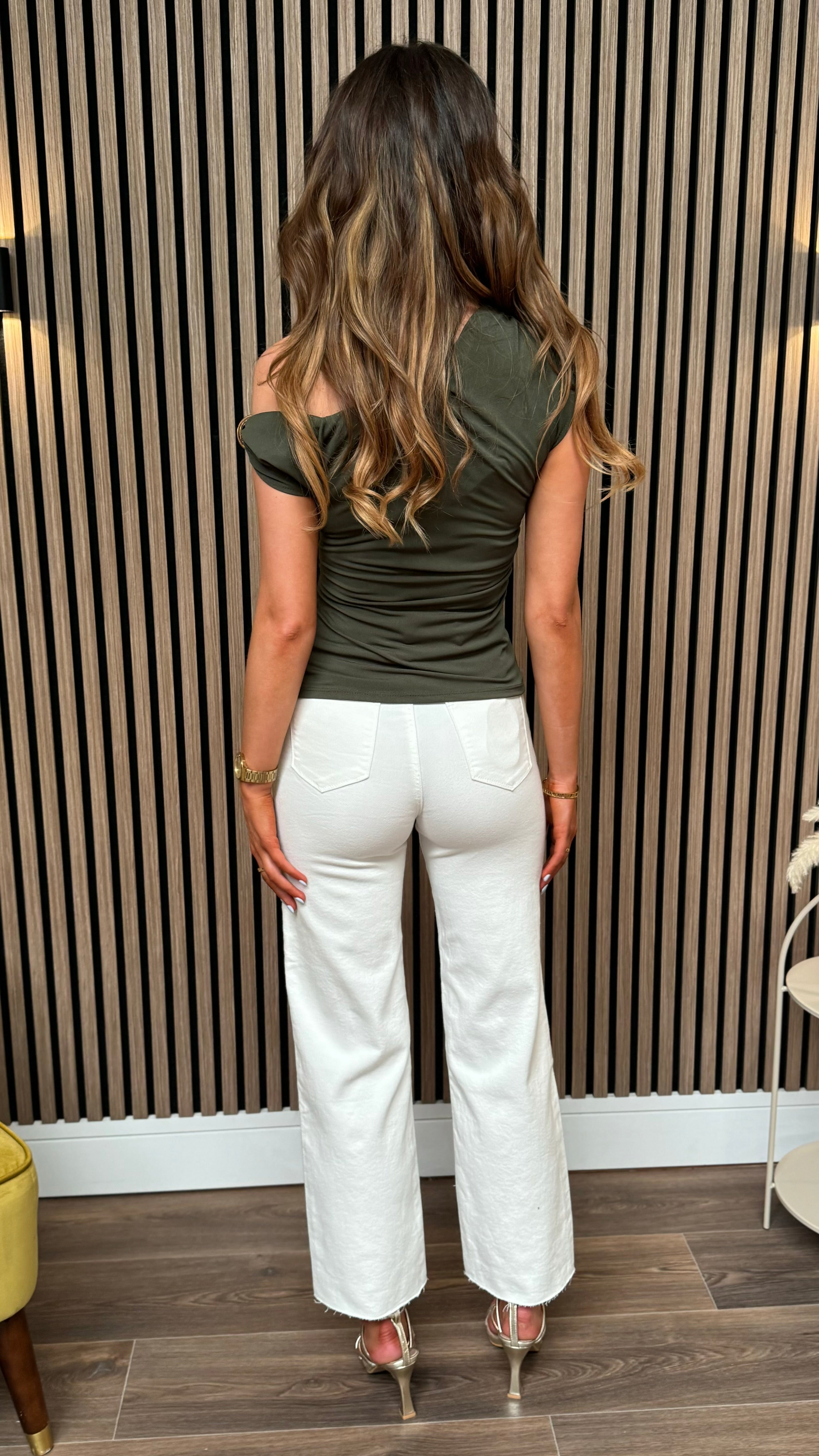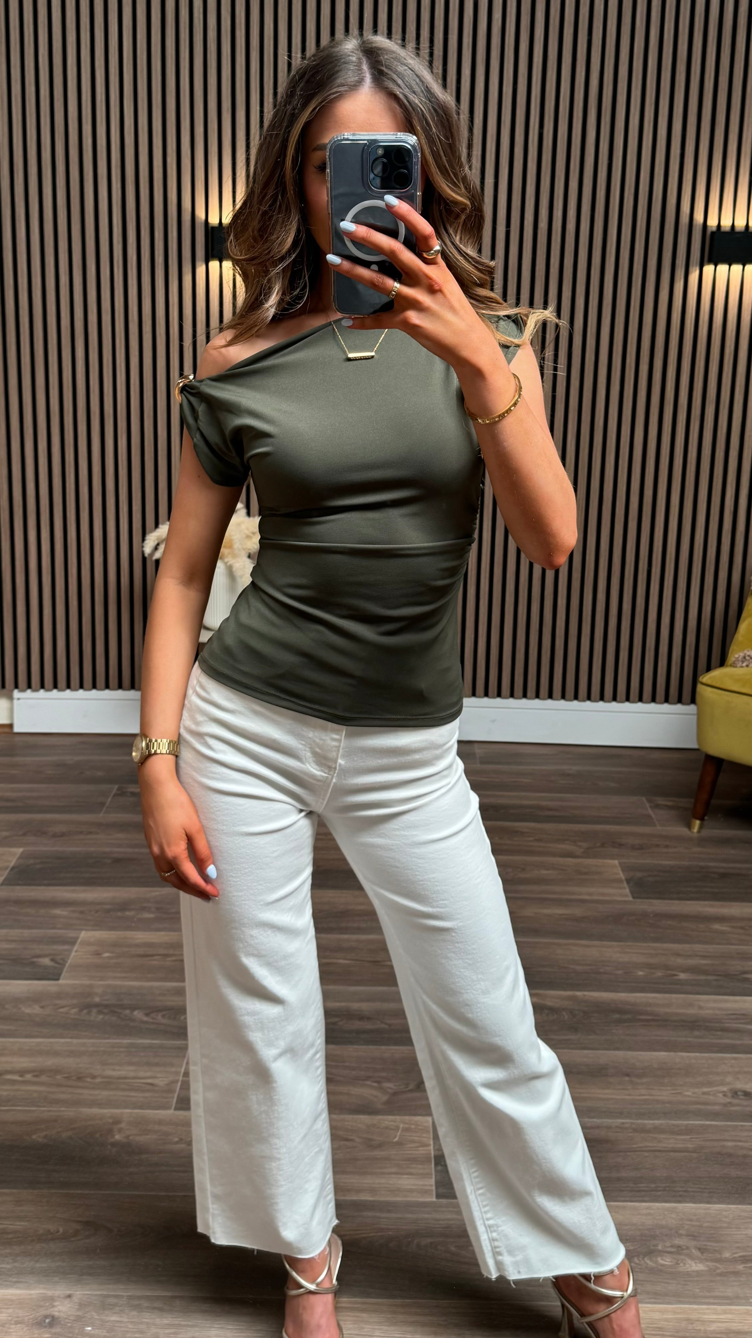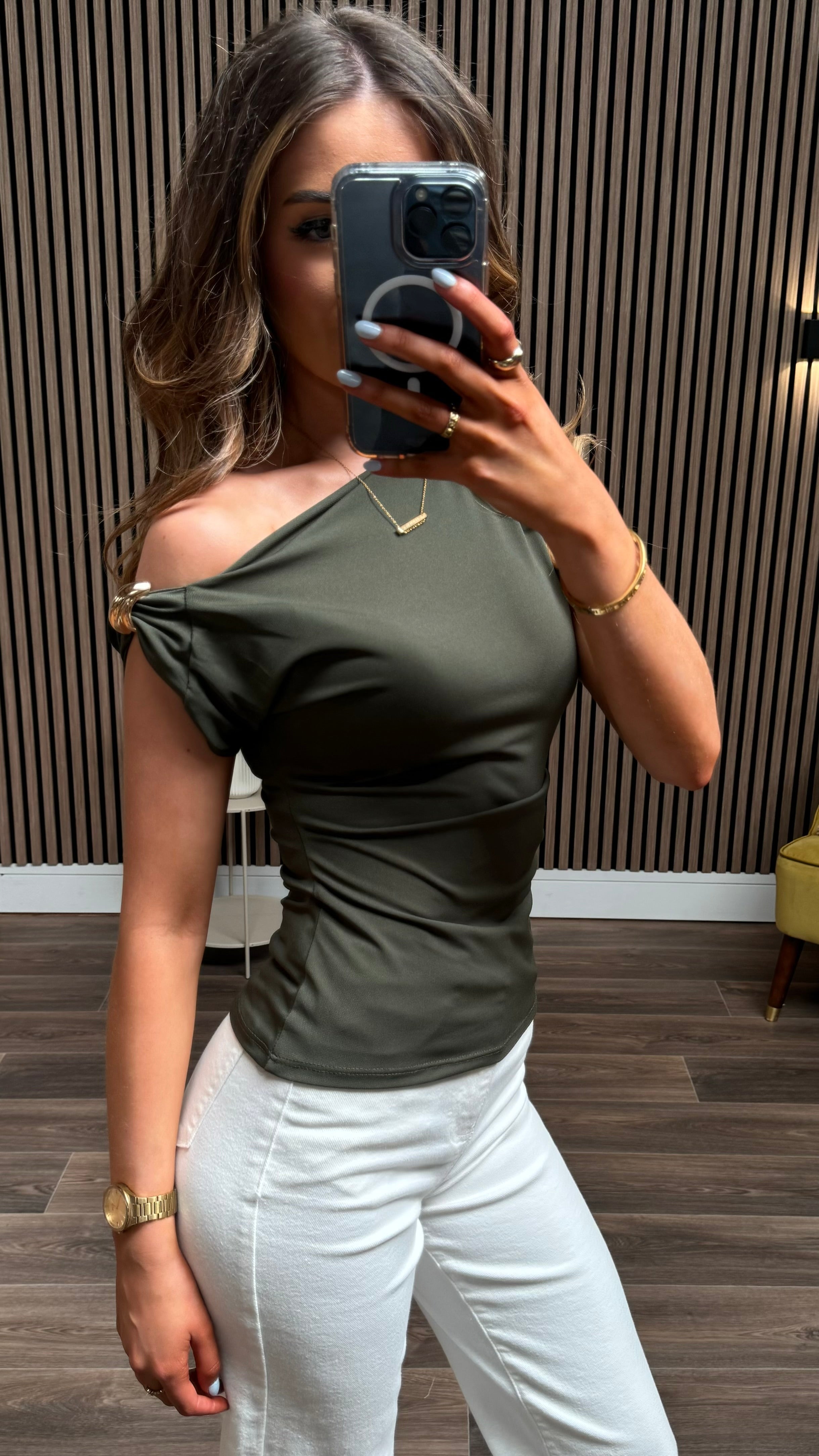 Sleeveless and ruched in the front, this top features a playful drape neck and bold gold hardware on the shoulders. All in classic khaki.