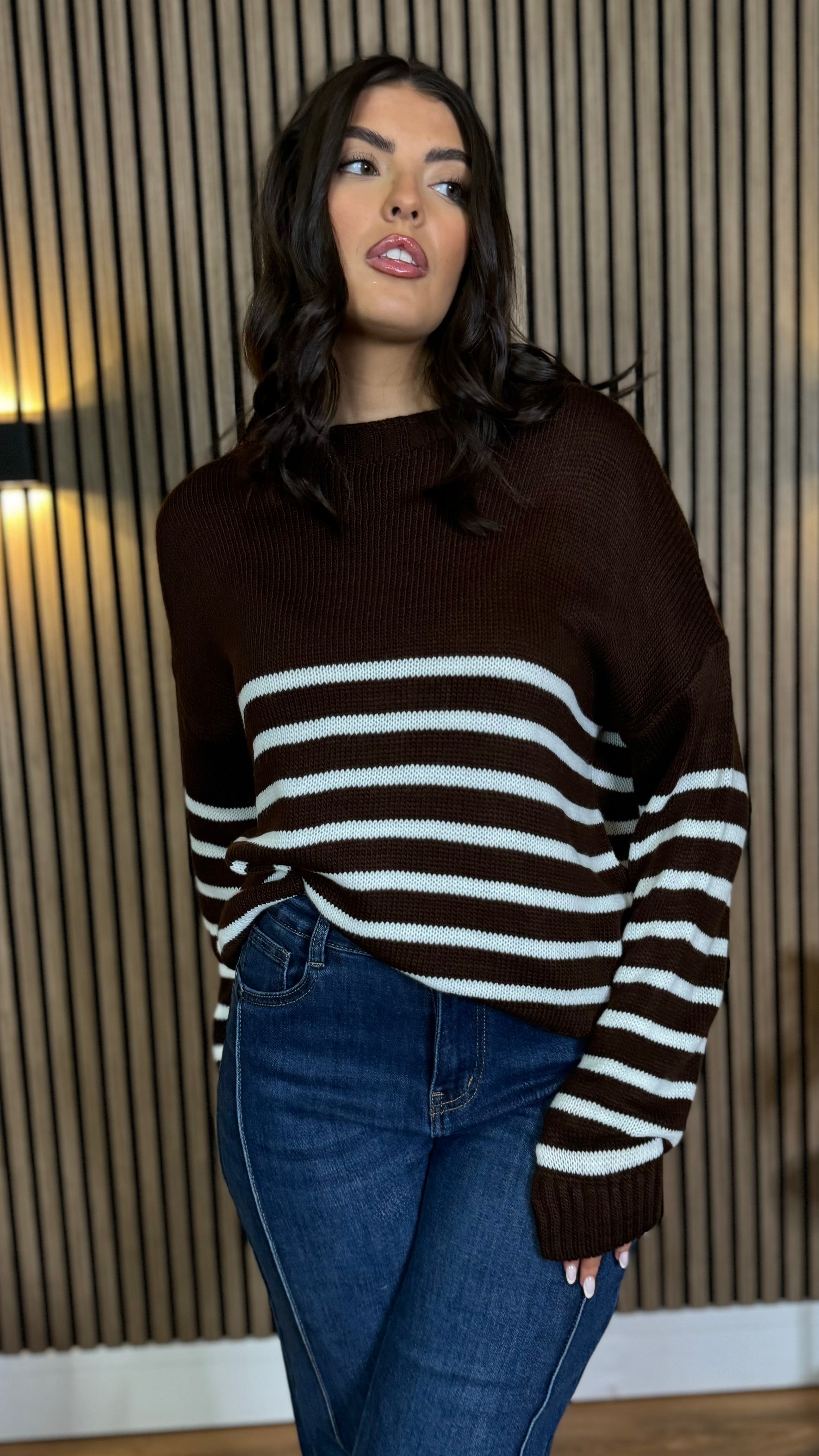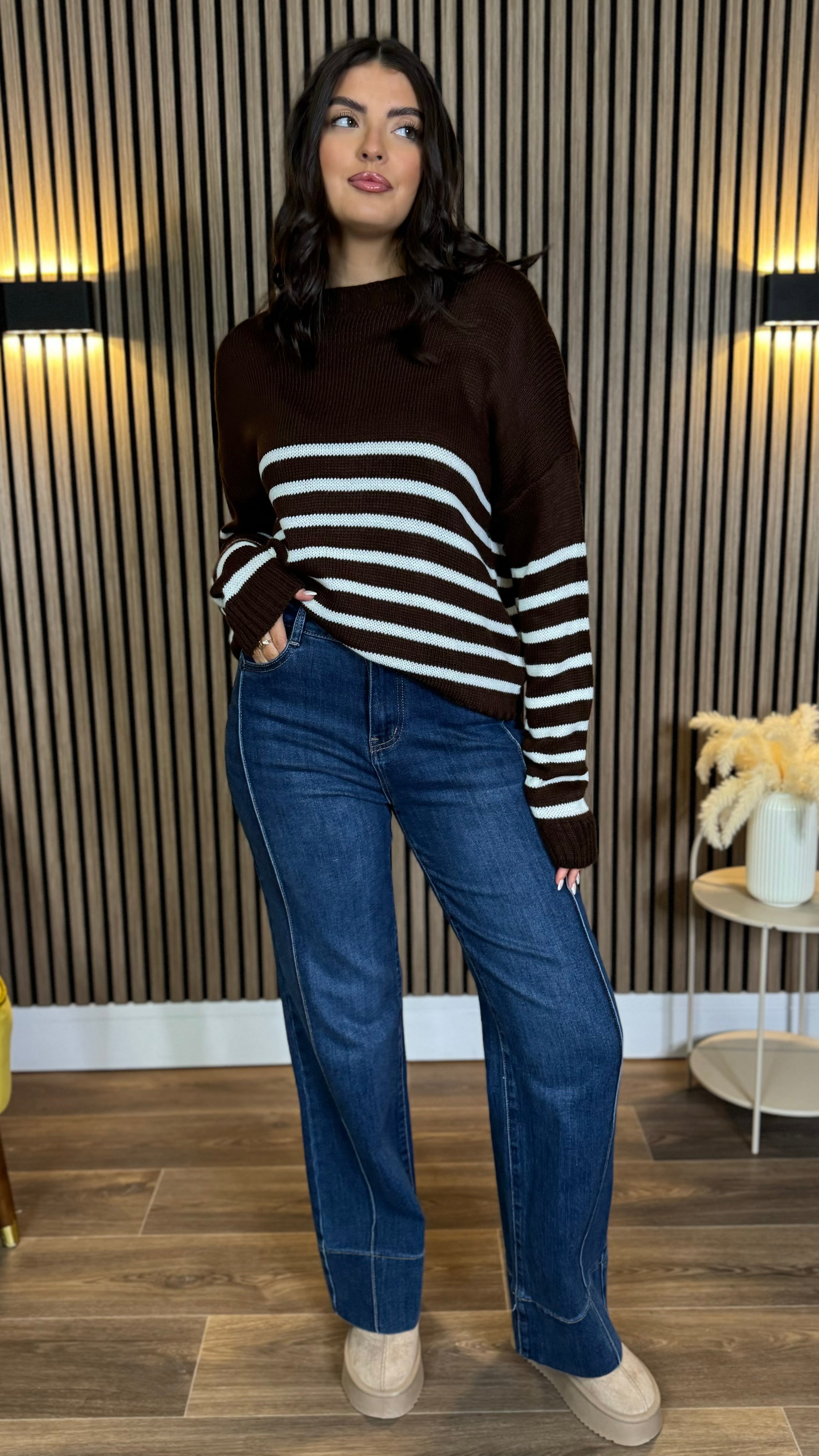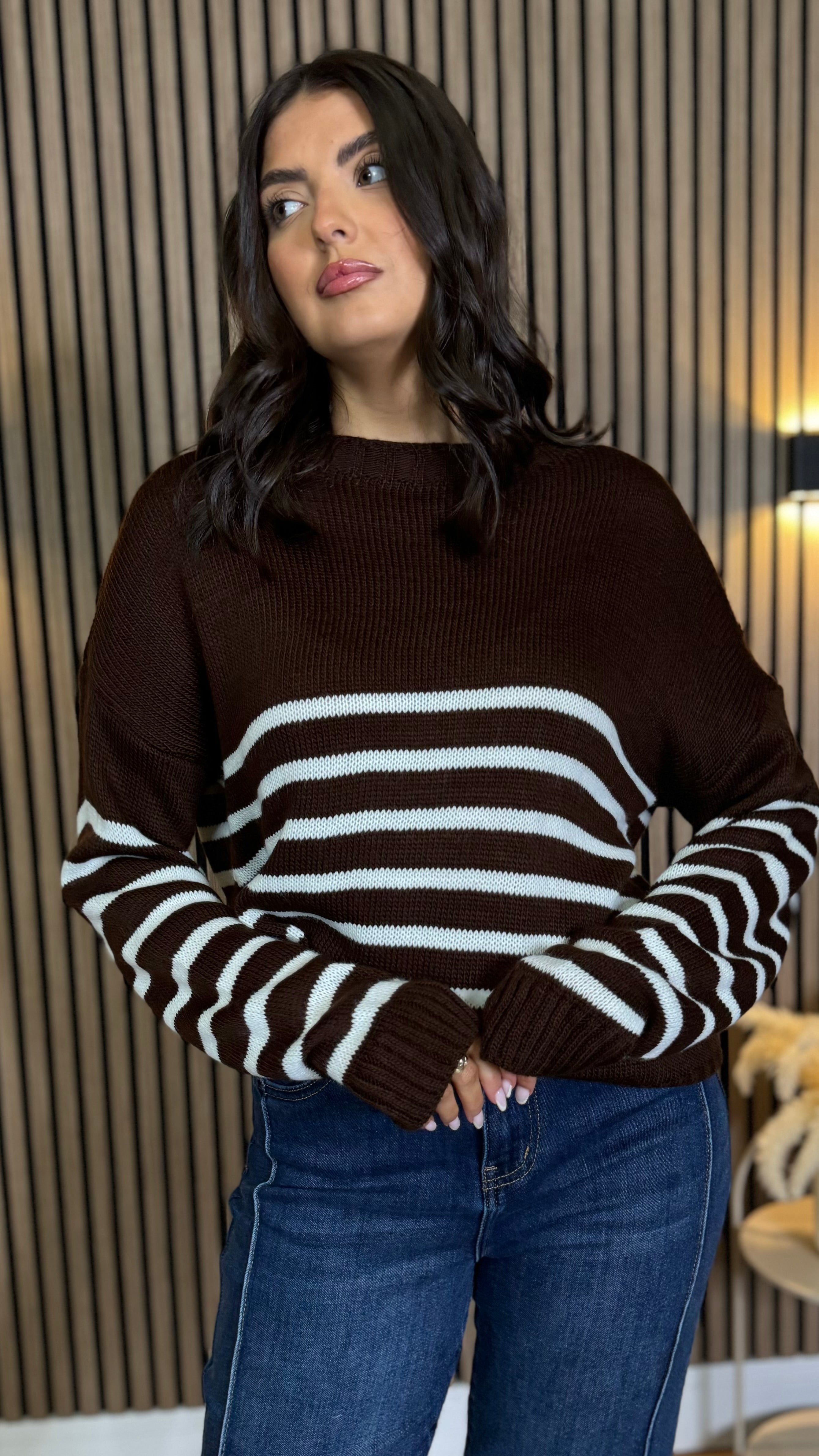 Stripes never go out of style, and this Dallas jumper proves it! Featuring a classic brown and white striped design, it's the kind of piece that works with everything in your wardrobe. The round neckline keeps things simple and chic, while ribbed cuffs and hem lock in warmth and shape. Crafted from soft, cosy fabric that feels as good as it looks, plus a practical side split for easy movement. Your new go-to layer awaits!