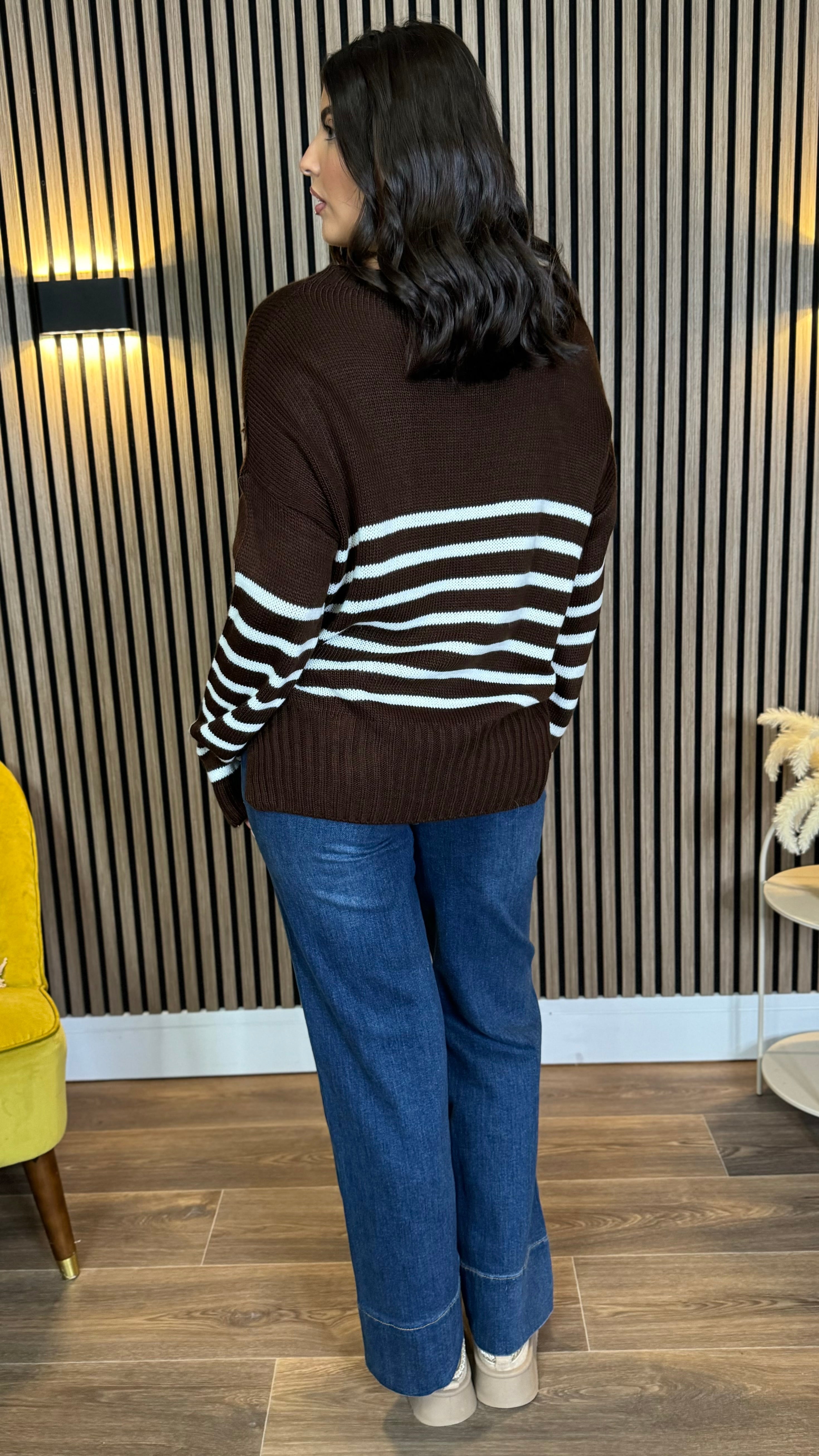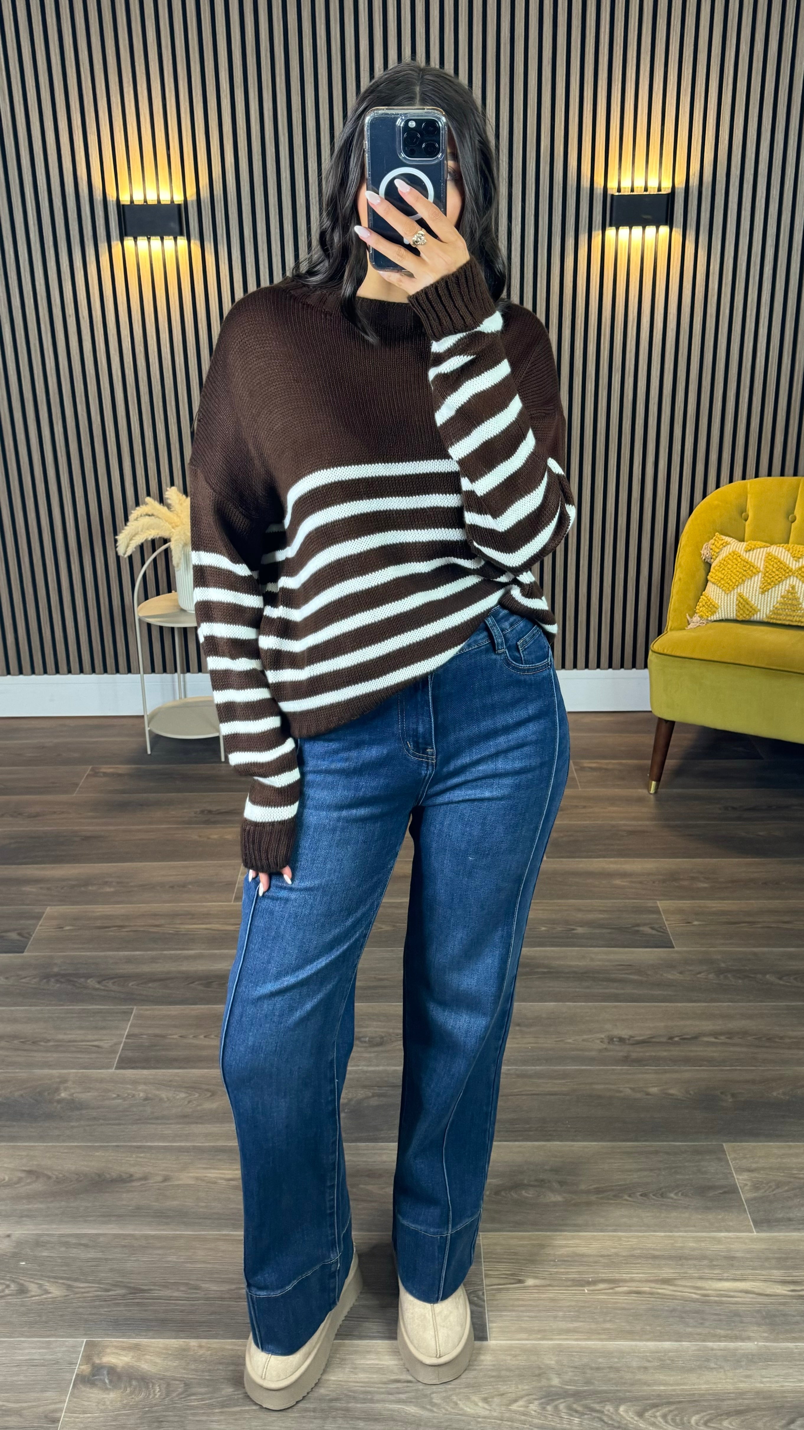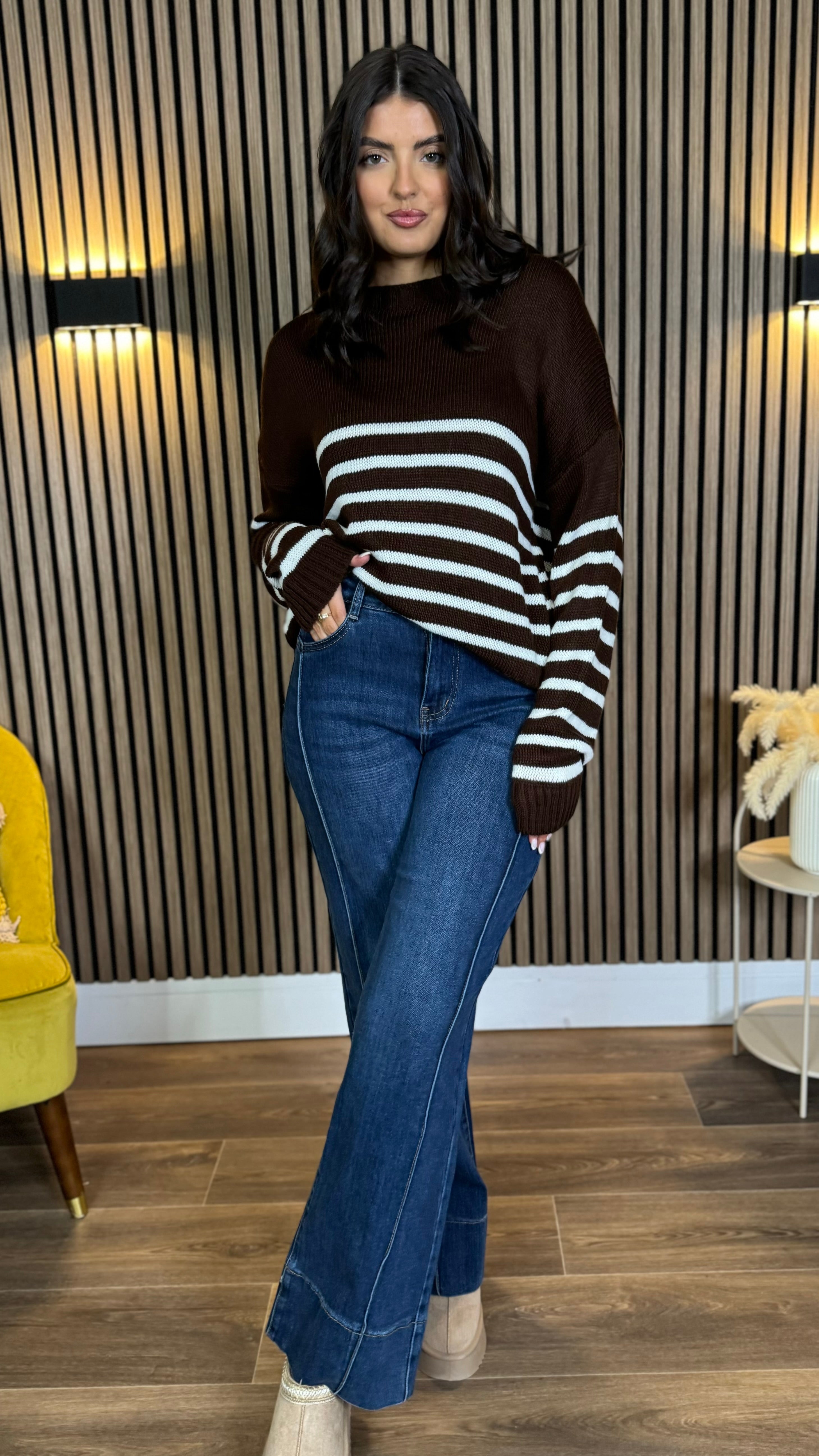 Stripes never go out of style, and this Dallas jumper proves it! Featuring a classic brown and white striped design, it's the kind of piece that works with everything in your wardrobe. The round neckline keeps things simple and chic, while ribbed cuffs and hem lock in warmth and shape. Crafted from soft, cosy fabric that feels as good as it looks, plus a practical side split for easy movement. Your new go-to layer awaits!