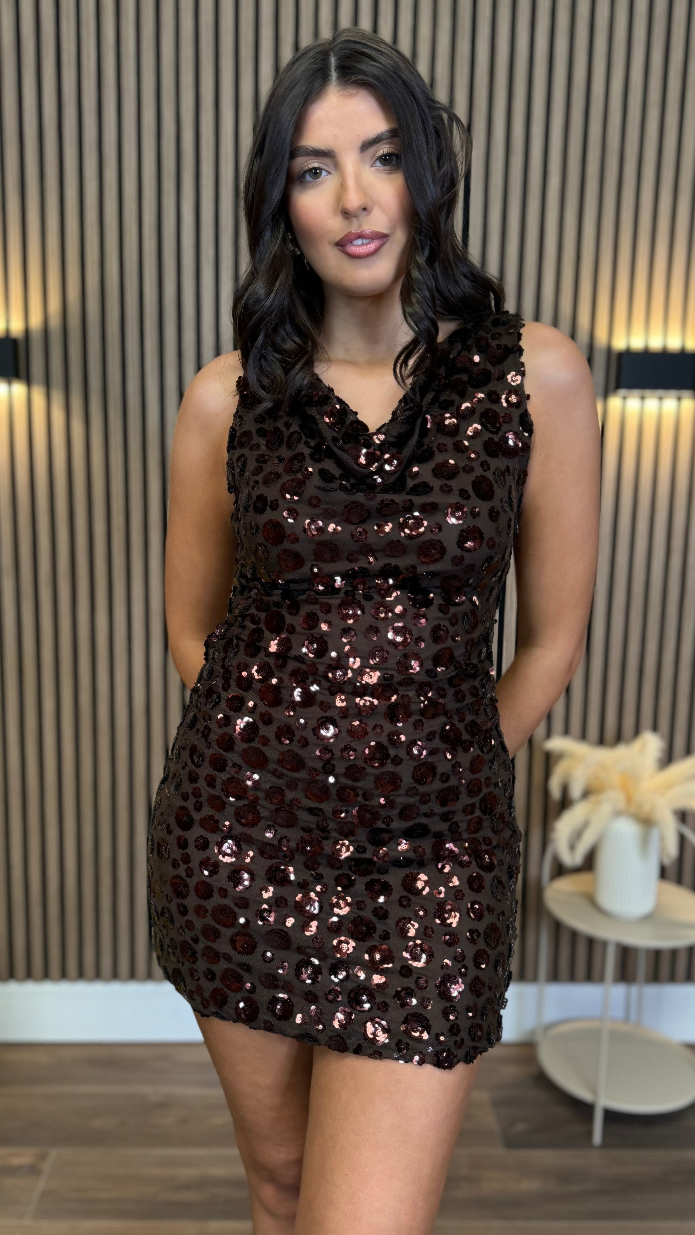 Darla Chocolate Brown Sequin Cowl Neck Mini Dress