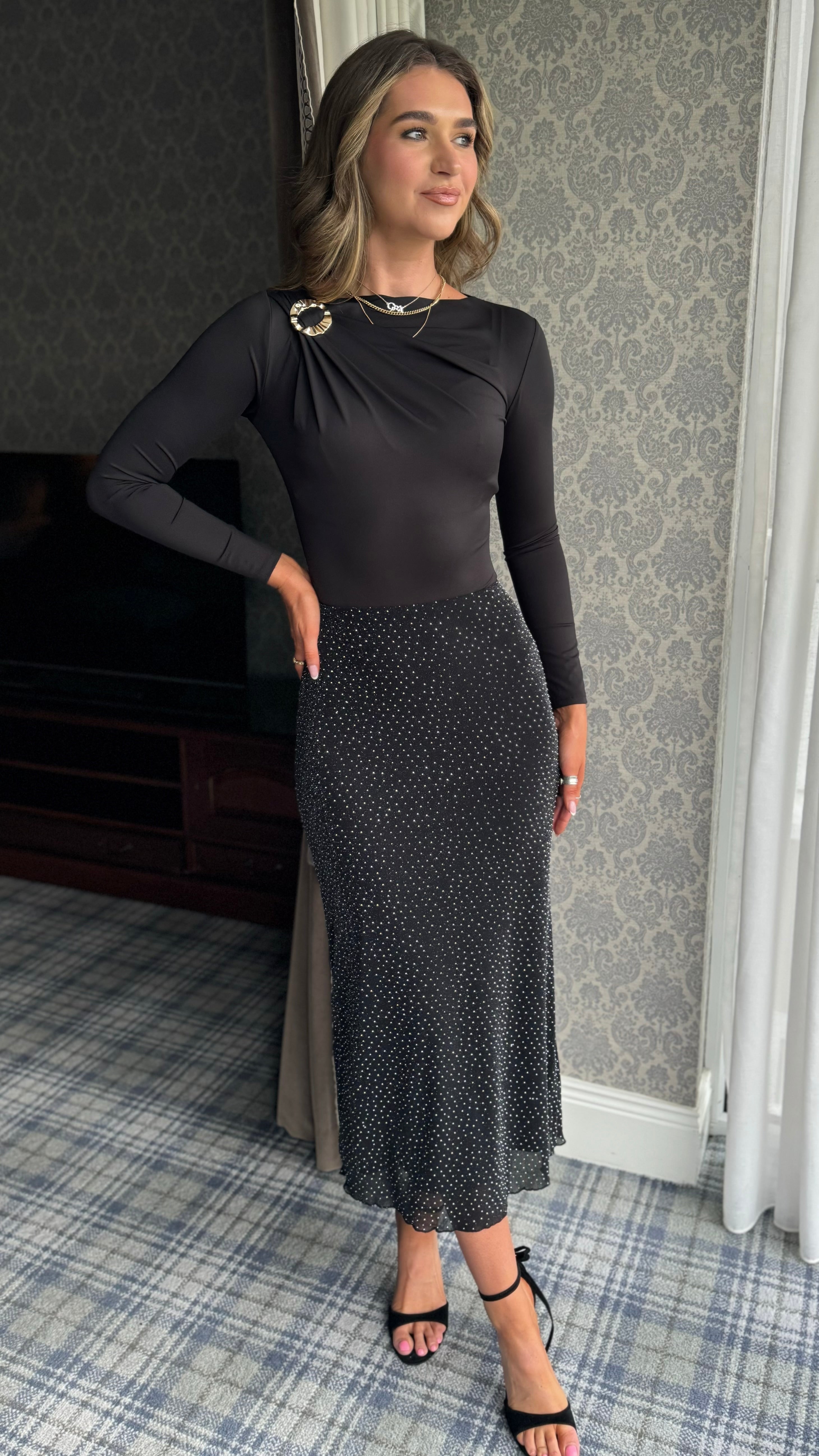 Embrace chic comfort with the Deedee Black Bodysuit, featuring charming ruched detail and a soft, slinky fabric that moves with you. Long sleeves add a touch of elegance, while the playful gold buckle clasp fastening brings just the right amount of sparkle to your look.
