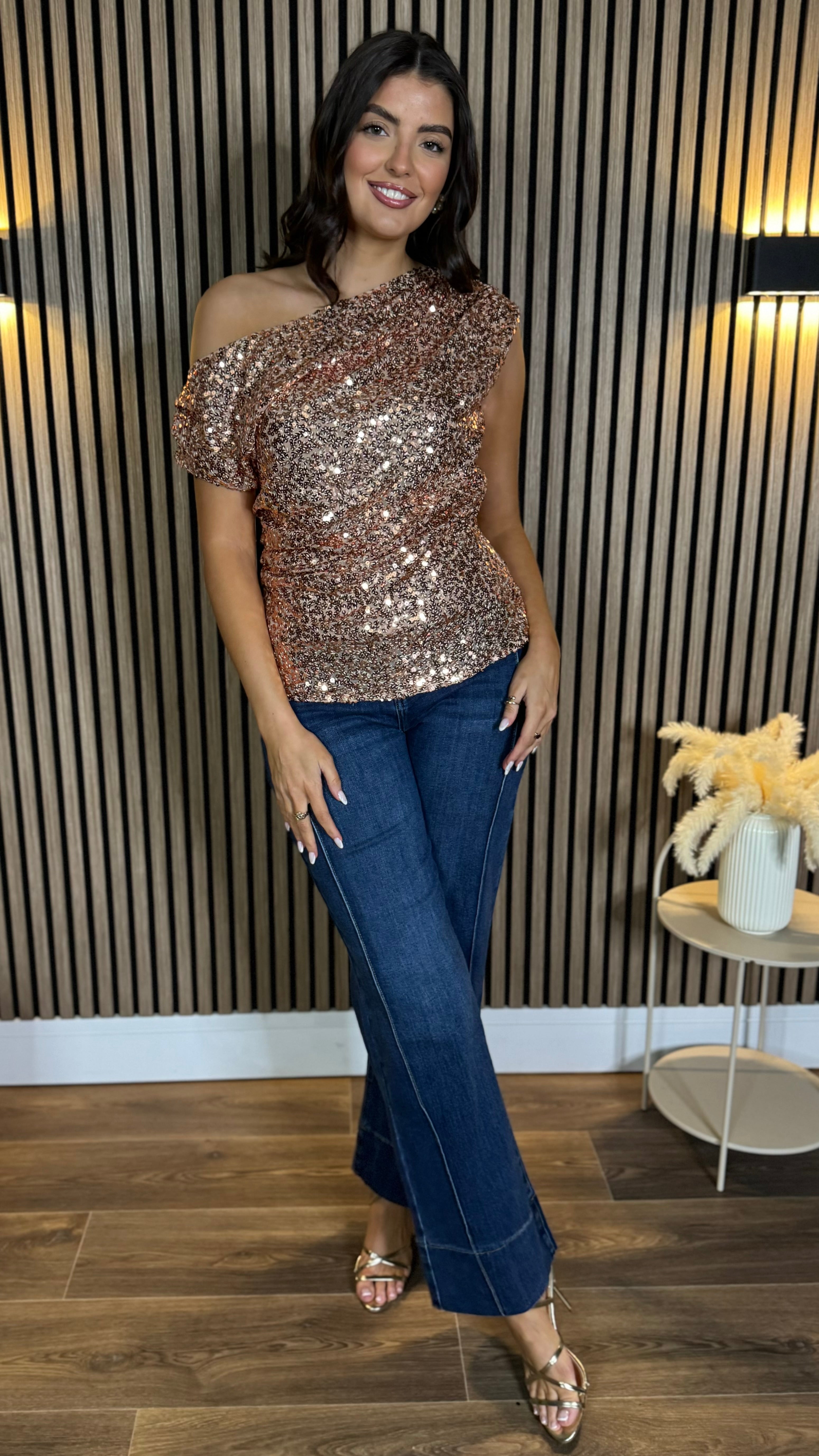Slip into pure sparkle with the Destiny Gold Sequin Asymmetric Top. This show-stopping piece features eye-catching sequins that catch the light from every angle, paired with an edgy asymmetric shoulder design for modern flair. The flattering ruched side detail creates a sculpted silhouette, while a concealed zip fastening keeps things sleek and seamless. Perfect for nights when you want to shine brighter than the disco ball.