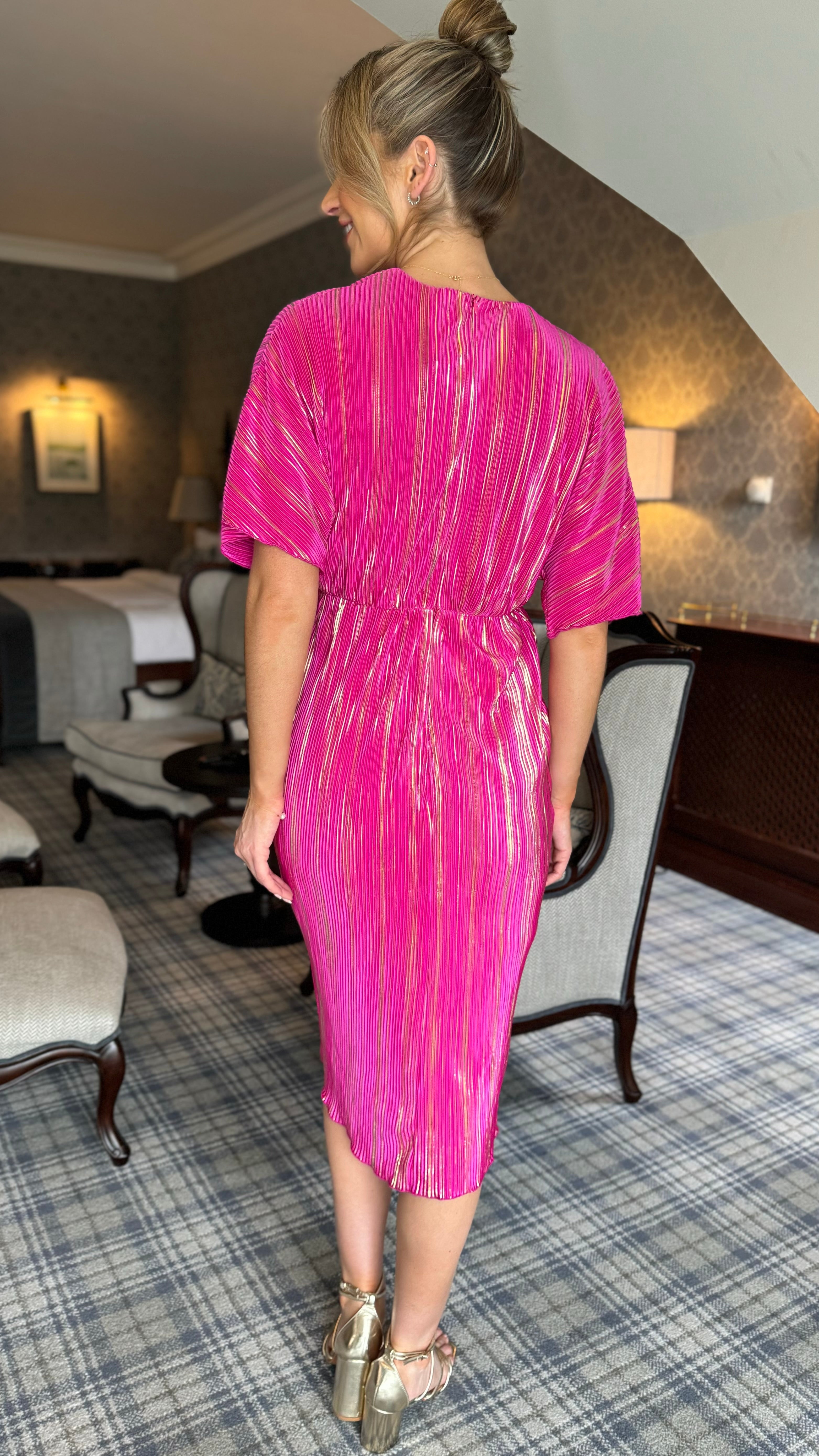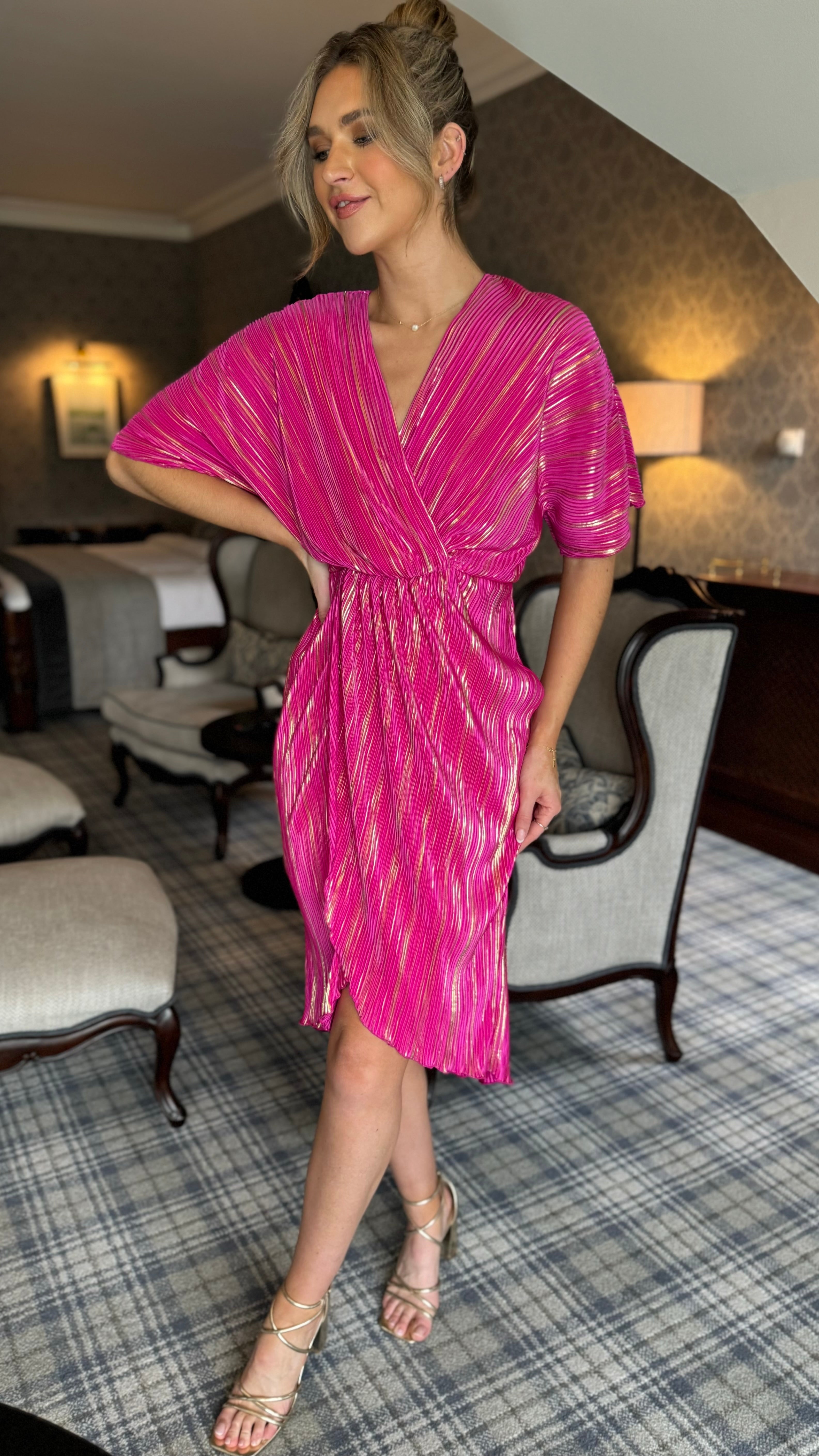 Get event ready in the Fabulous Dionne Half Sleeve Midi Dress! The striking gold foil plisse material adds a touch of glamour while the wrap detailing flatters your figure. Pair with gold accessories for the ultimate show-stopping look! ✨🌟