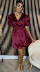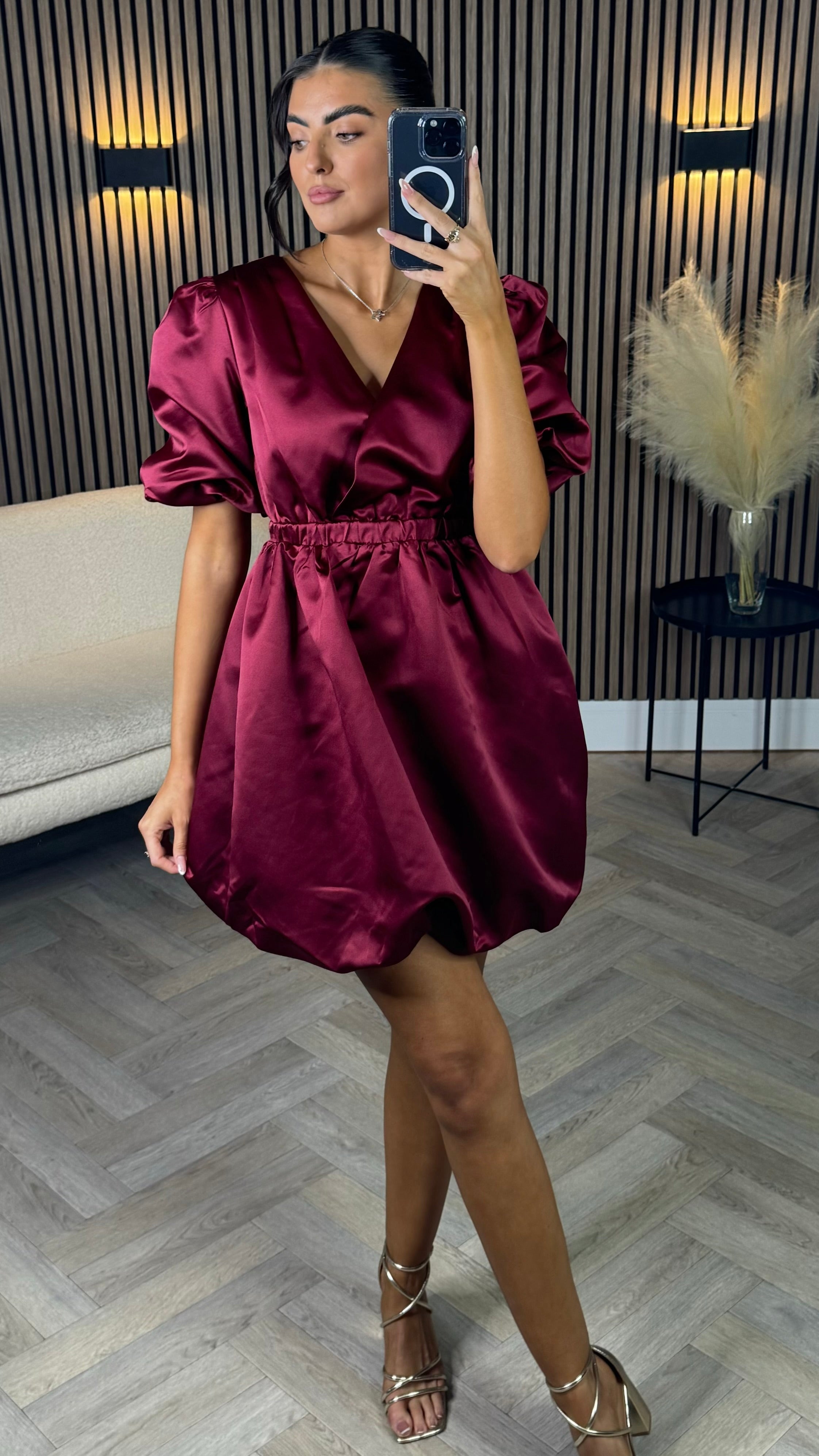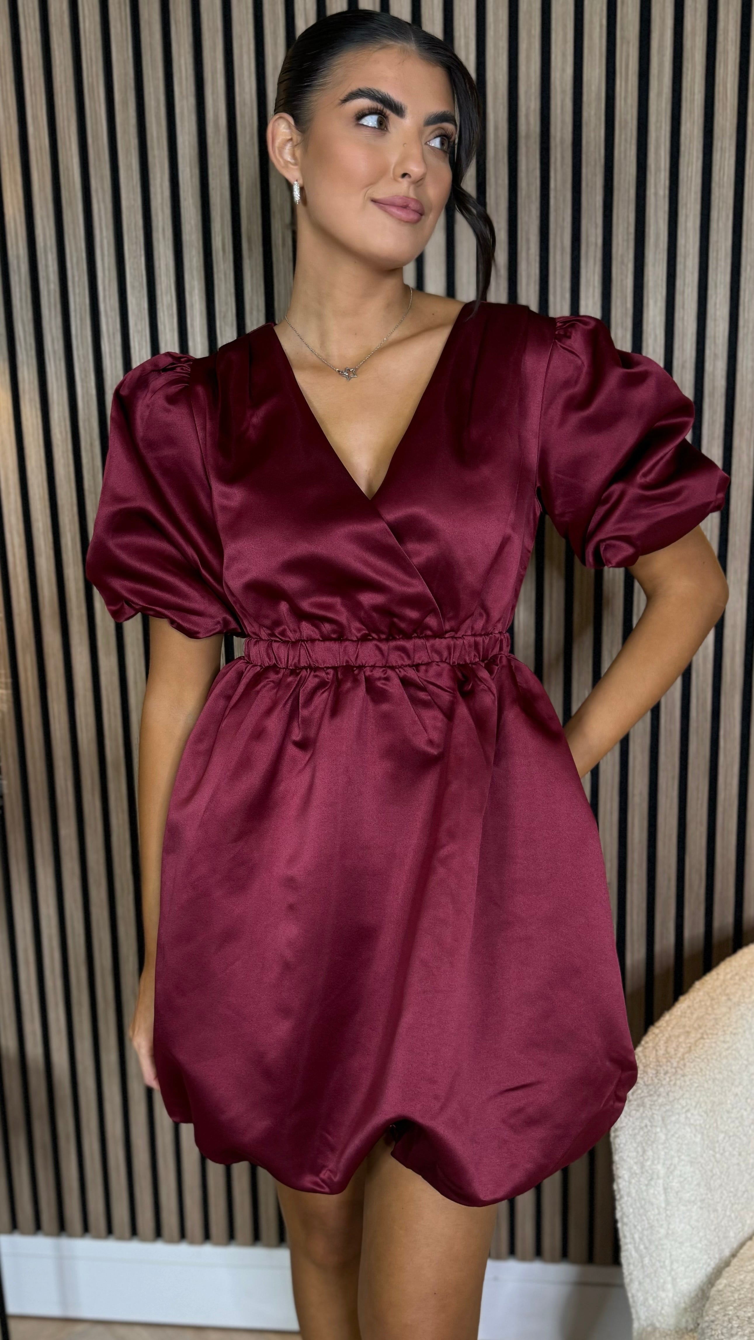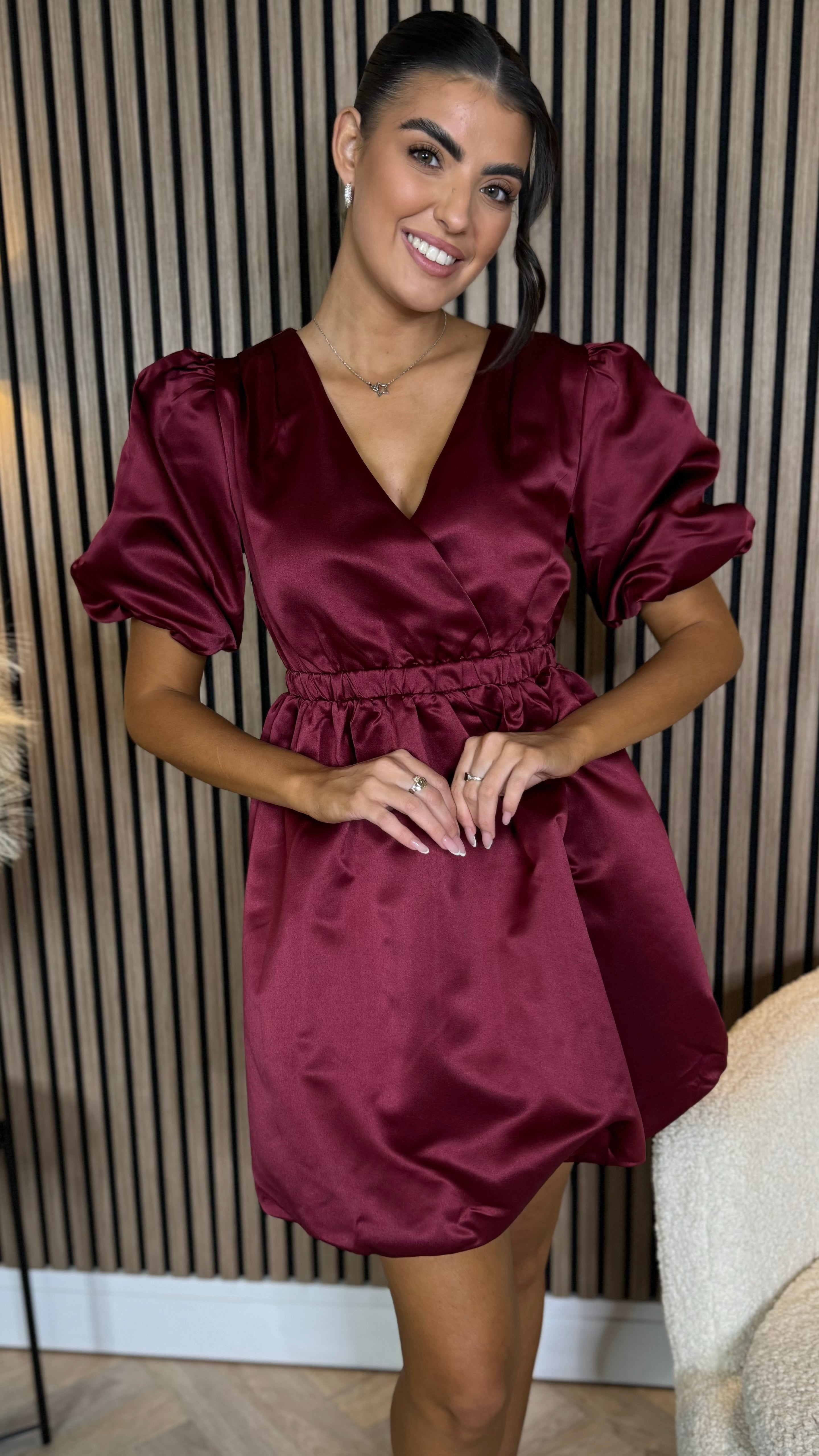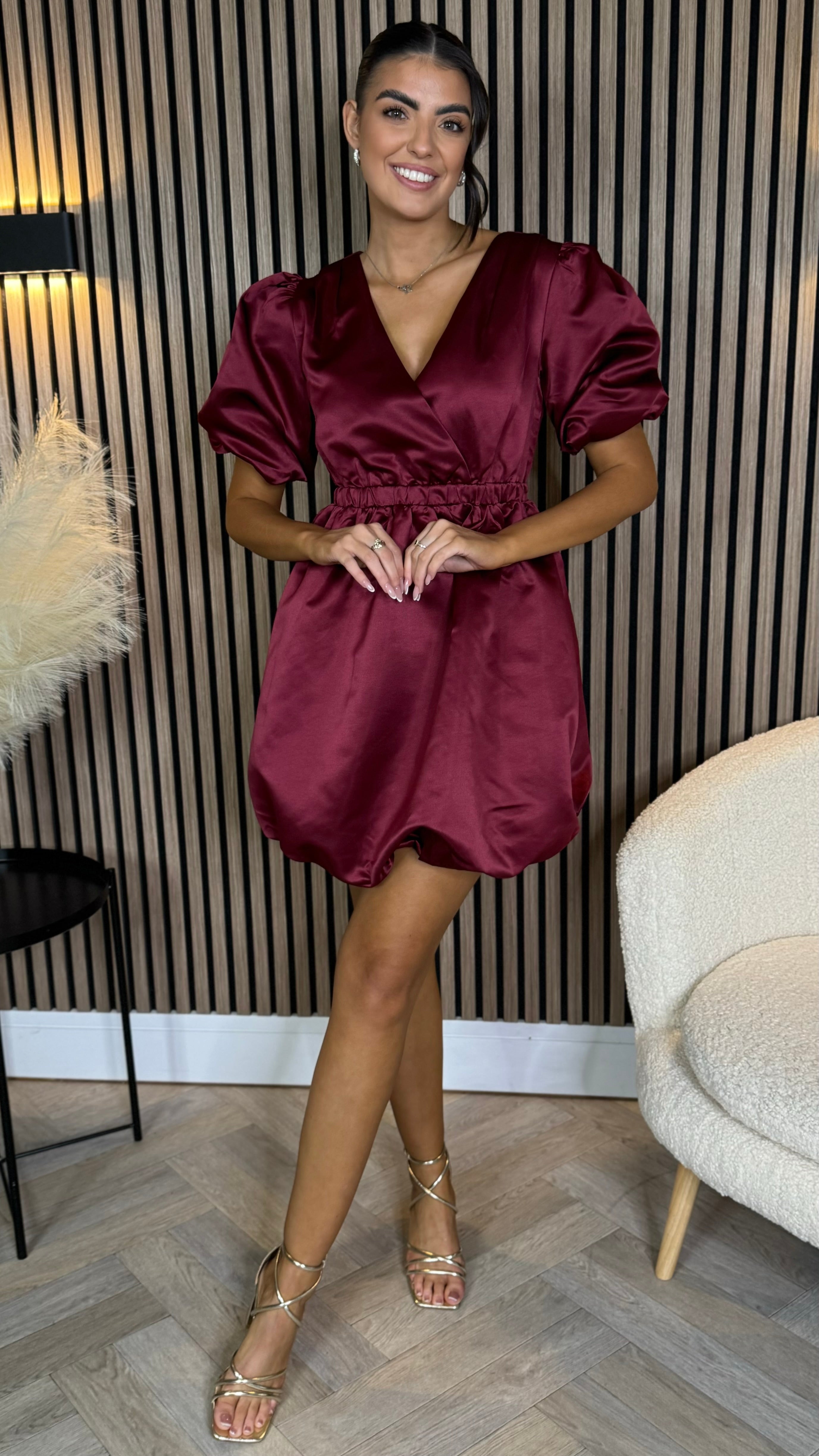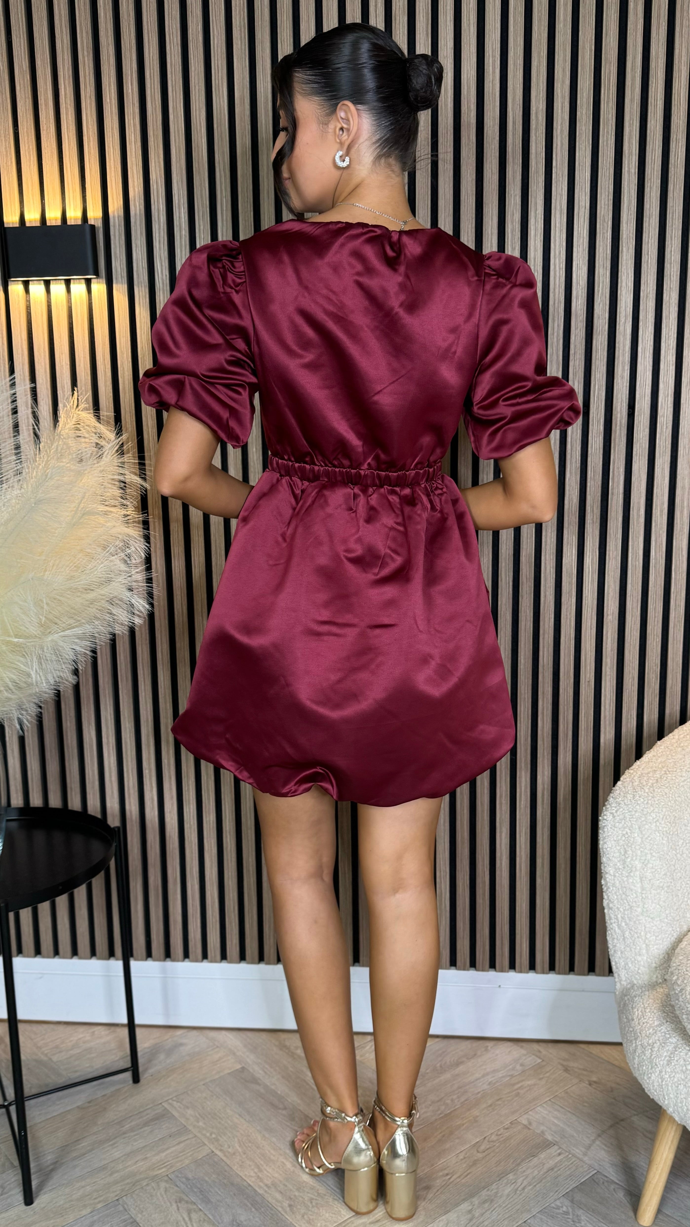 Simona Cherry Red Puff Sleeve Sateen Mini Dress