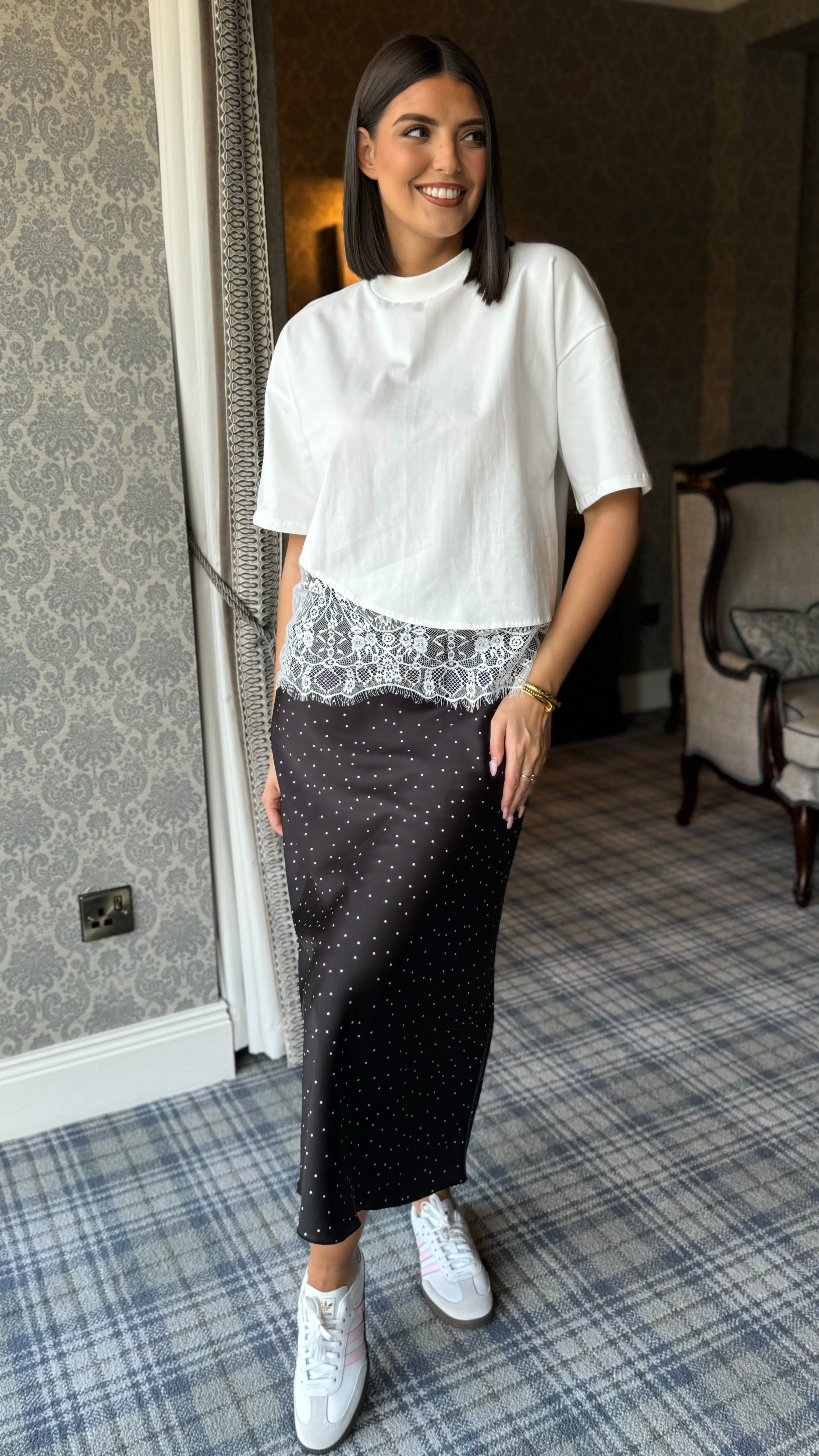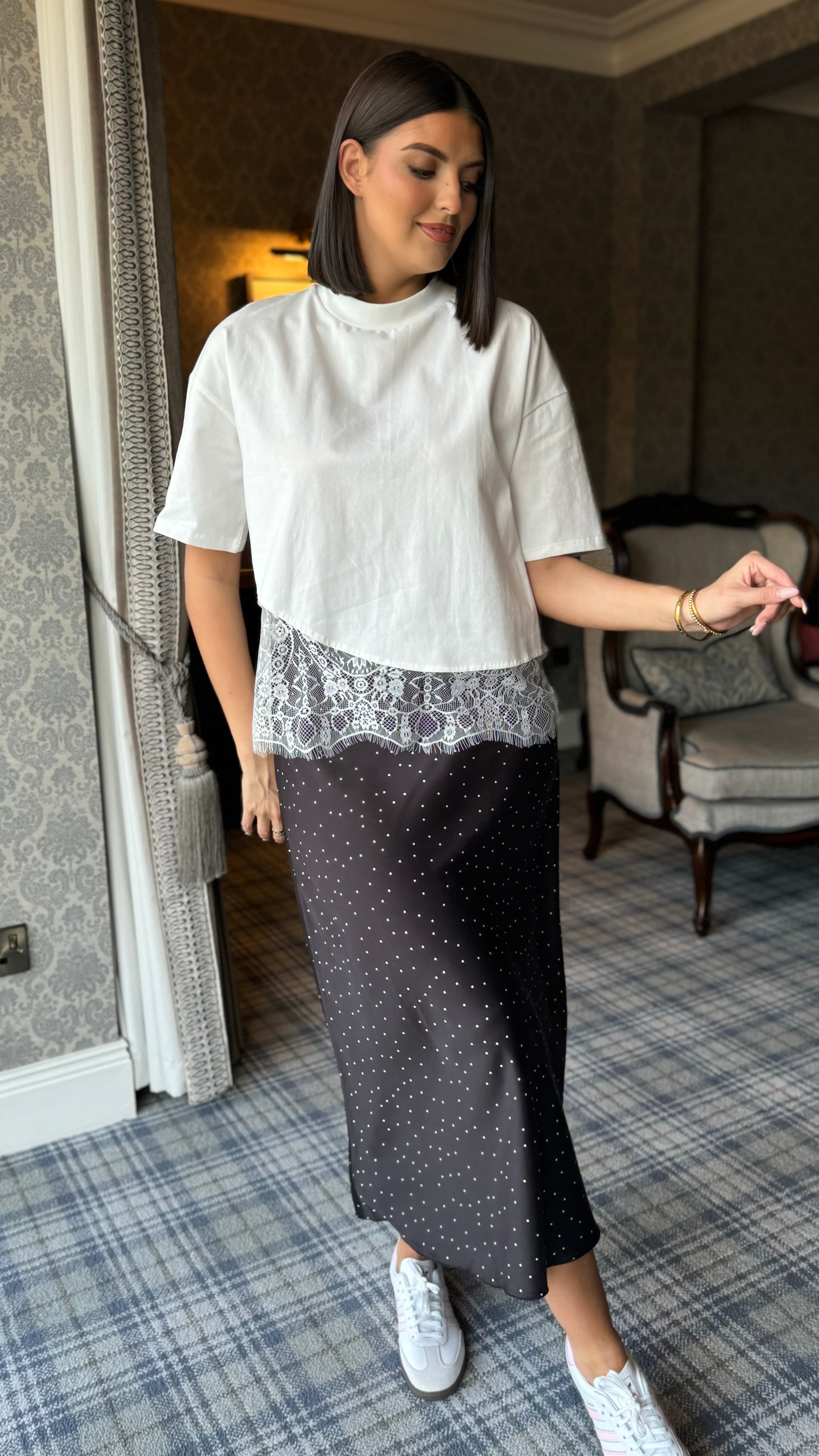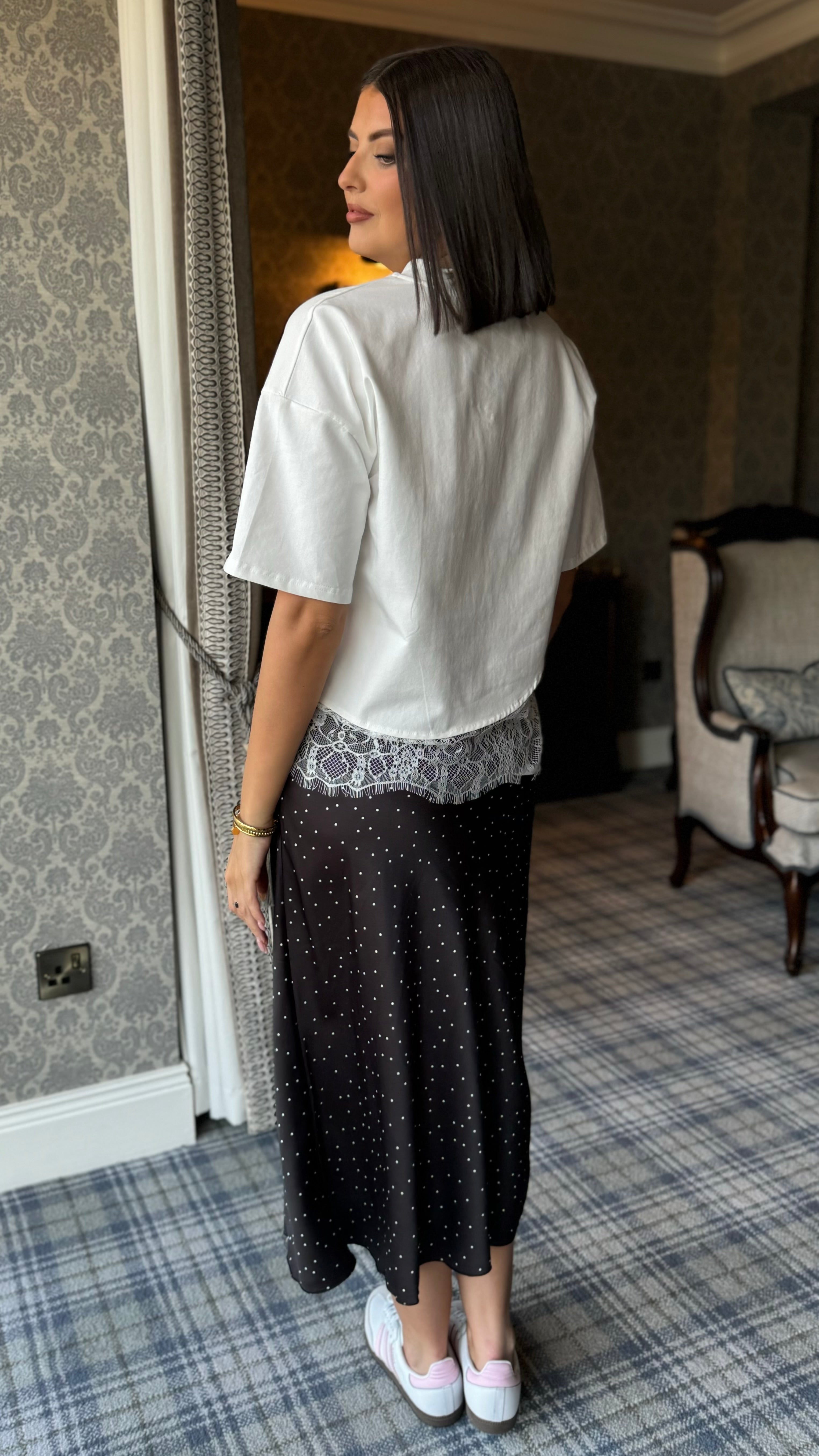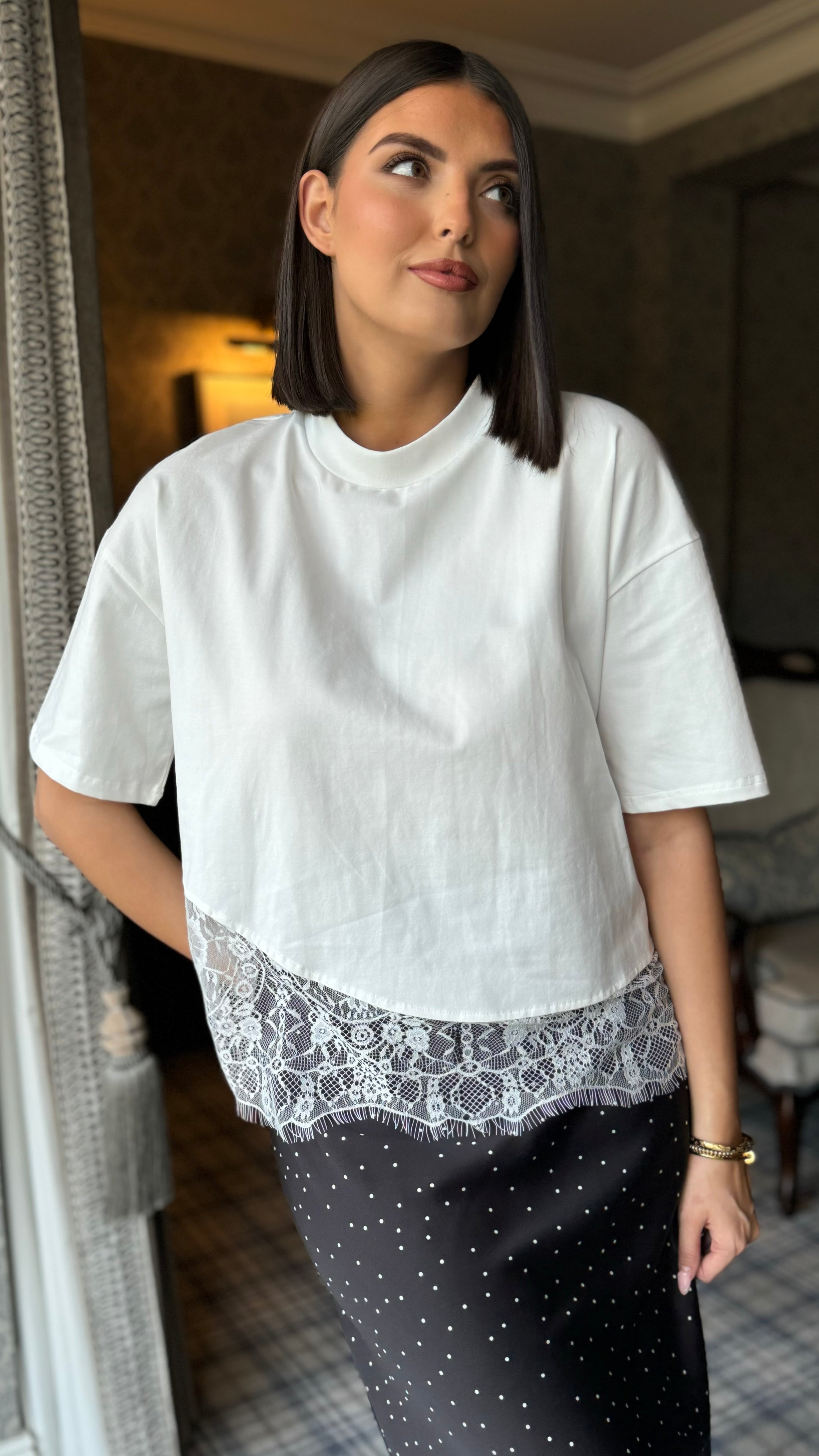 Elevate your everyday wardrobe with this sophisticated white top, featuring a timeless round neckline and delicate lace hem detailing. The mid-length sleeves offer versatile styling for layering or standalone wear, making it an effortless addition to both casual and polished looks. Crafted with a contemporary edge, this piece balances structure and femininity for a refined, modern aesthetic.