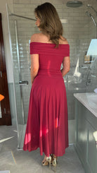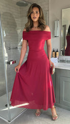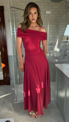 Effortlessly elegant, the Emma Red Off Shoulder Flared Maxi Dress combines romantic styling with contemporary ease. The gathered off-shoulder neckline creates a flattering, feminine silhouette, while the pleated skirt adds graceful movement and dimension. A drop-waist design elongates your frame, and the maxi length delivers sophisticated coverage perfect for evening occasions or special events. Crafted for those who appreciate timeless pieces with modern appeal.