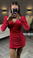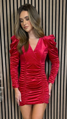Make a statement in our dramatic Enya dress! This slinky mini features a ruched silhouette, a beautiful V-neckline, and daring puff sleeves, all covered in glimmering diamante crystals. Get ready to shimmer the night away! 🤩💃