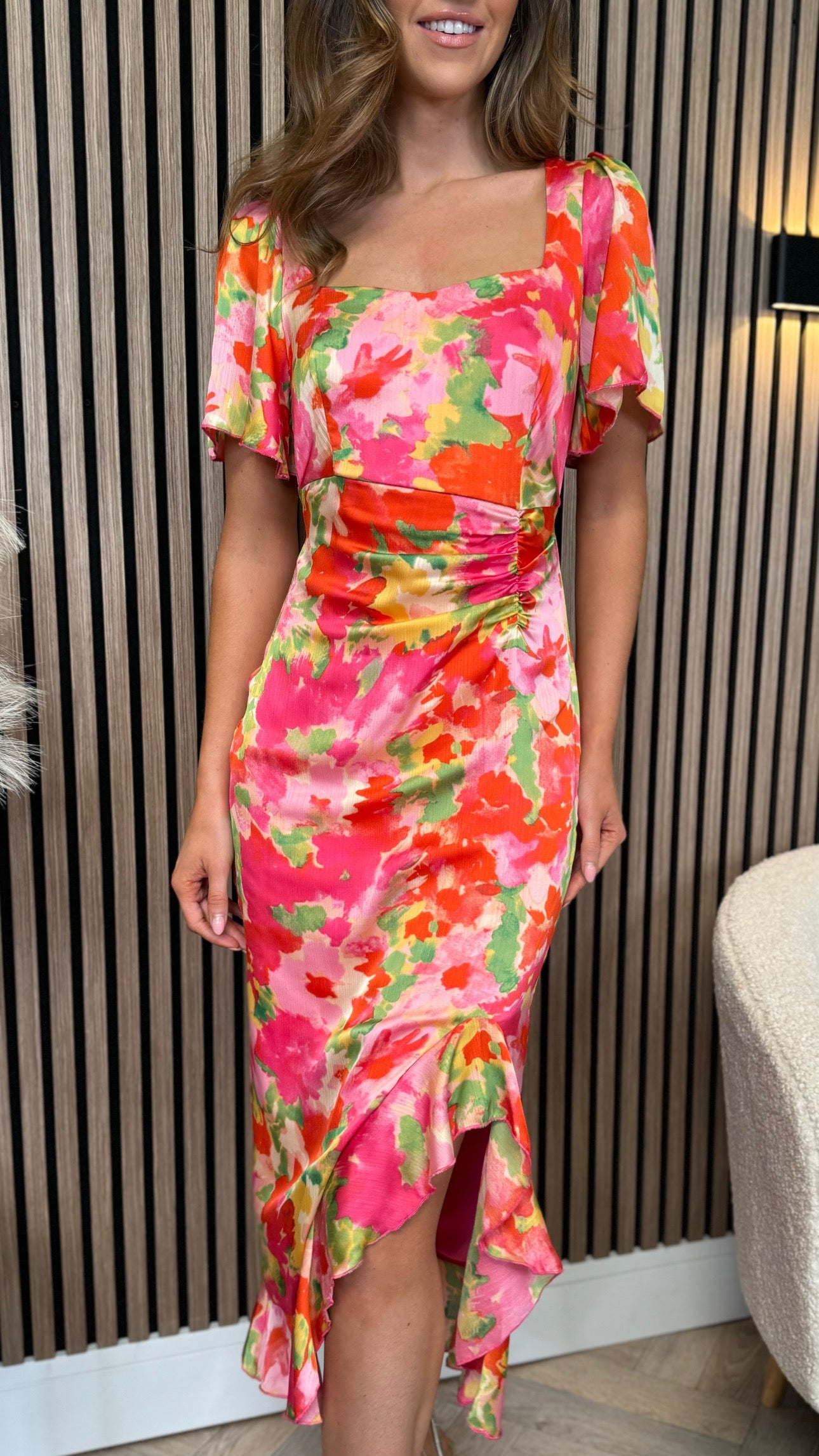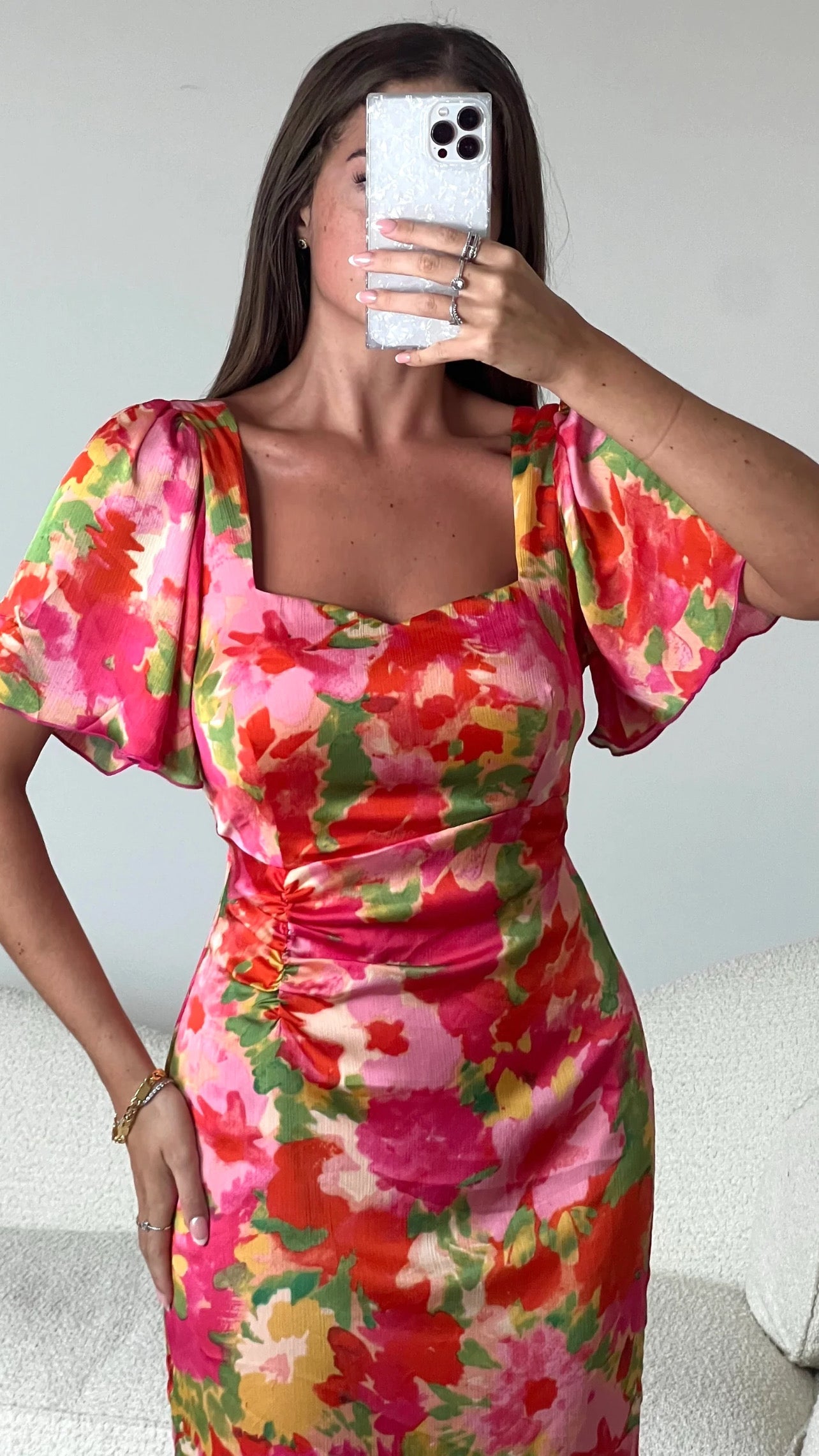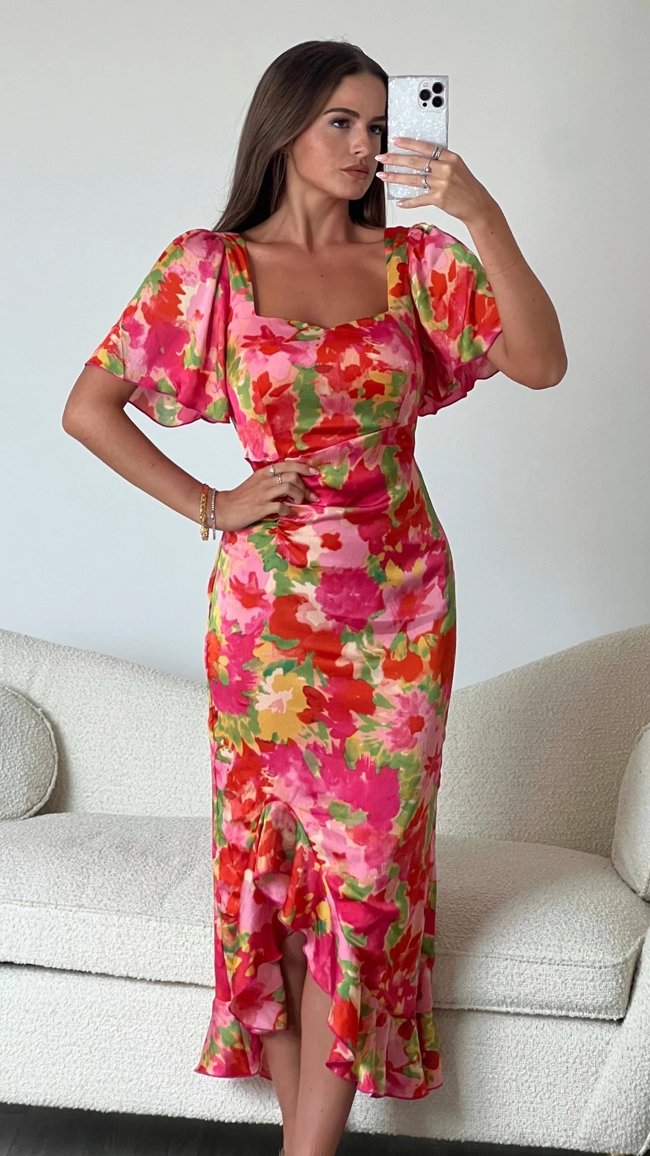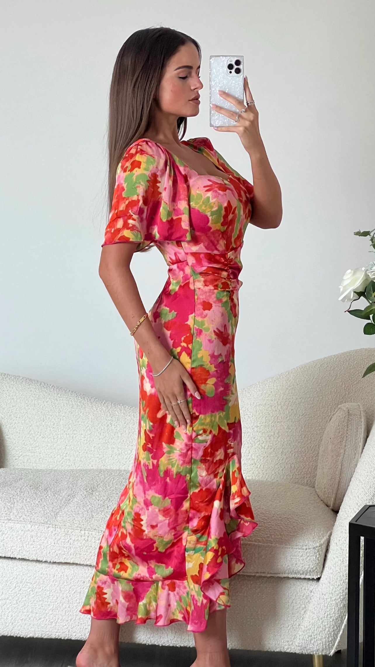 Introducing the Erica Orange Floral Burnout Ruched Midi Dress 😍 Elevate your wardrobe with this stylish piece, featuring a sweetheart neckline, waist-enhancing ruching, and delicate frills. The luxurious burnout fabric adds a touch of elegance, perfect for any occasion. Style with heels and minimal jewelry for a chic look 👠💎