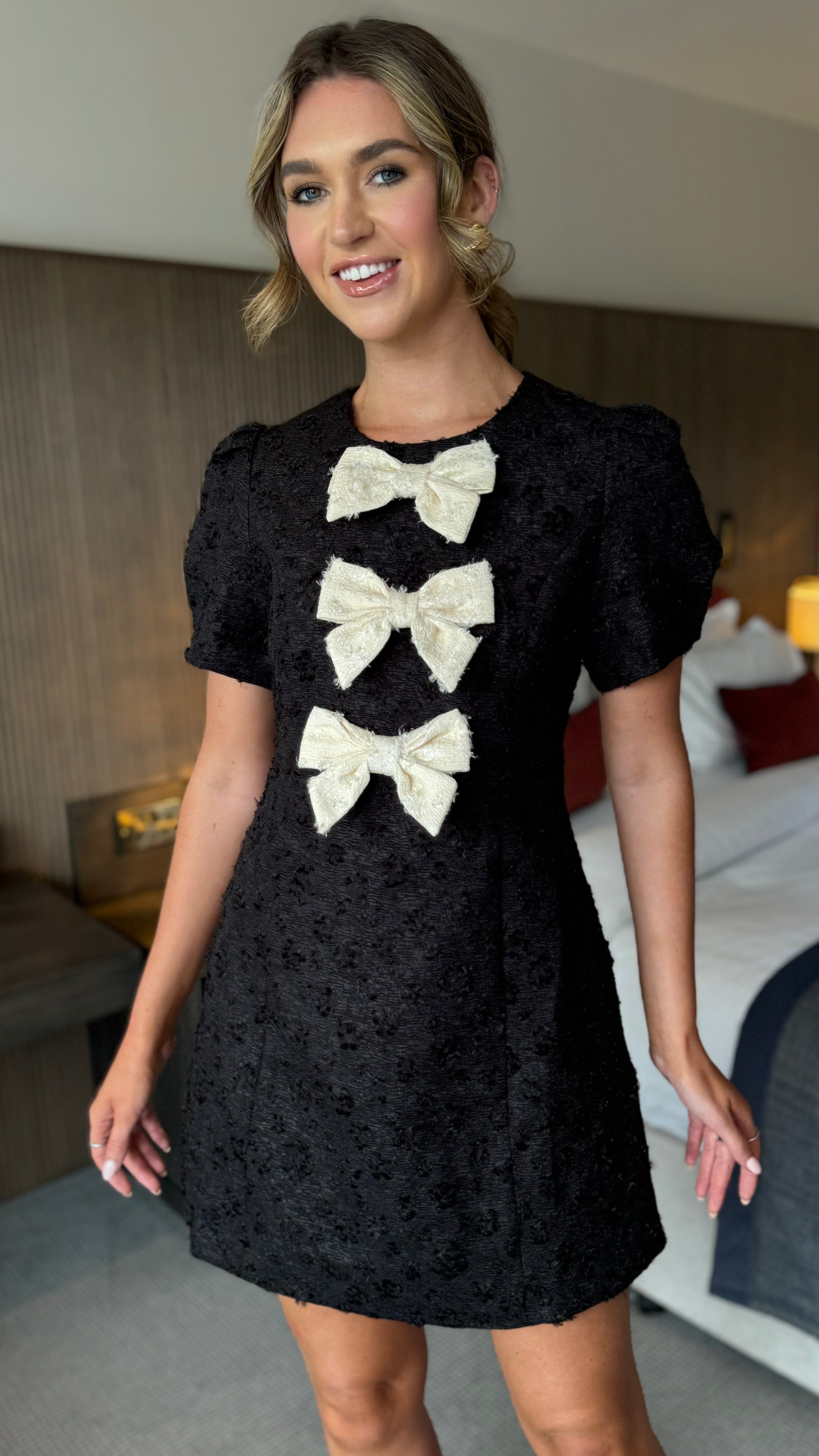 This playful black mini dress features charming short puff sleeves and a delicate bow detail that adds a touch of whimsy. Its monochrome design is elevated by subtle sequin accents, making it perfect for sparkling moments. The mini length keeps the look flirty and fun, ideal for parties or special occasions.