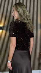 Add a touch of sparkle to your look with the Fia Brown Sequin Tie Detail Top. Featuring a playful V-neck and a chic satin bow, this on-trend piece brings fun to your wardrobe. Its half-length sleeves offer the perfect balance between coverage and comfort, making it ideal for day-to-night wear. Shine bright and stand out with this stylish top!