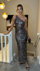 This Figaro Black dress is a stunning showstopper! Its unique one-shoulder design and glimmering multi-colour sequin fabric make a glamorous statement. Plus, slip into party mode with ease thanks to the side split! Making the night unforgettable has never been so chic. 🤩