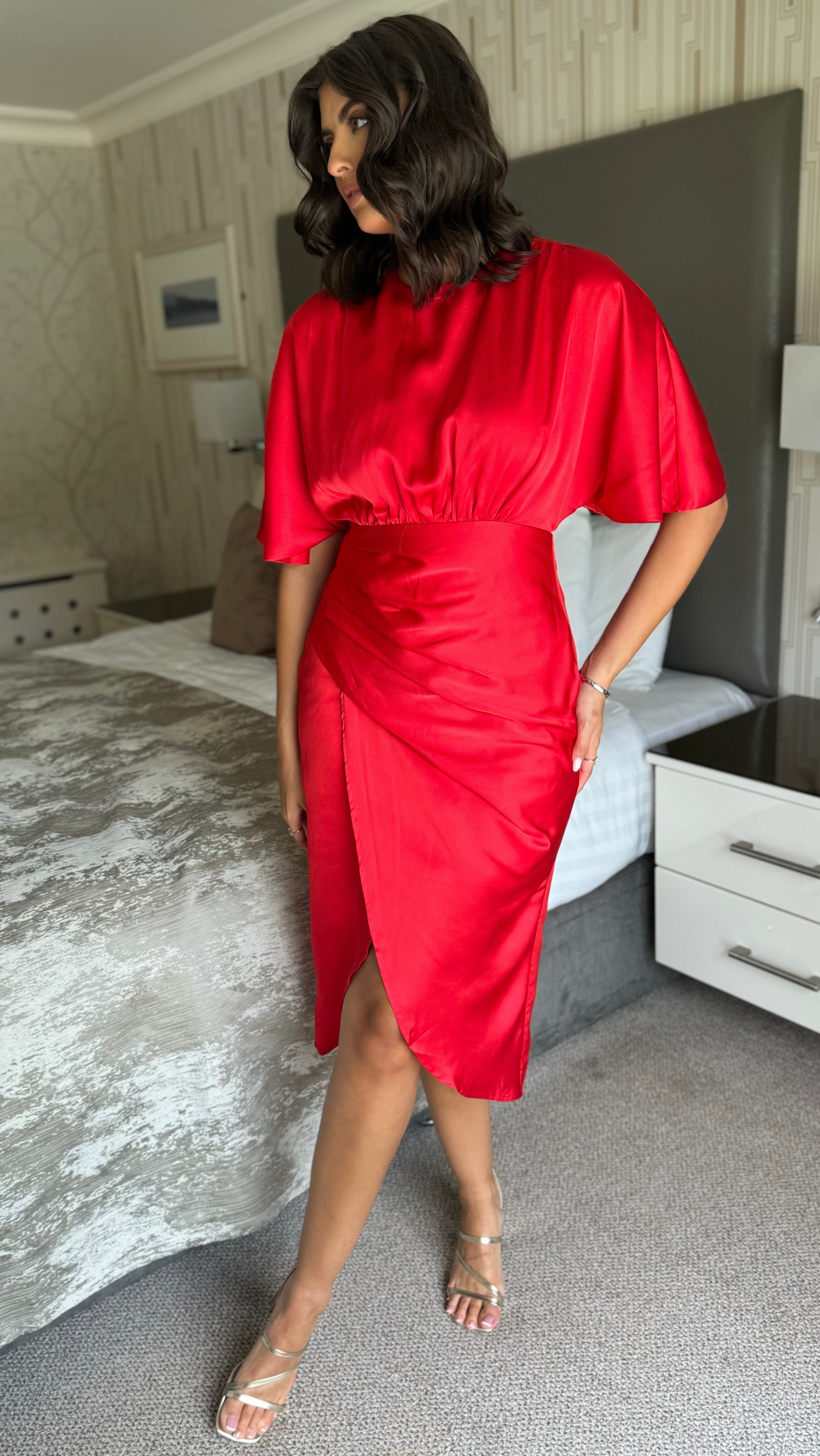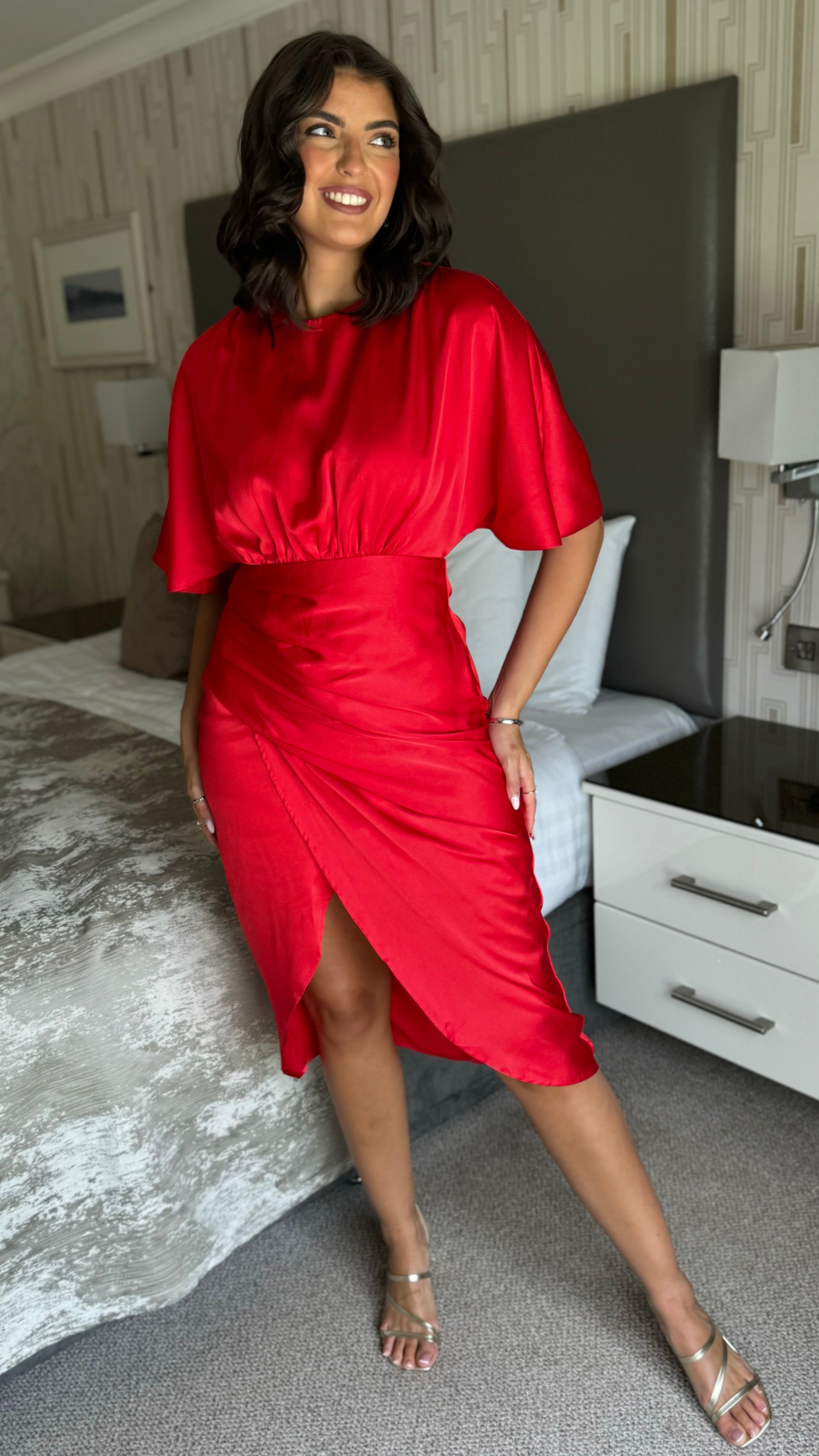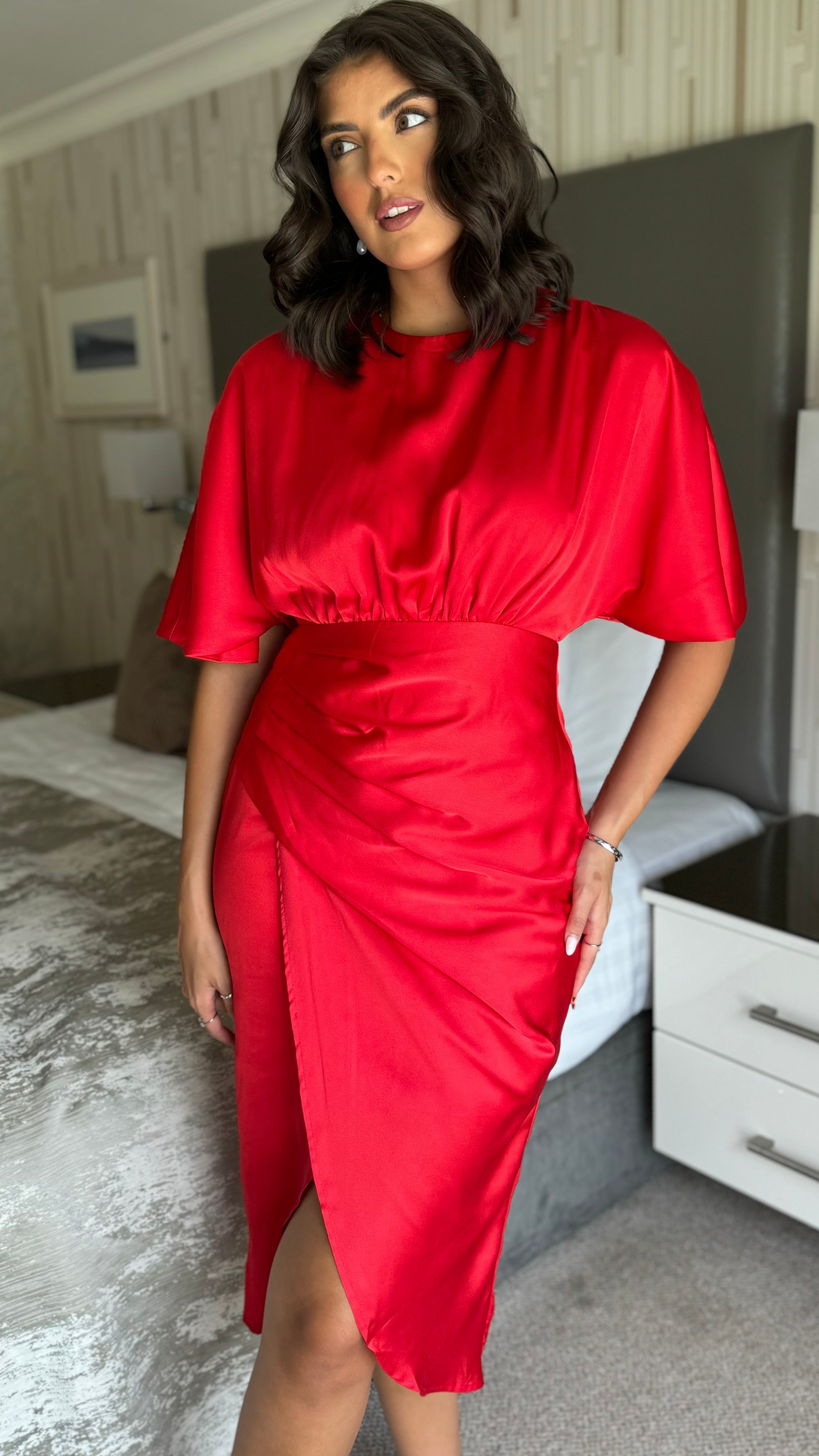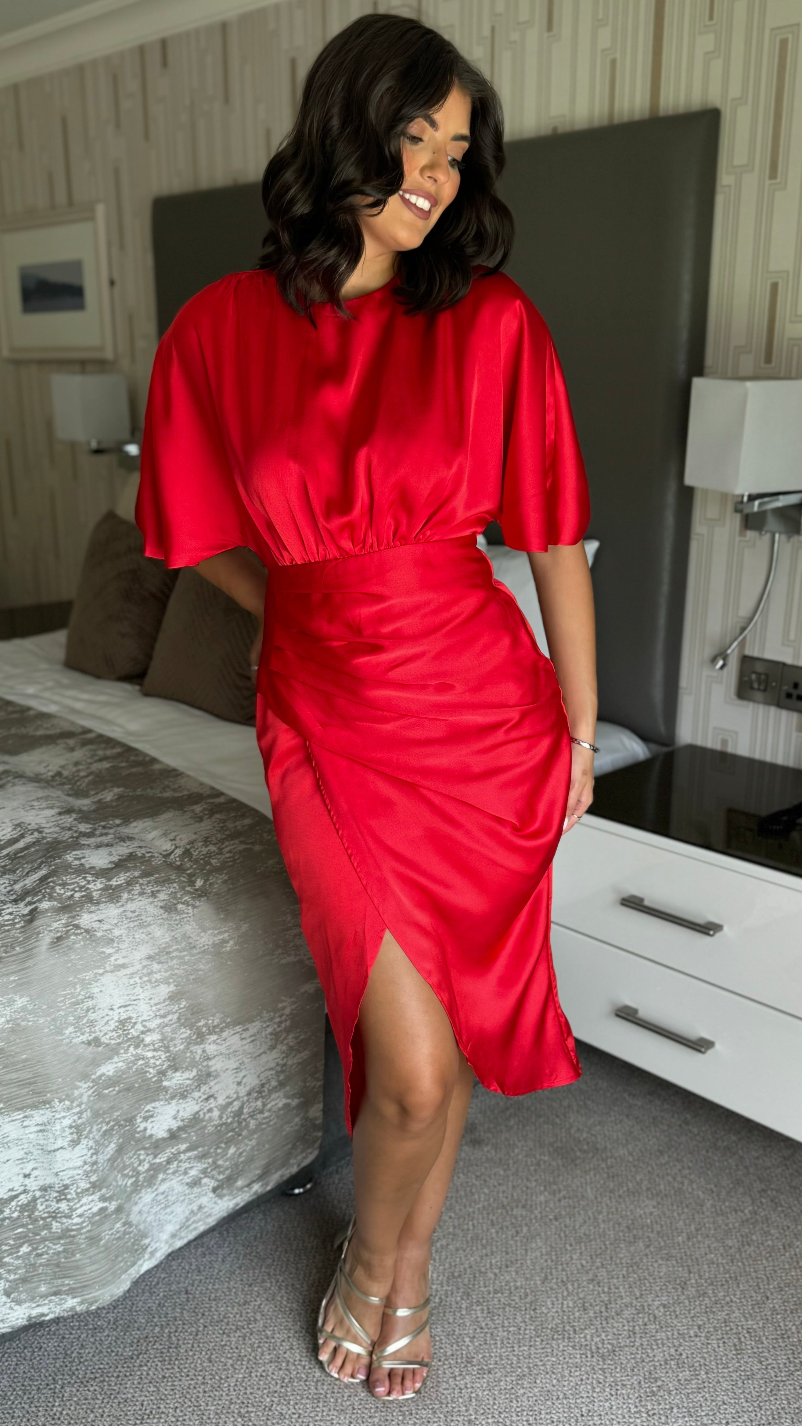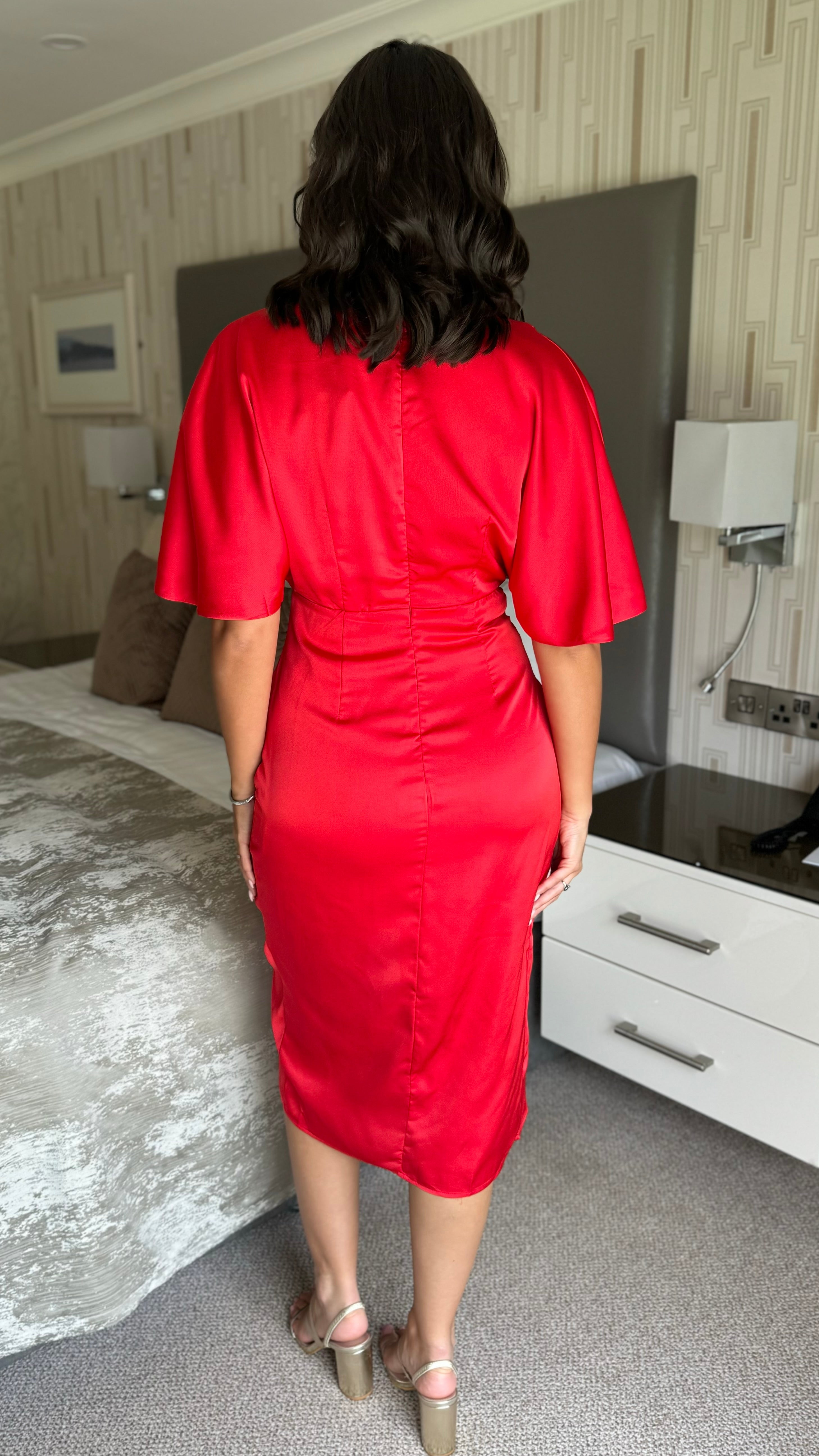 Frankie Red Satin Asymmetric Ruched Wrap Detail Midi Dress