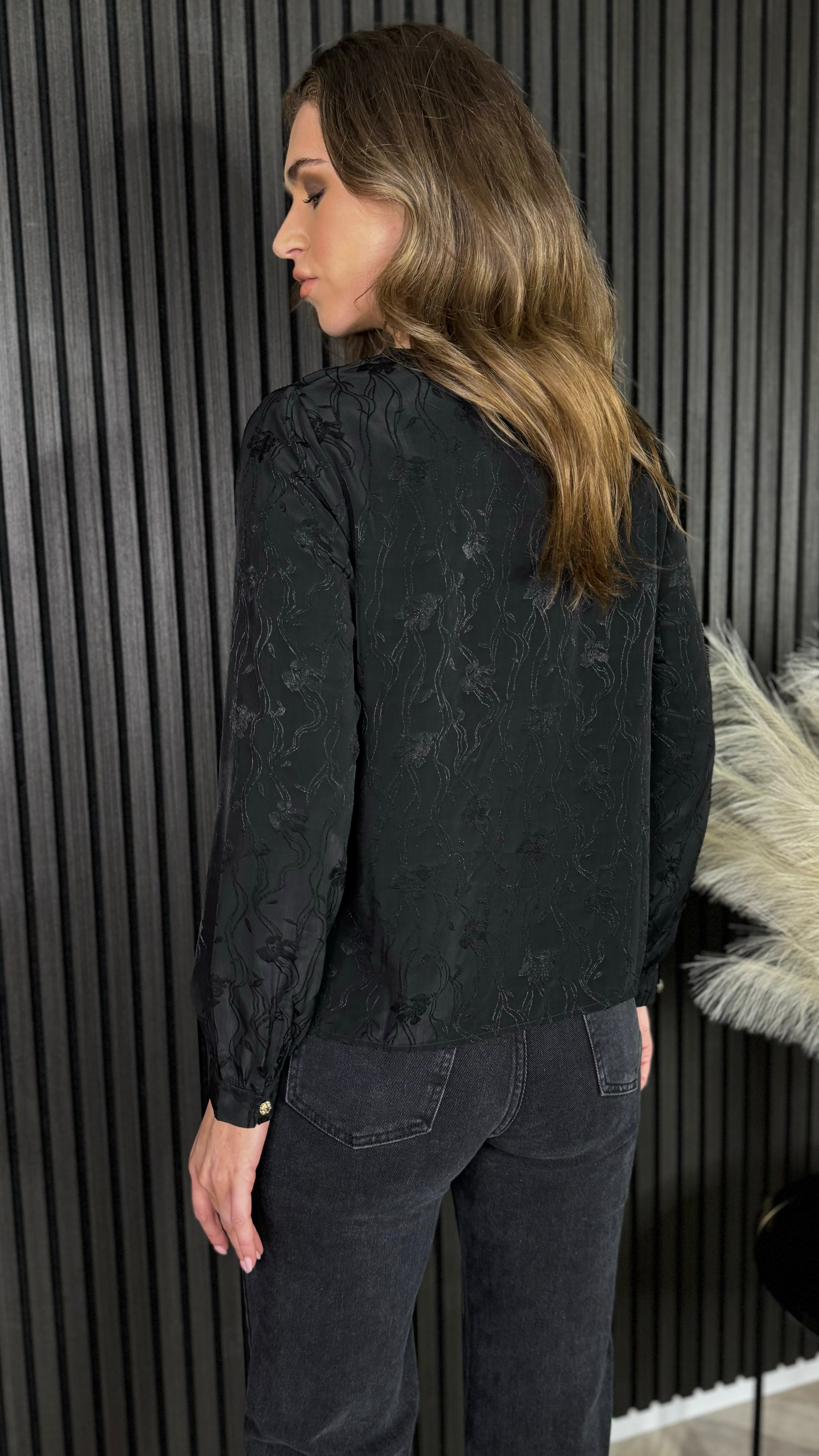 Get ready to turn heads with our Freya Black Drop Neck Top! Featuring a unique drop neck design and a stunning gold button front, this top is sure to make a statement. Complete with long sleeves and beautiful floral motifs throughout, this top is perfect for any occasion. Upgrade your wardrobe with this must-have piece!