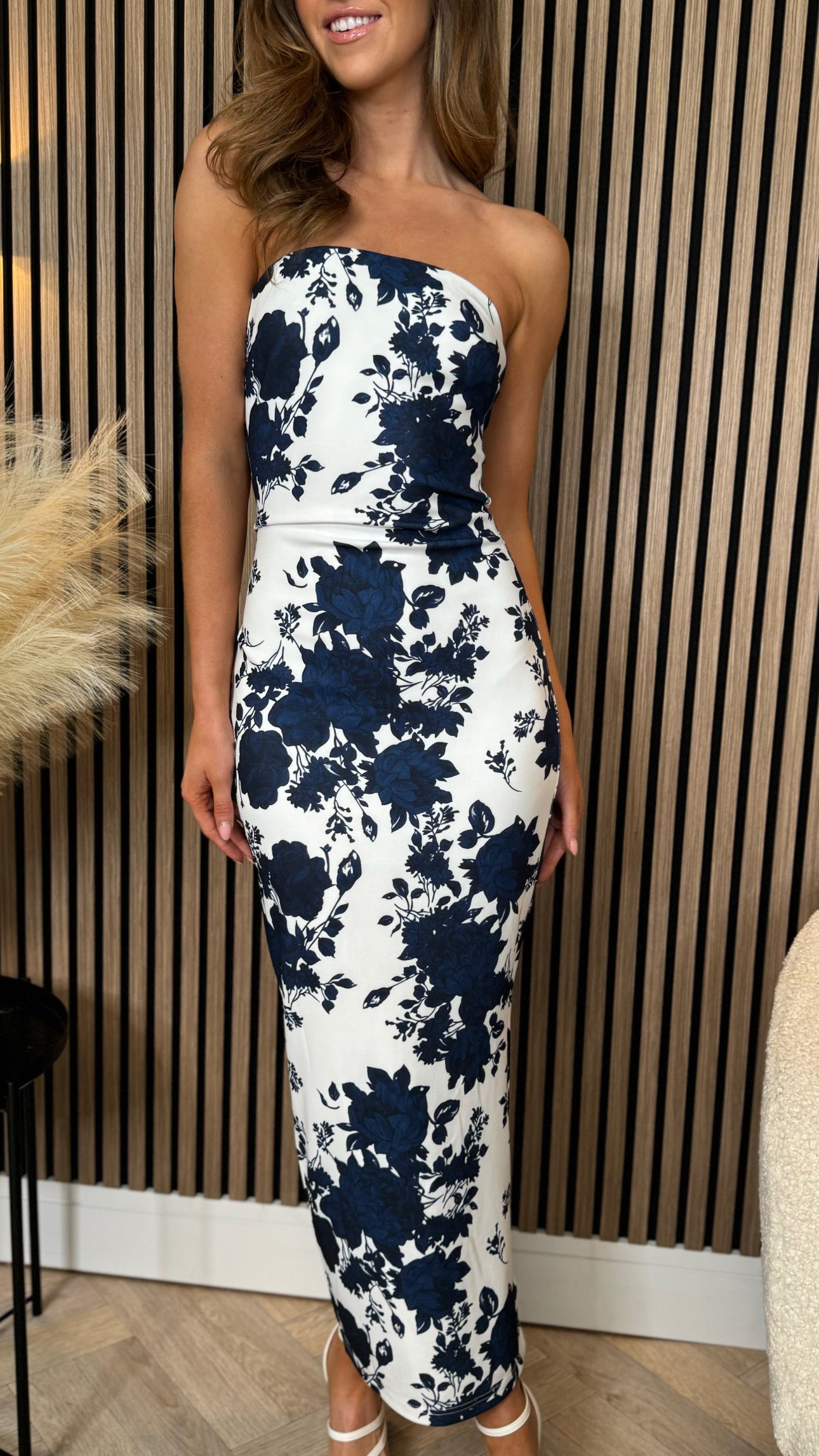 Add some floral fun to your wardrobe with our Freya Navy Floral Bandeau Midi Dress! Designed to hug your curves and sculpt your silhouette, this dress will make you feel confident and stylish. Perfect for any occasion, it's the ultimate blend of elegance and simplicity. 💐😍