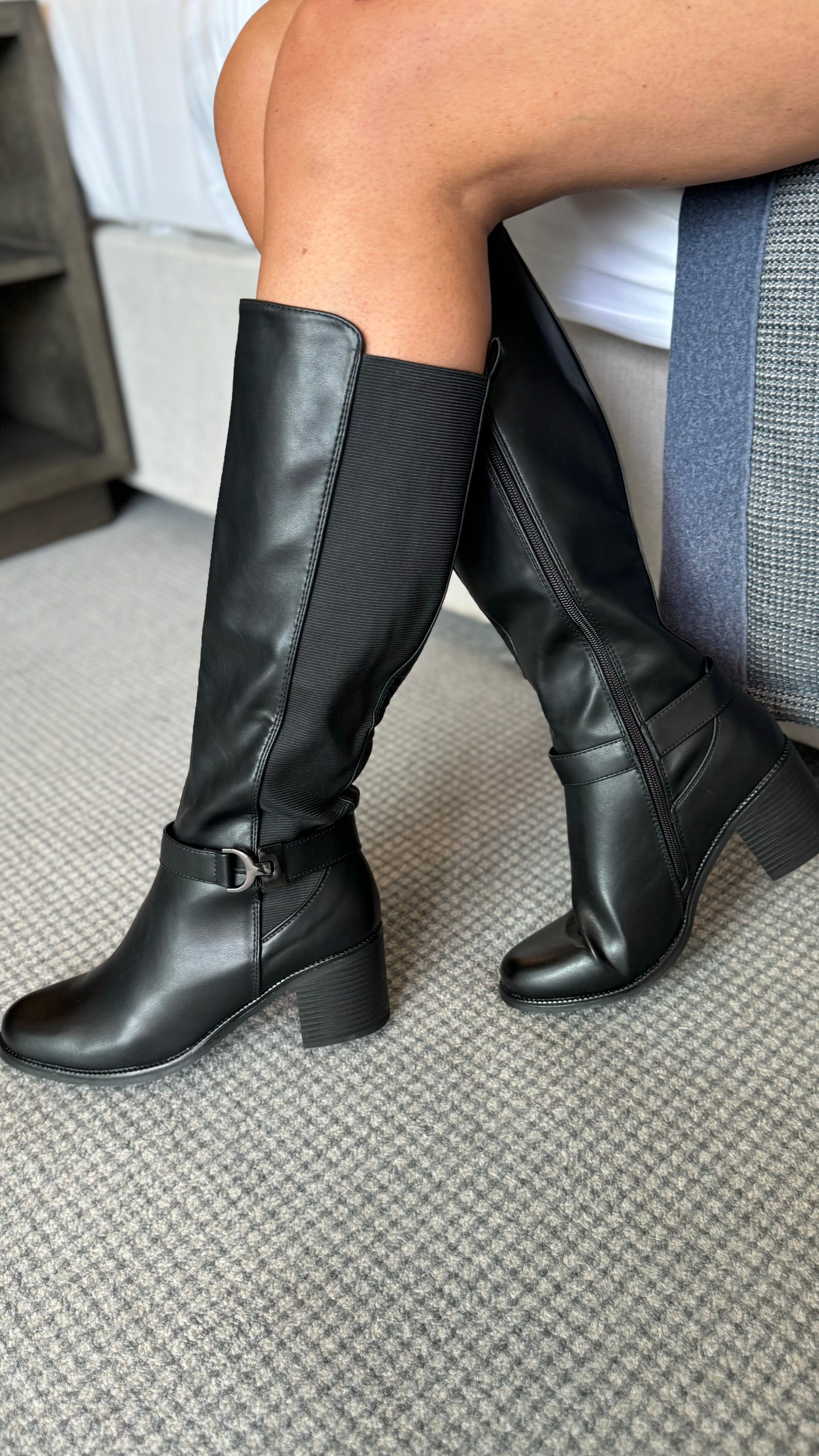 Grace Black Knee High Block Heel Boots