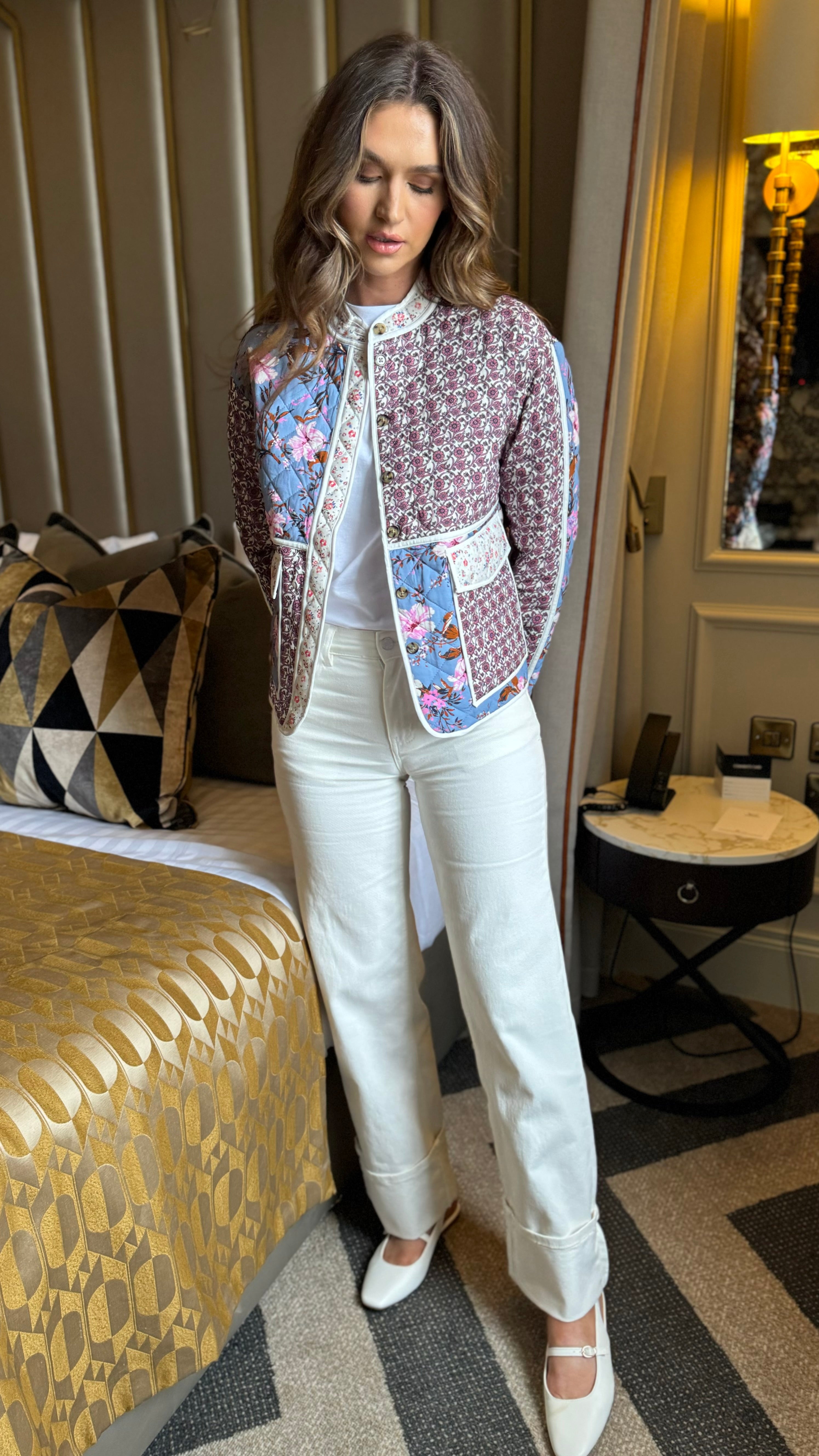 Stay warm and stylish with the Harriet Pink Floral Patchwork Quilted Jacket. Featuring a round neck and padded design, this jacket is perfect for chilly days. Make a statement with the unique floral patchwork and stay cozy all season long.