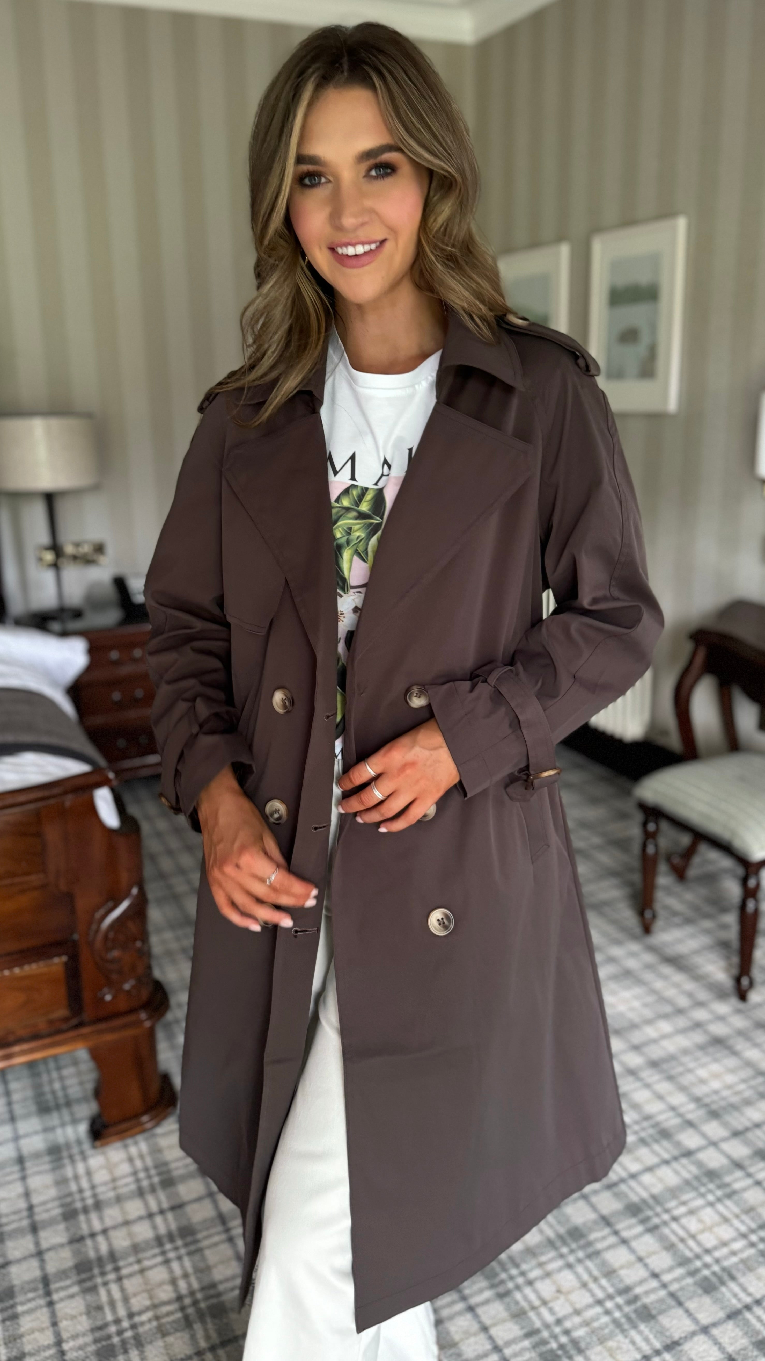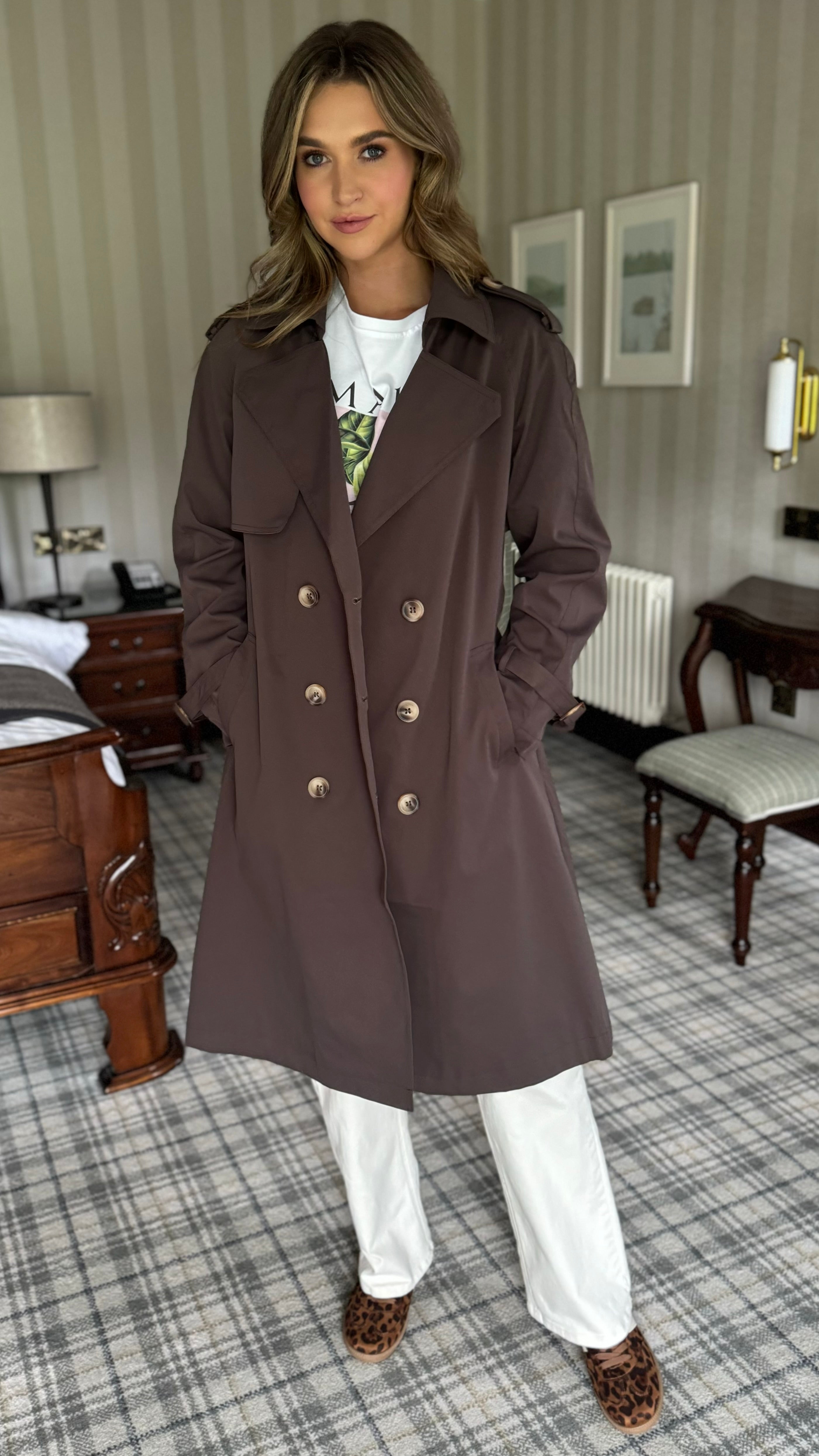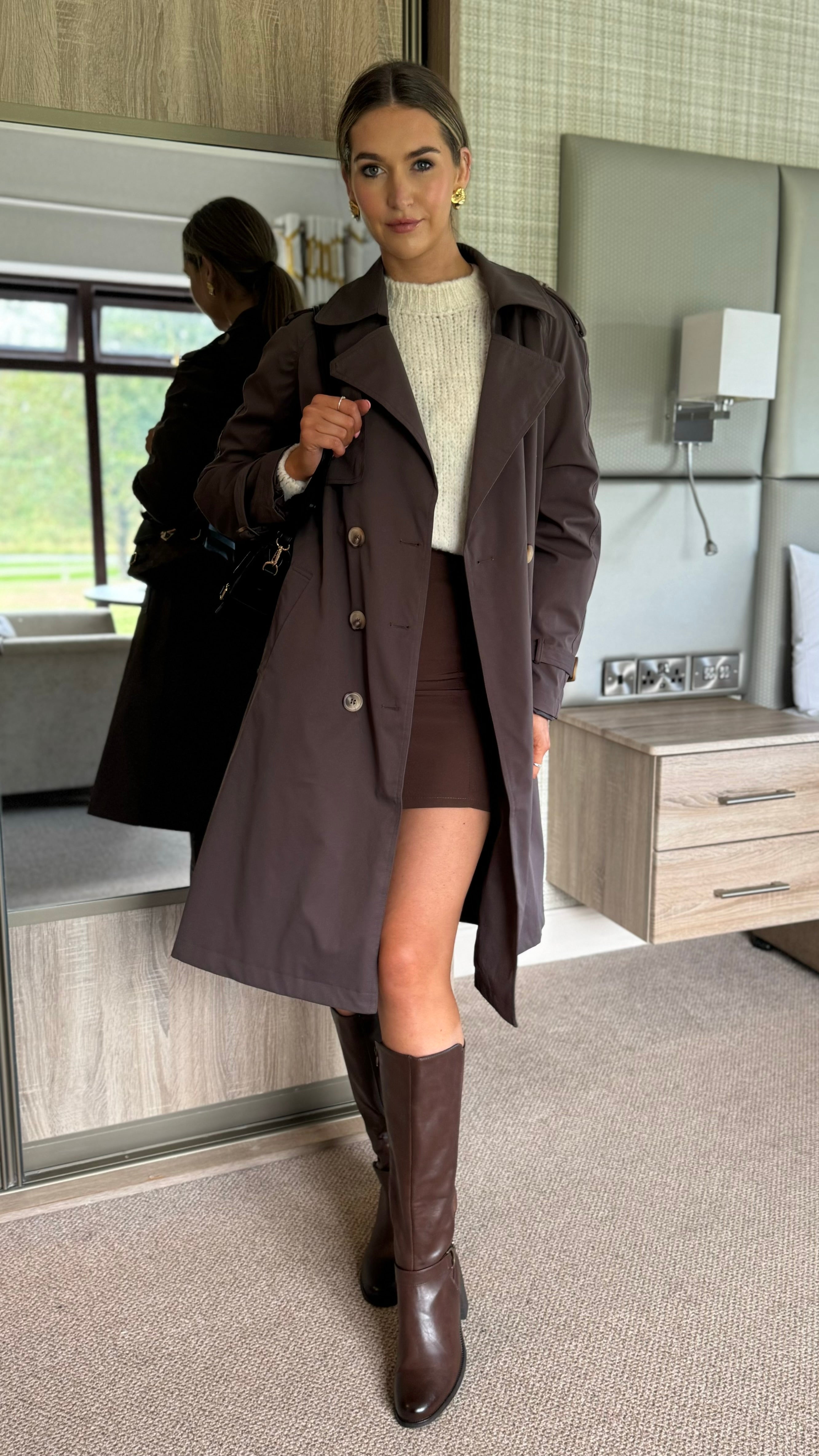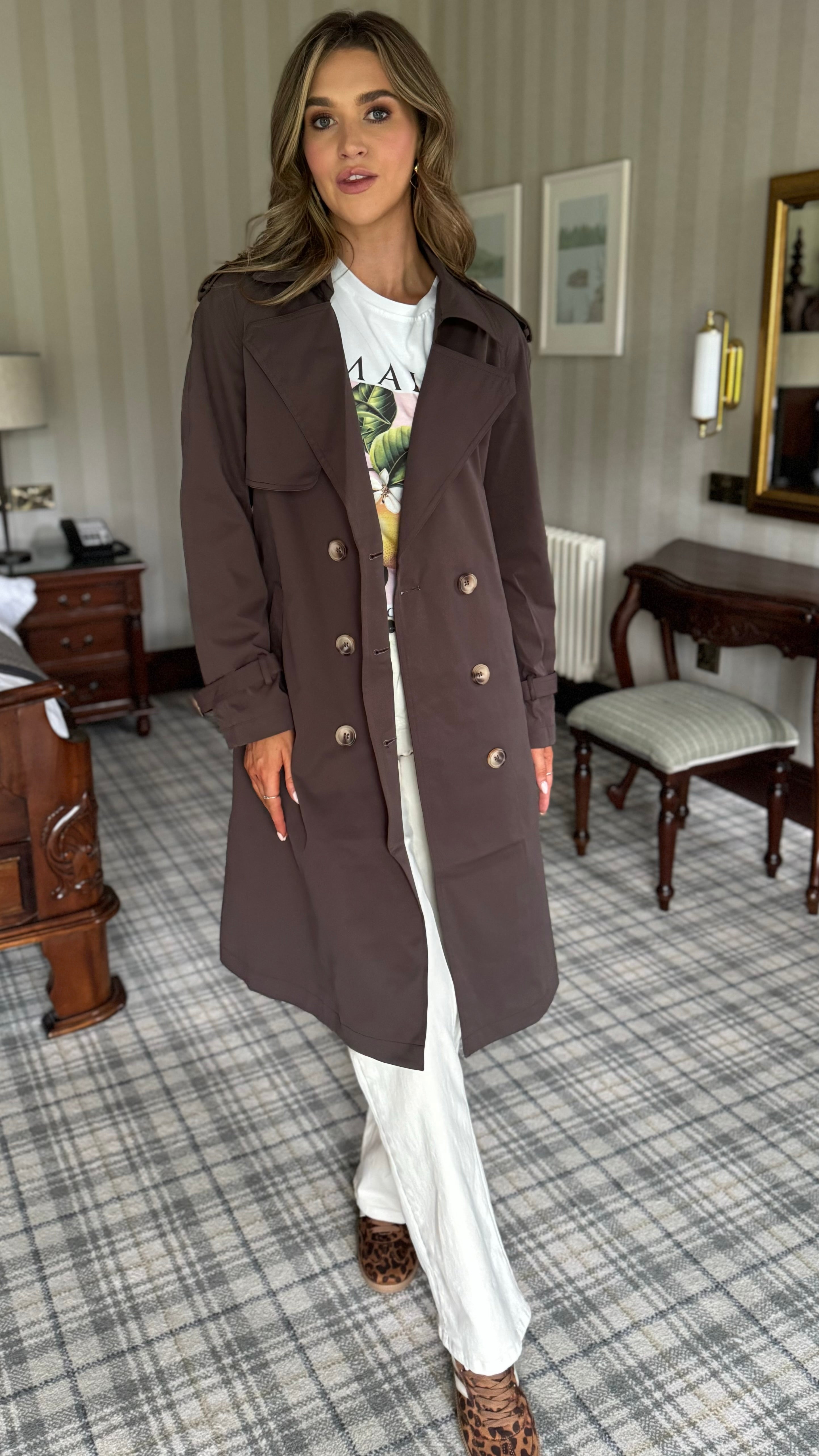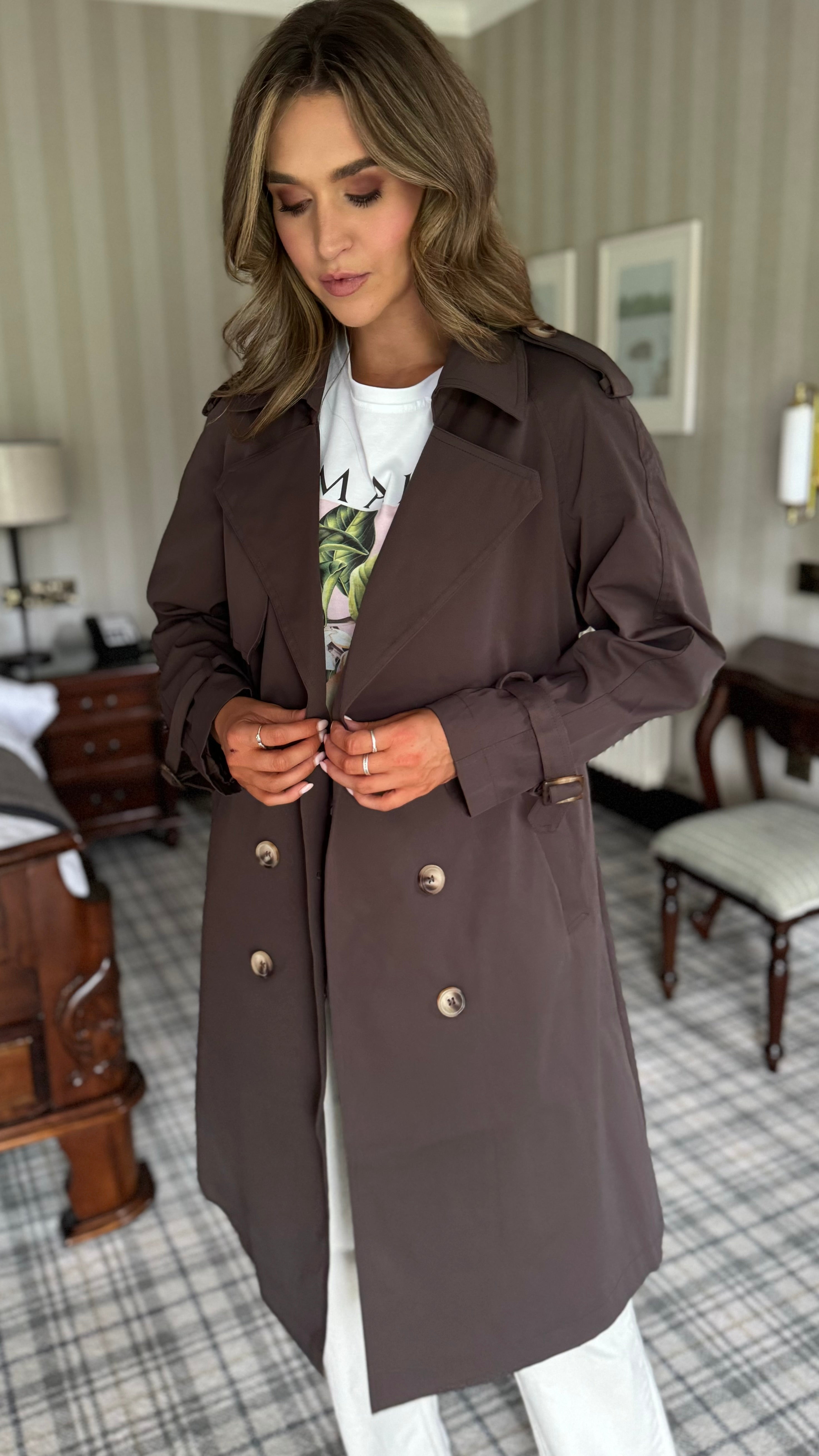 Elevate your outerwear with the Hunter Brown Belted Button Detail Trench Coat 🧥. Crafted for a refined silhouette, its tailored belt cinches the waist while elegant button accents add timeless charm. Perfect for sophisticated layering, this coat combines classic style with modern grace, ensuring you stay polished and poised in any setting. ✨