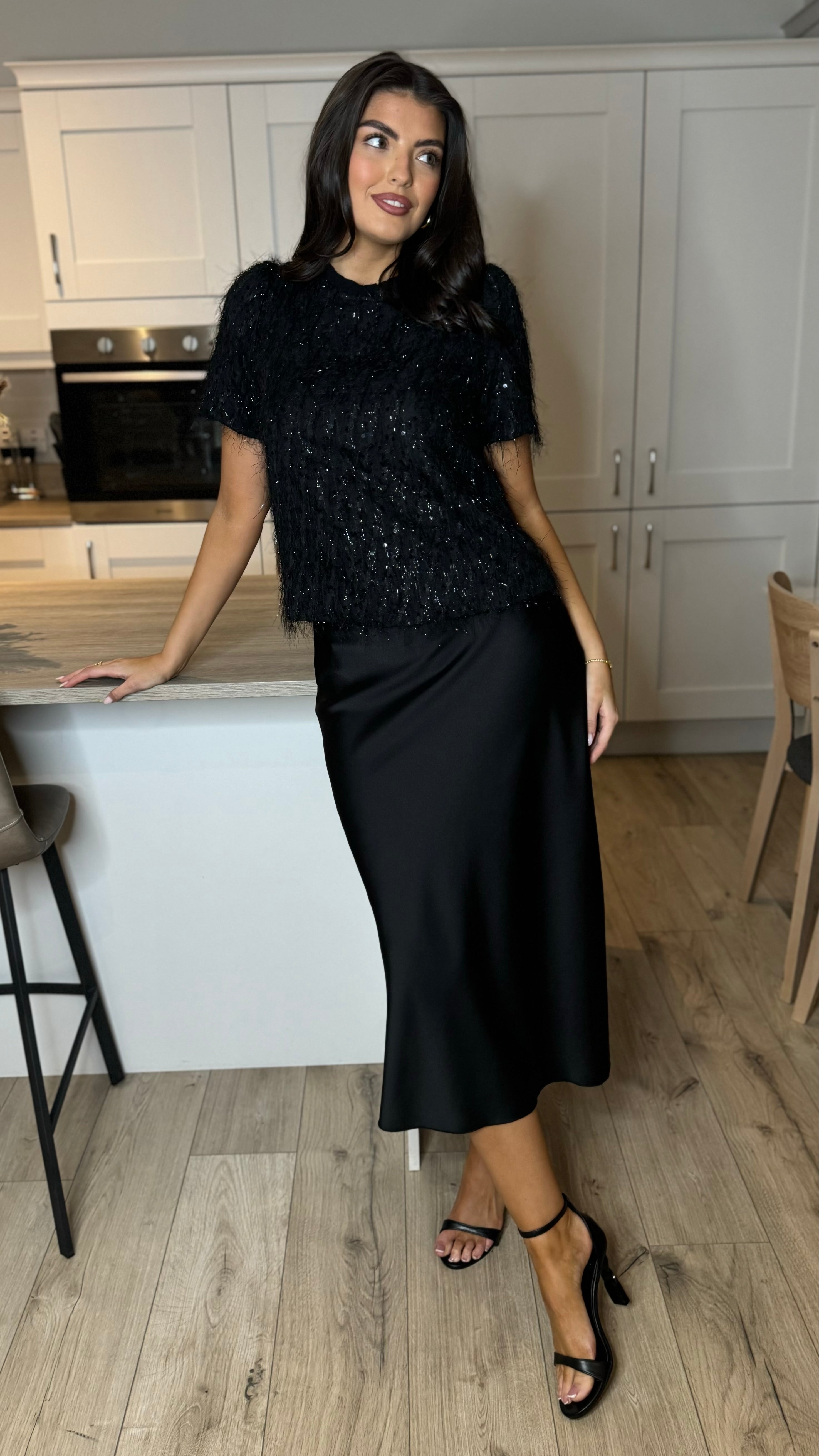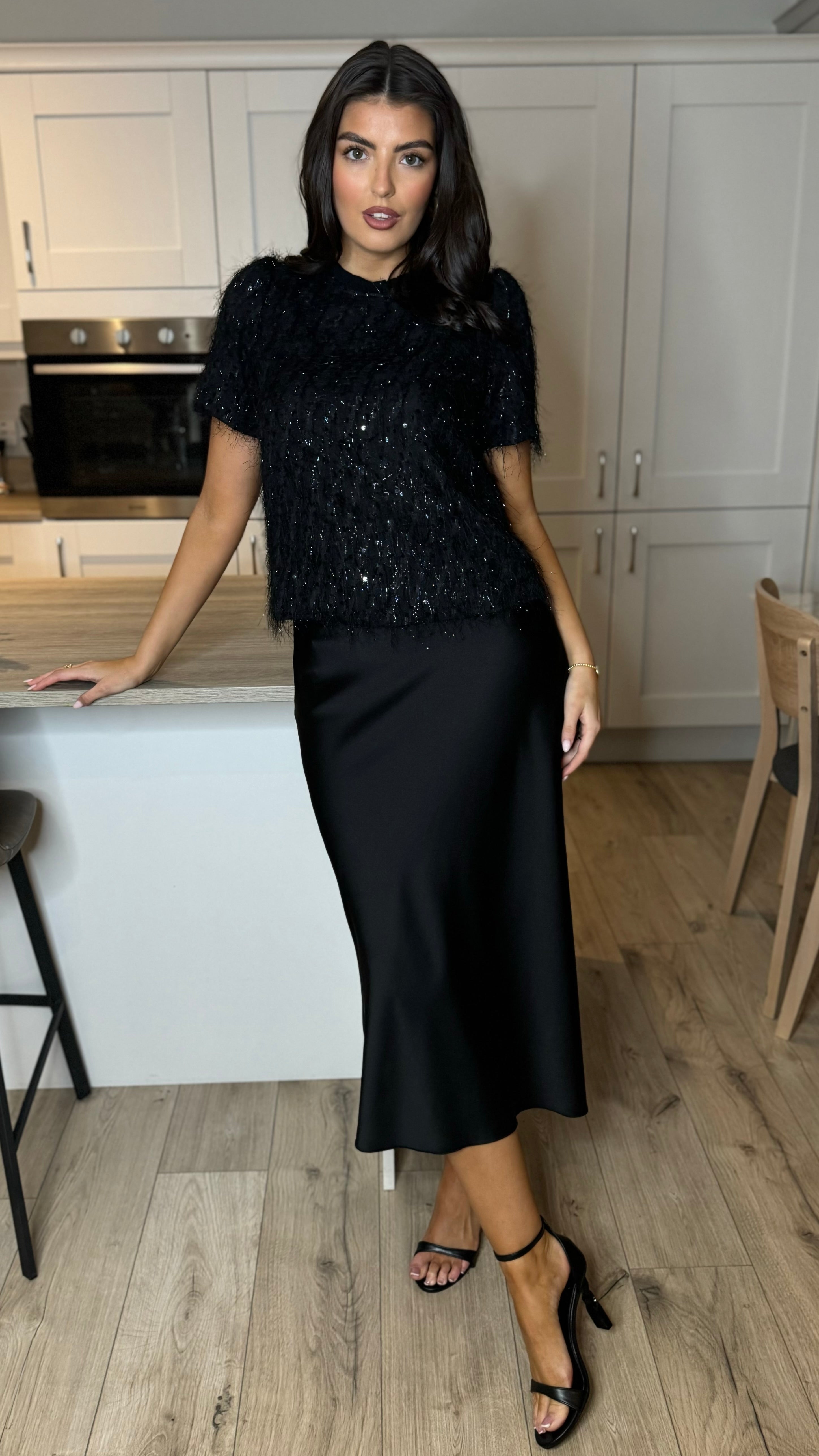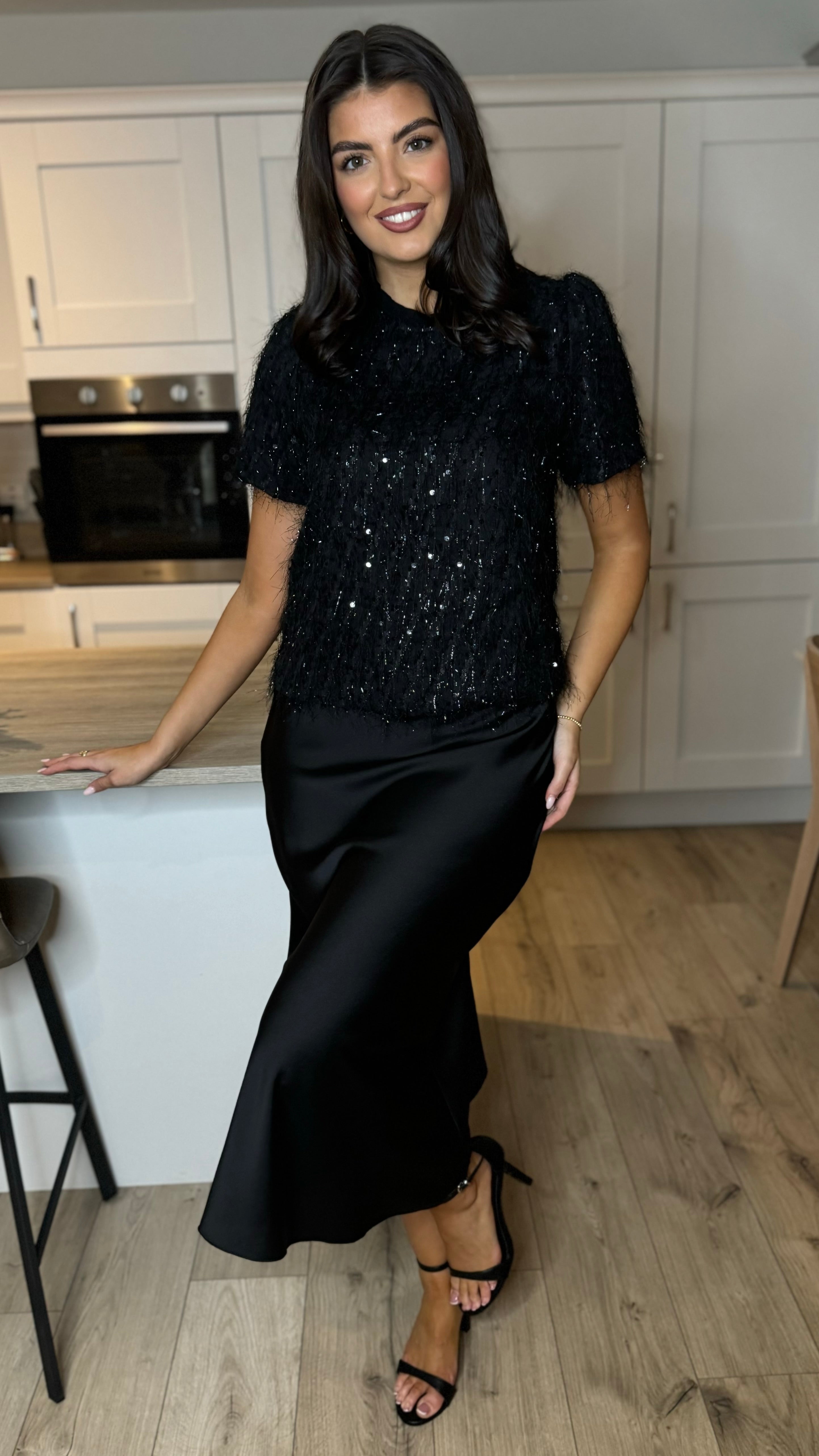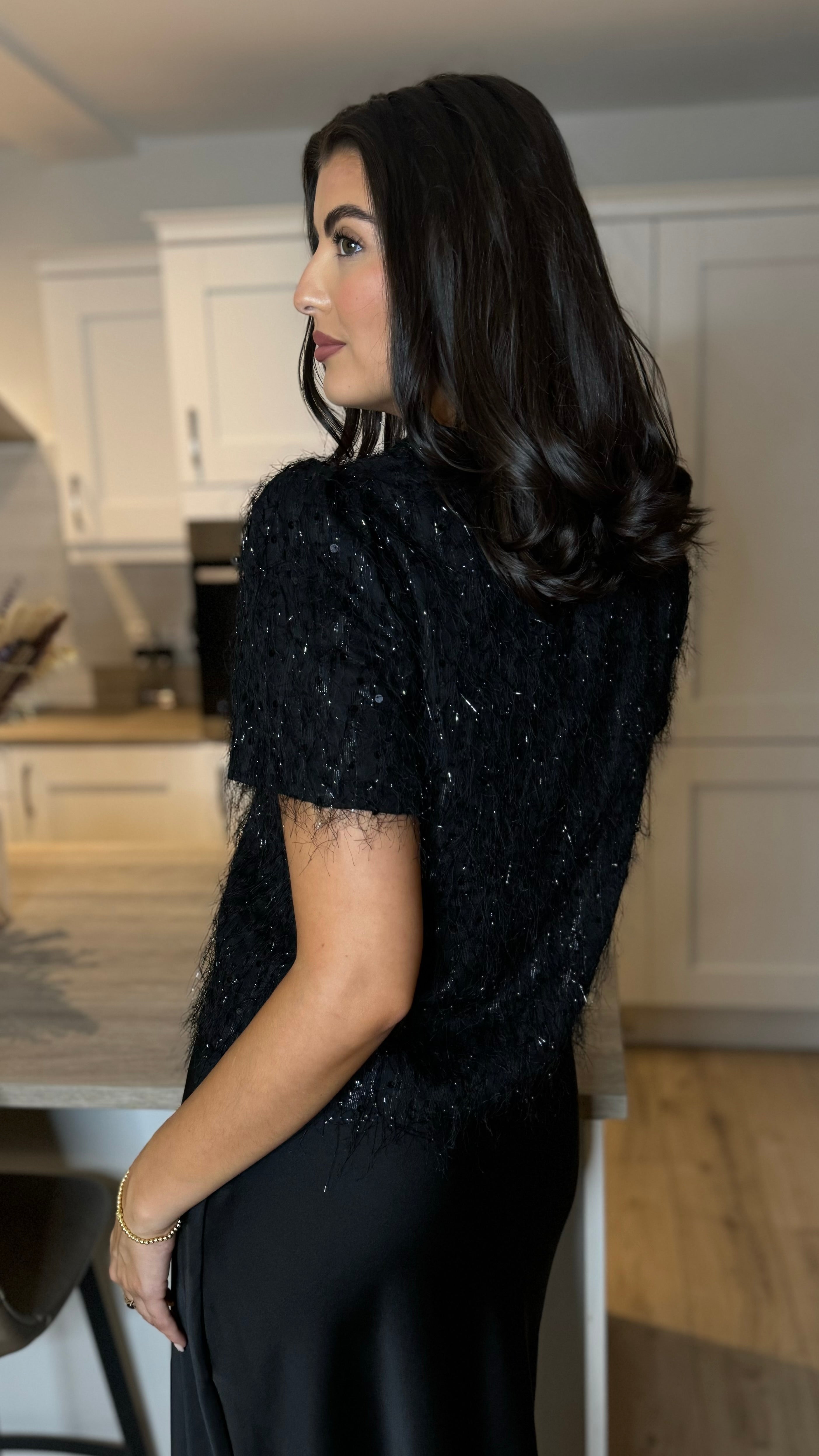 Elevate your evening look with this show-stopping sequin top! Featuring a chic high neckline and luxurious fluffy texture, it's designed to catch every light on the dance floor. The clever button and keyhole fastening at the back of the neck adds an unexpected twist—practical yet undeniably stylish. Perfect for nights when you want to sparkle and stand out from the crowd.