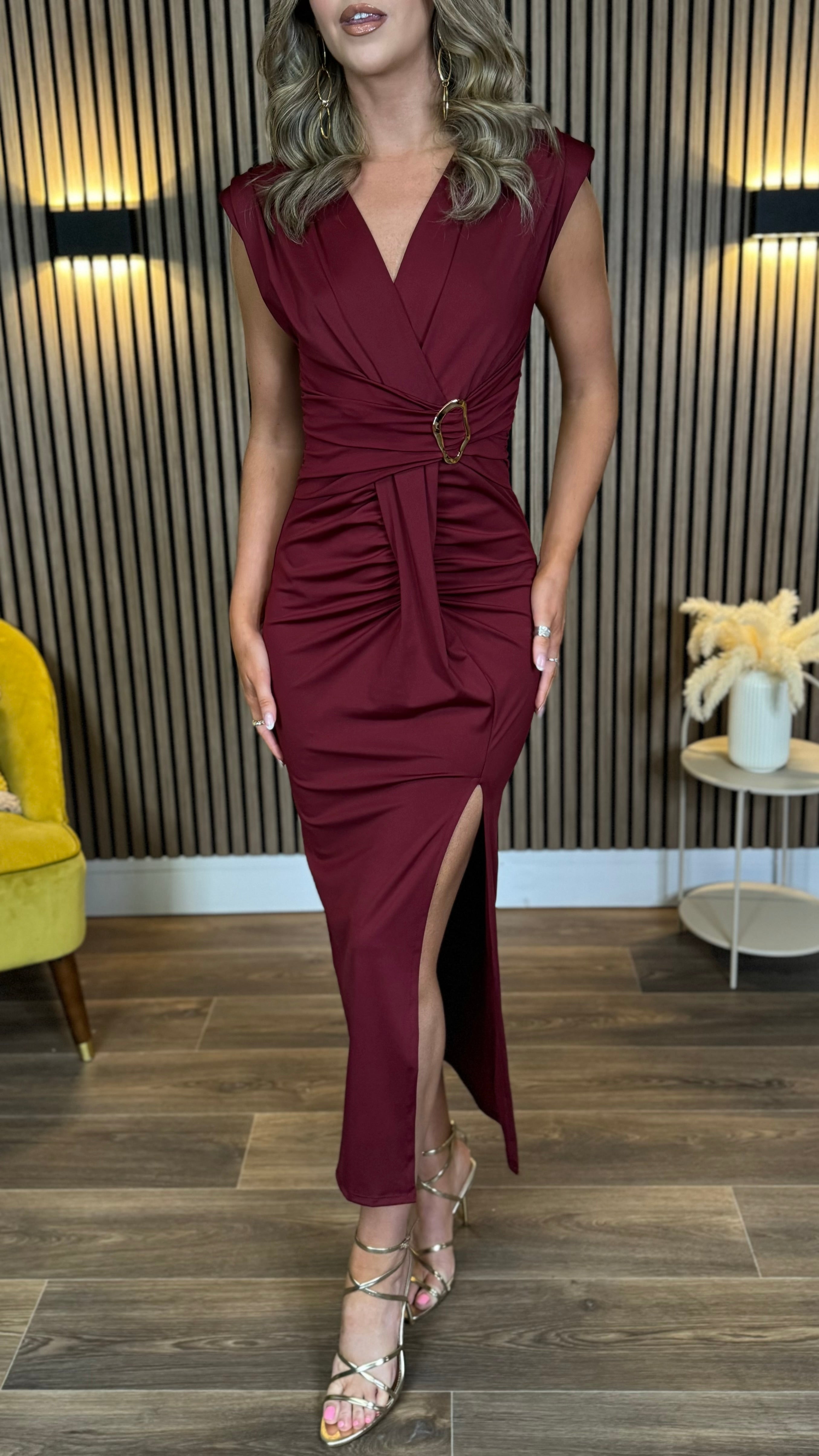 Flirt with elegance in the Indiyah Burgundy Gold Detail Midaxi Dress. Featuring a chic v neckline and a striking gold buckle detail, this dress hugs your curves with flattering ruching. Crafted from soft, slinky fabric, it moves with you for effortless style and comfort. Perfect for turning heads with a playful twist on sophisticated glamour.