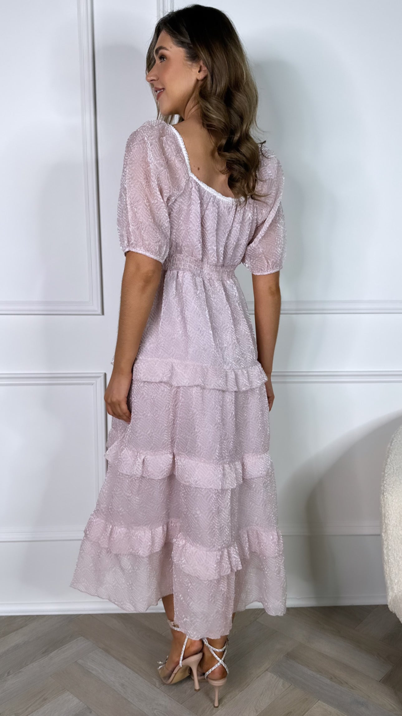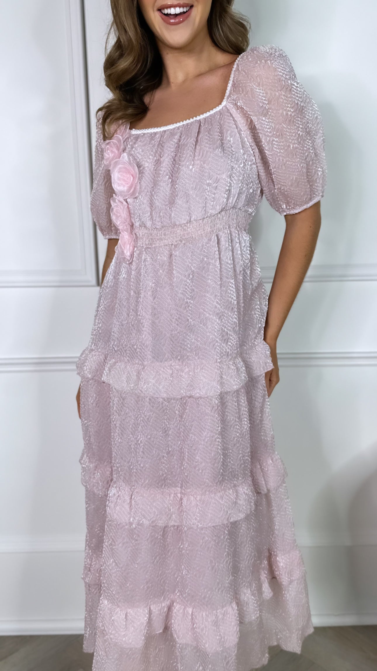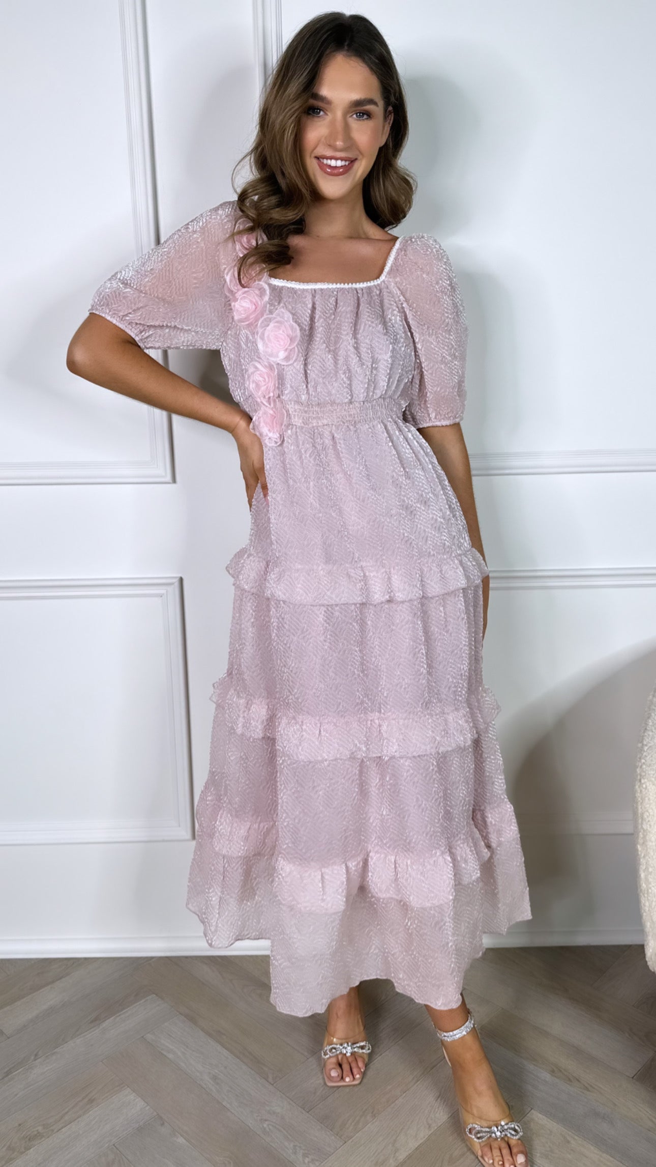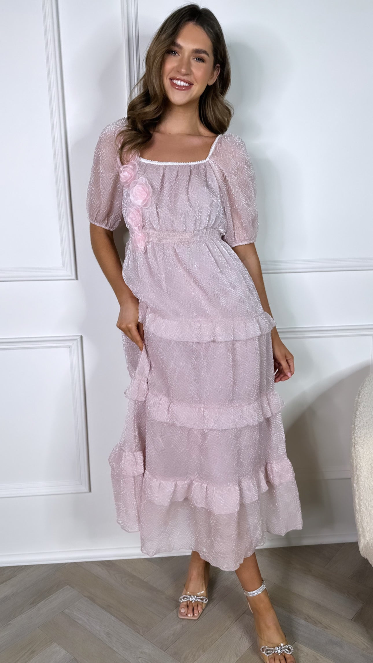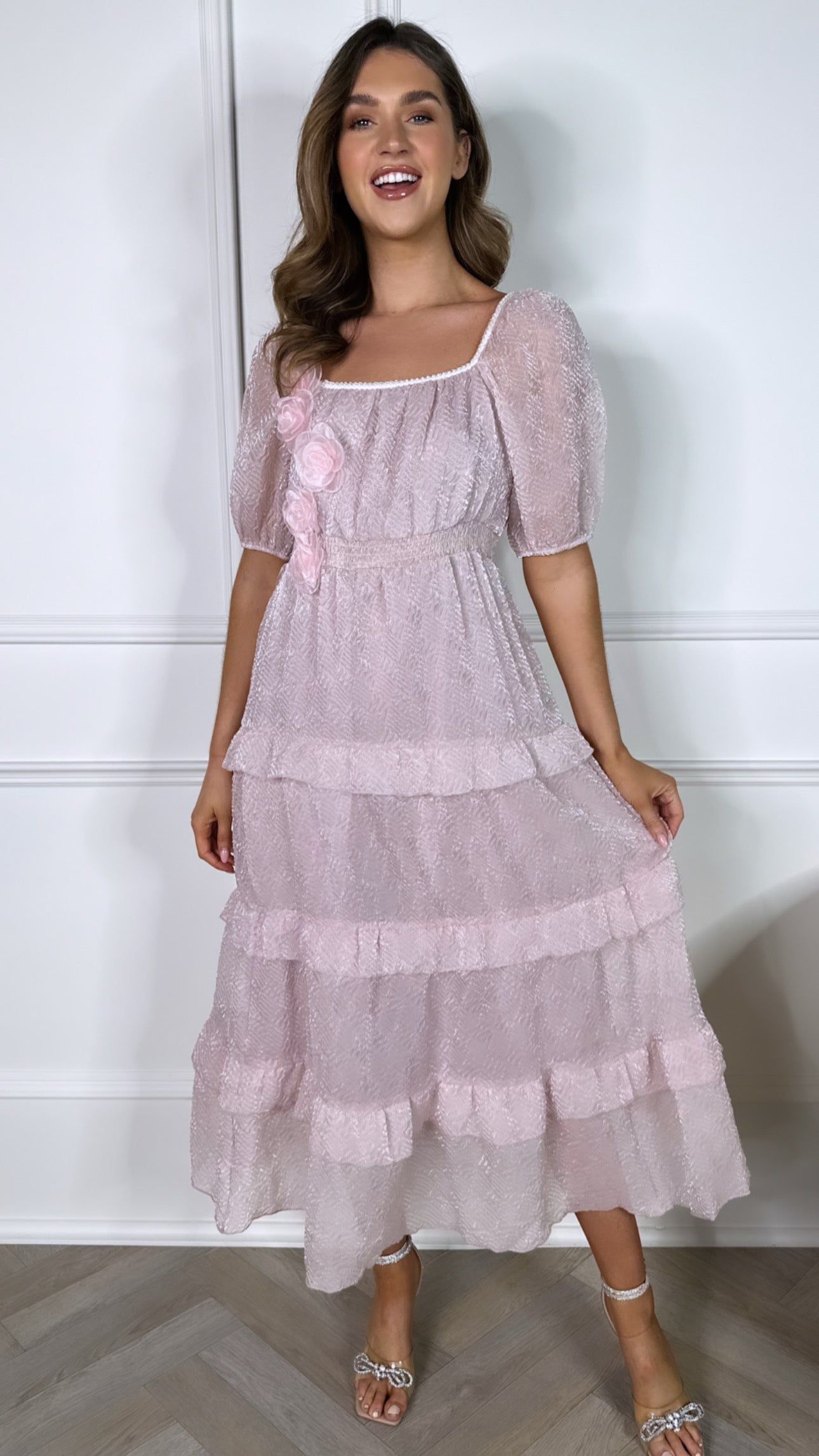 Isabella Pink Corsage Detail Tiered Midaxi Dress