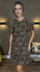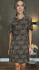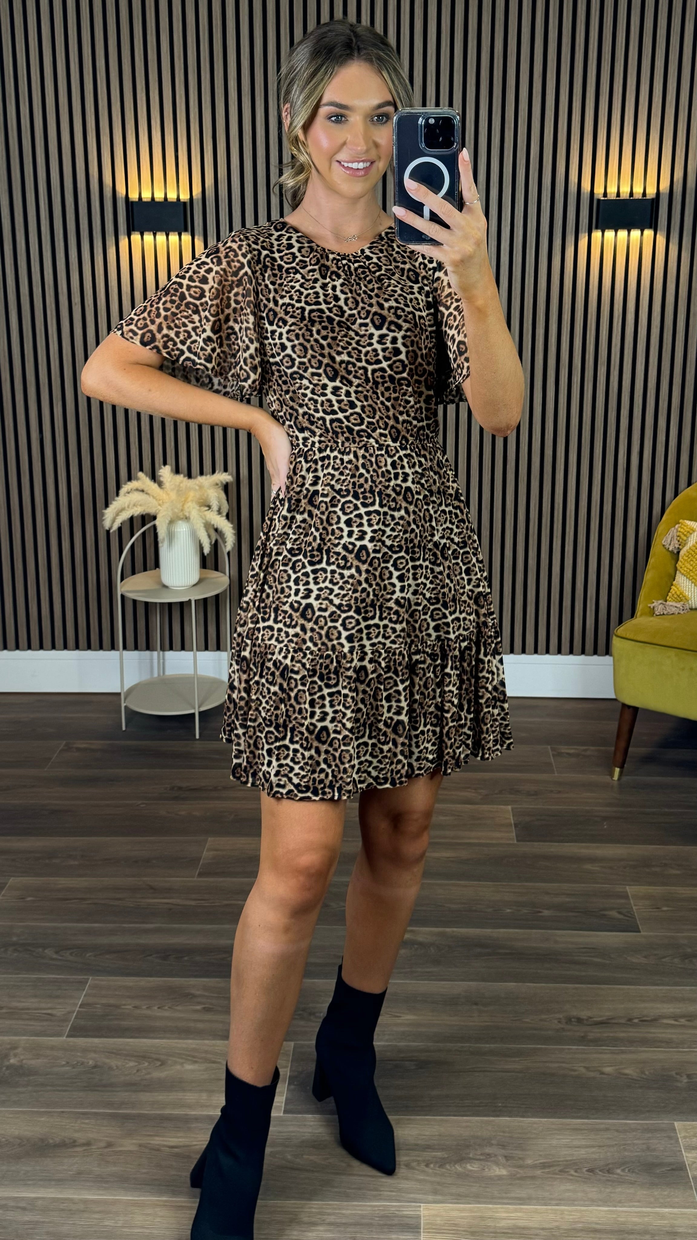 Step out in style with the Isabelle Beige & Black Leopard Print Mini Dress! 🐆 Featuring flirty flutter sleeves and a comfy round neckline, this dress adds a splash of fun to your look. The elasticated waist ensures a perfect fit that moves with you all day long. Perfect for turning heads and feeling fierce! ✨🖤