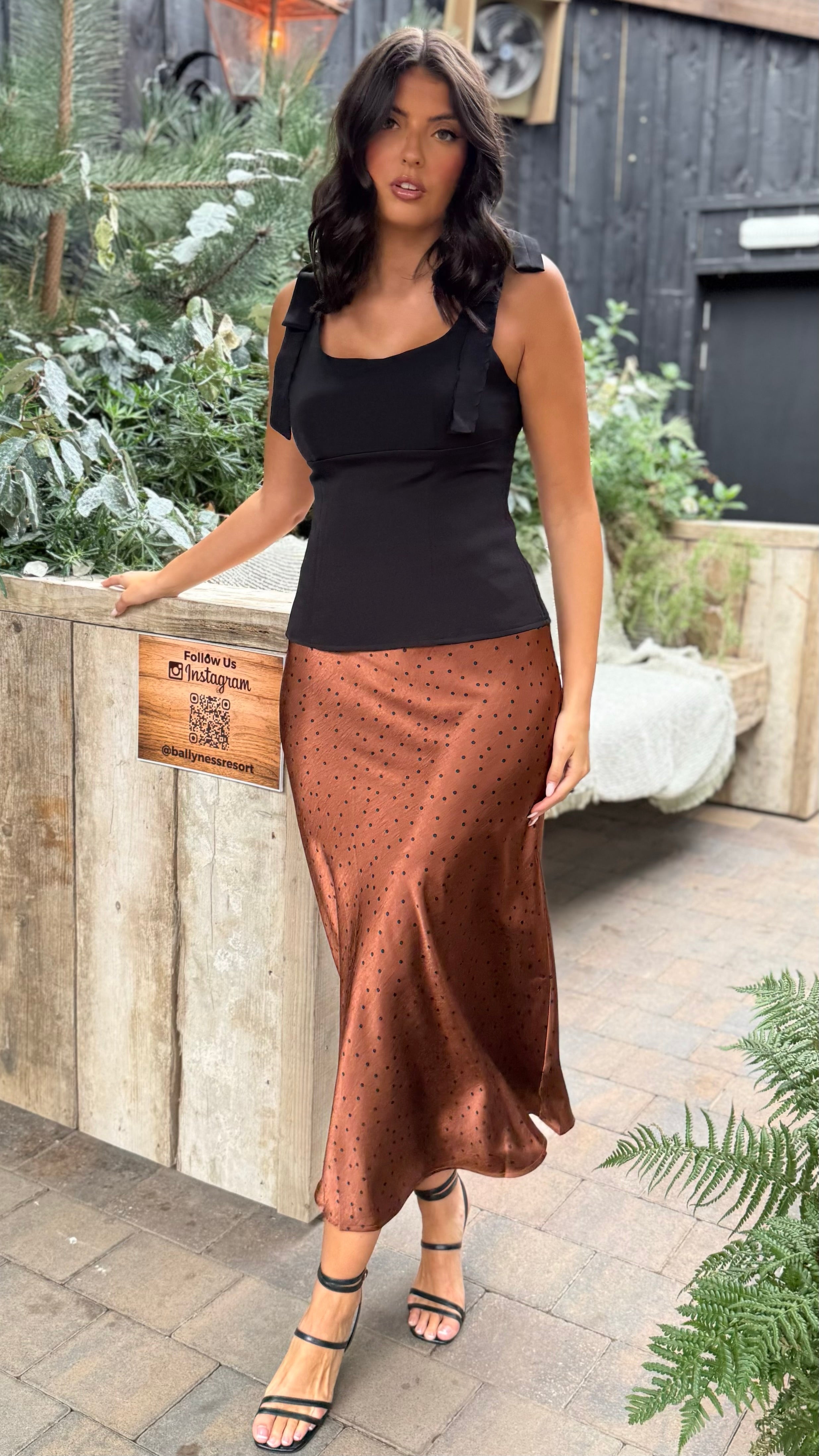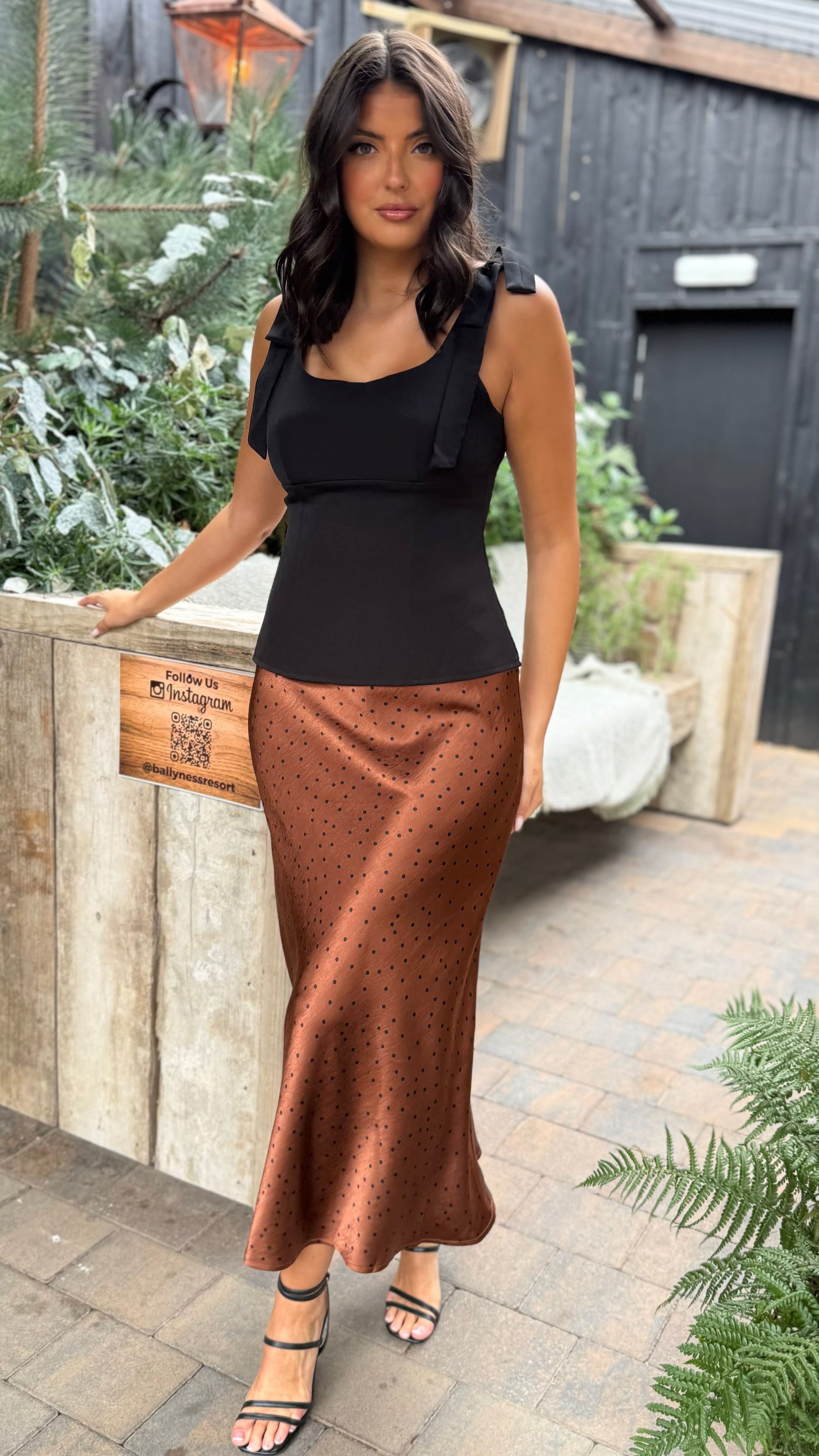 Elevate your wardrobe with the Isha Brown Polka Dot Satin Slip Skirt. Crafted from smooth satin, its midaxi length and slip style create an effortlessly elegant silhouette. The elasticated waistband ensures a comfortable fit, while the classic polka dot pattern adds timeless charm.