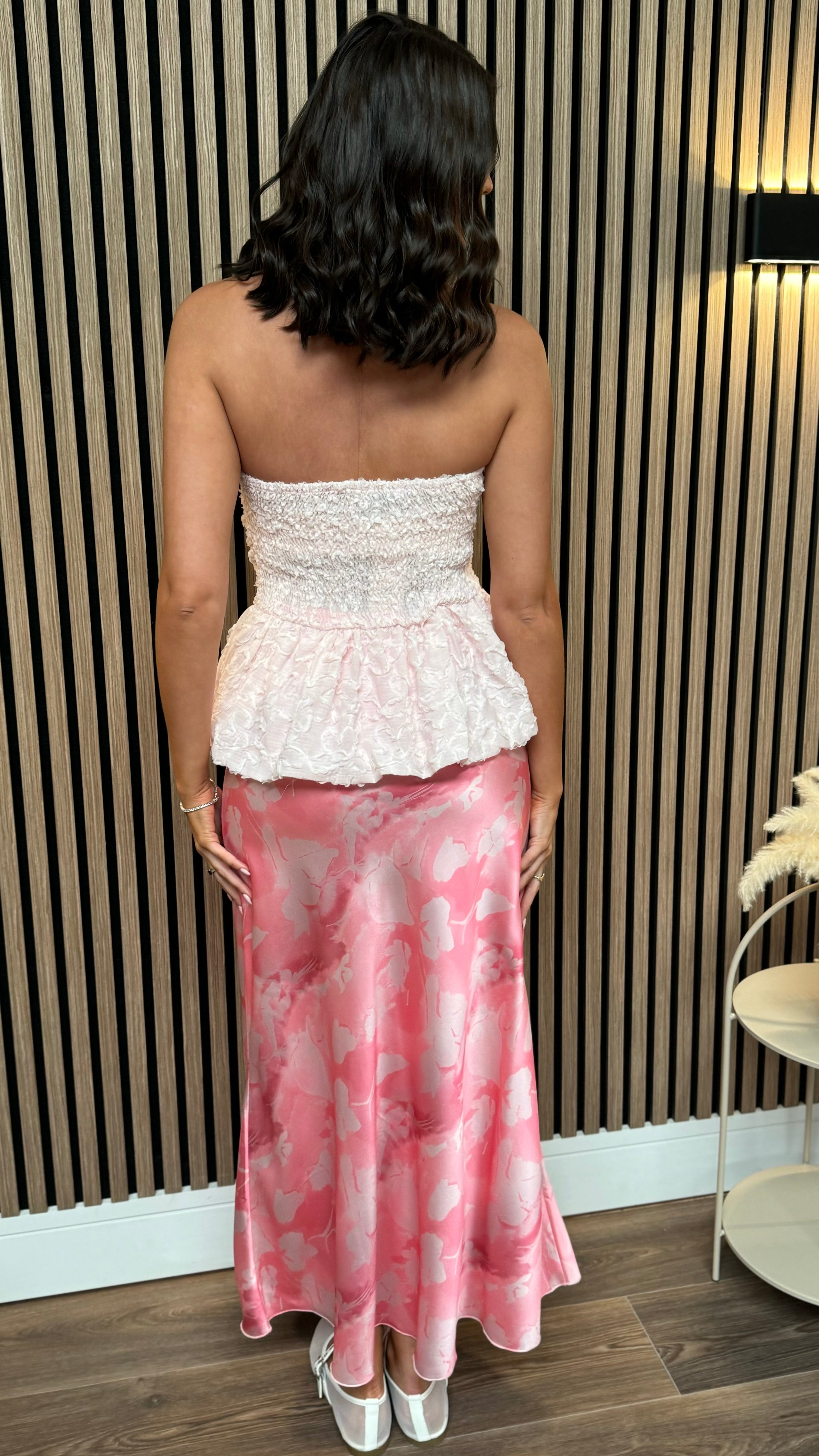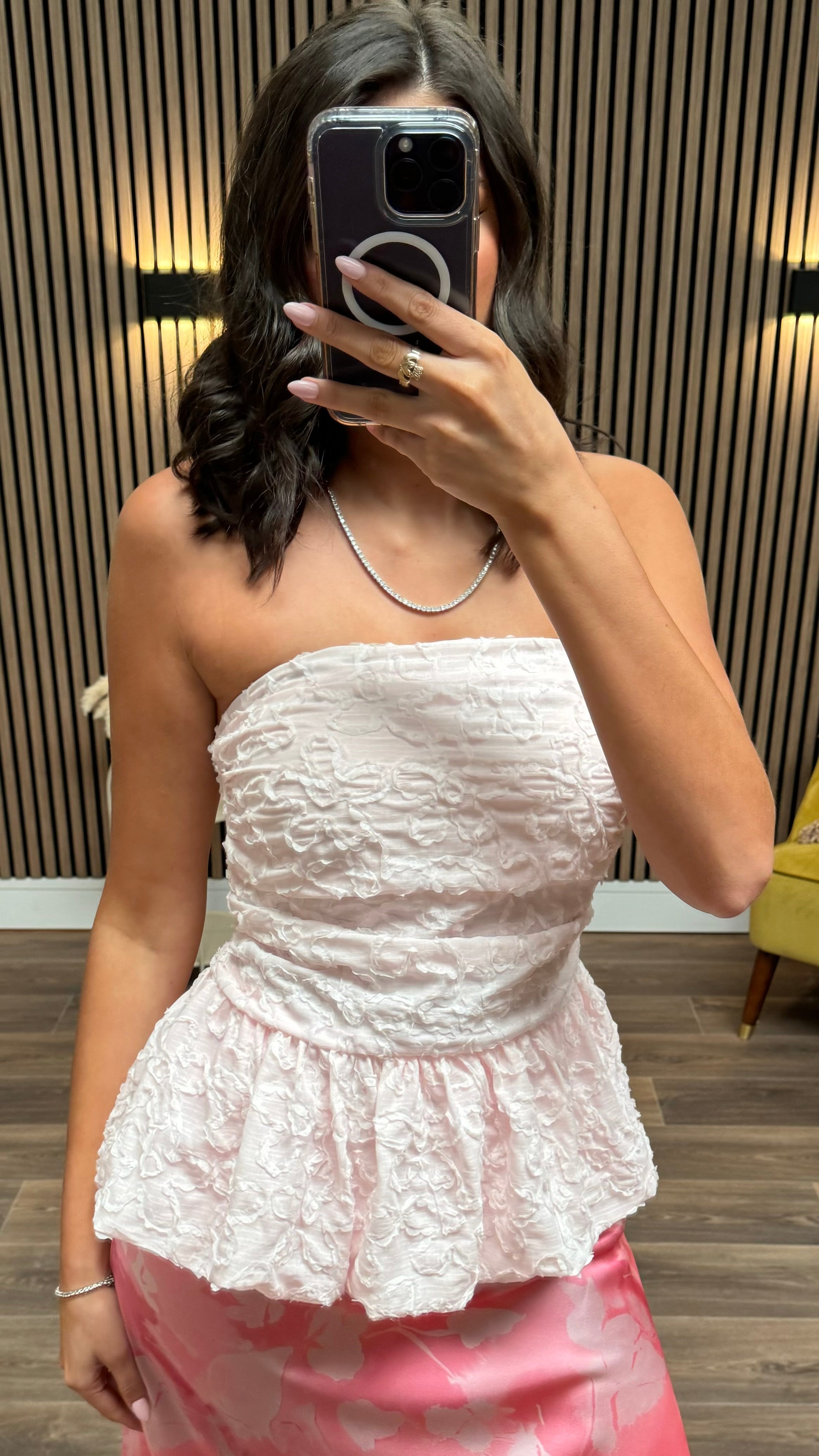 Jaclyn Pink Textured Burnout Bubble Hem Strapless Peplum Top