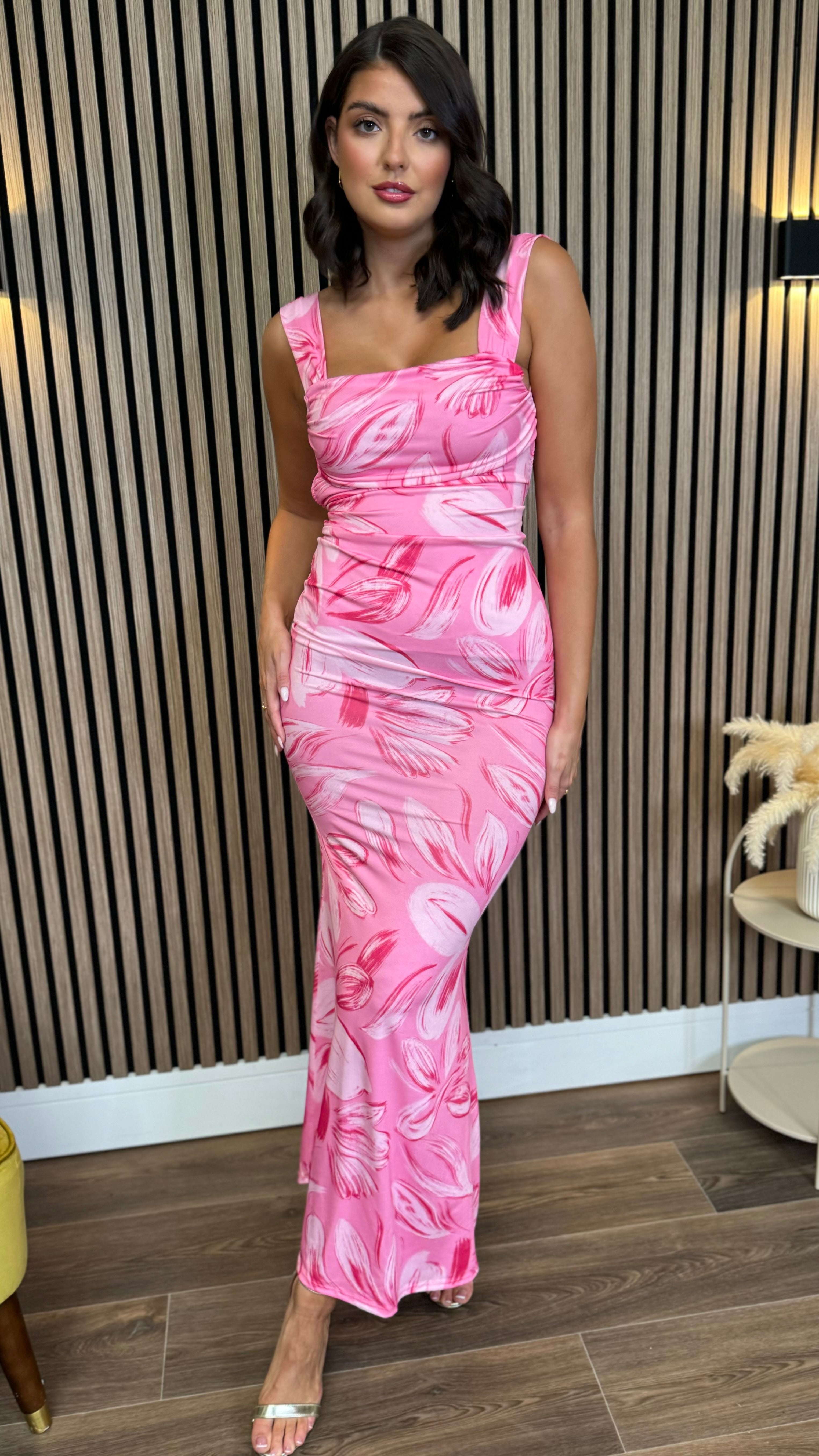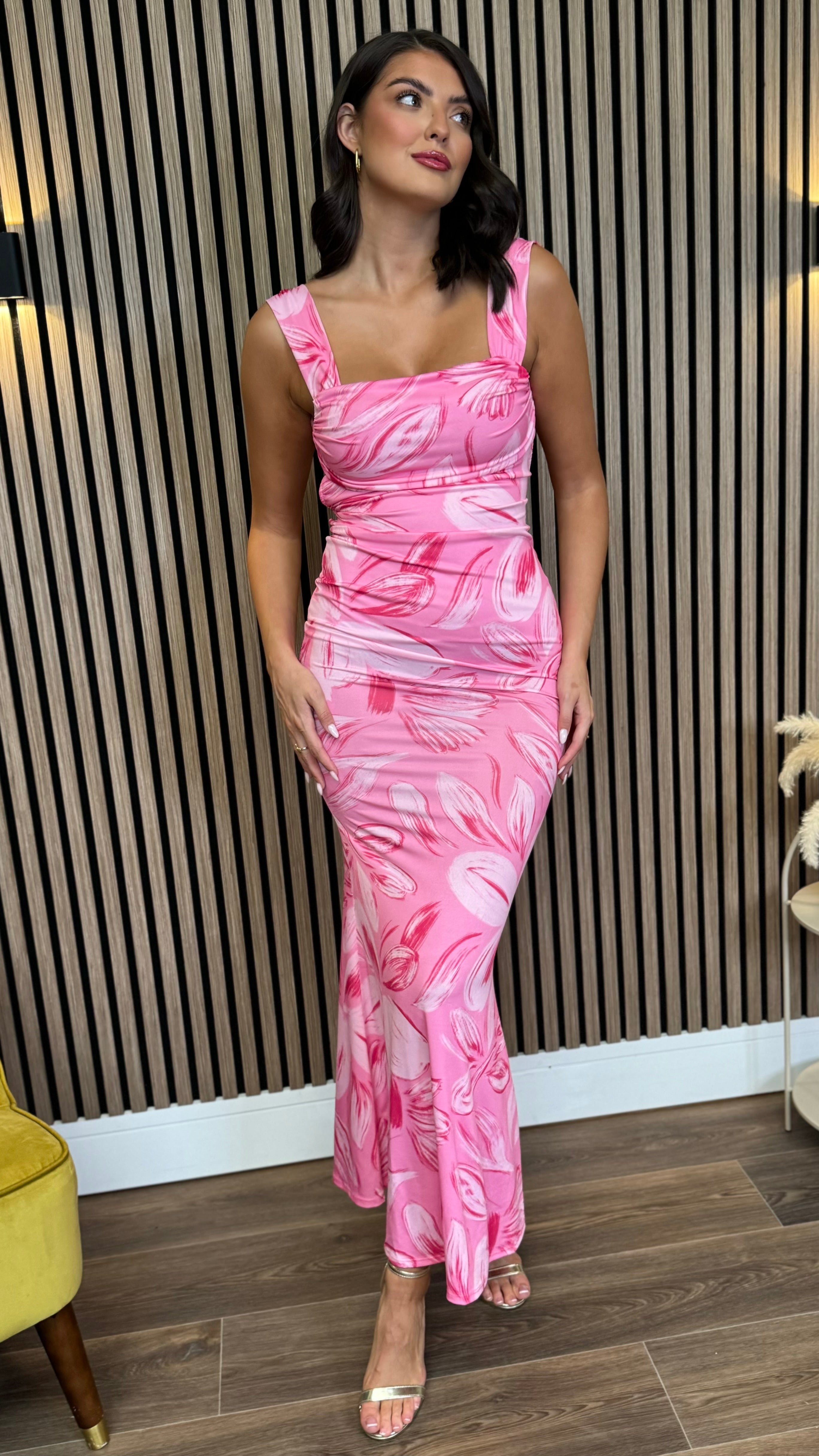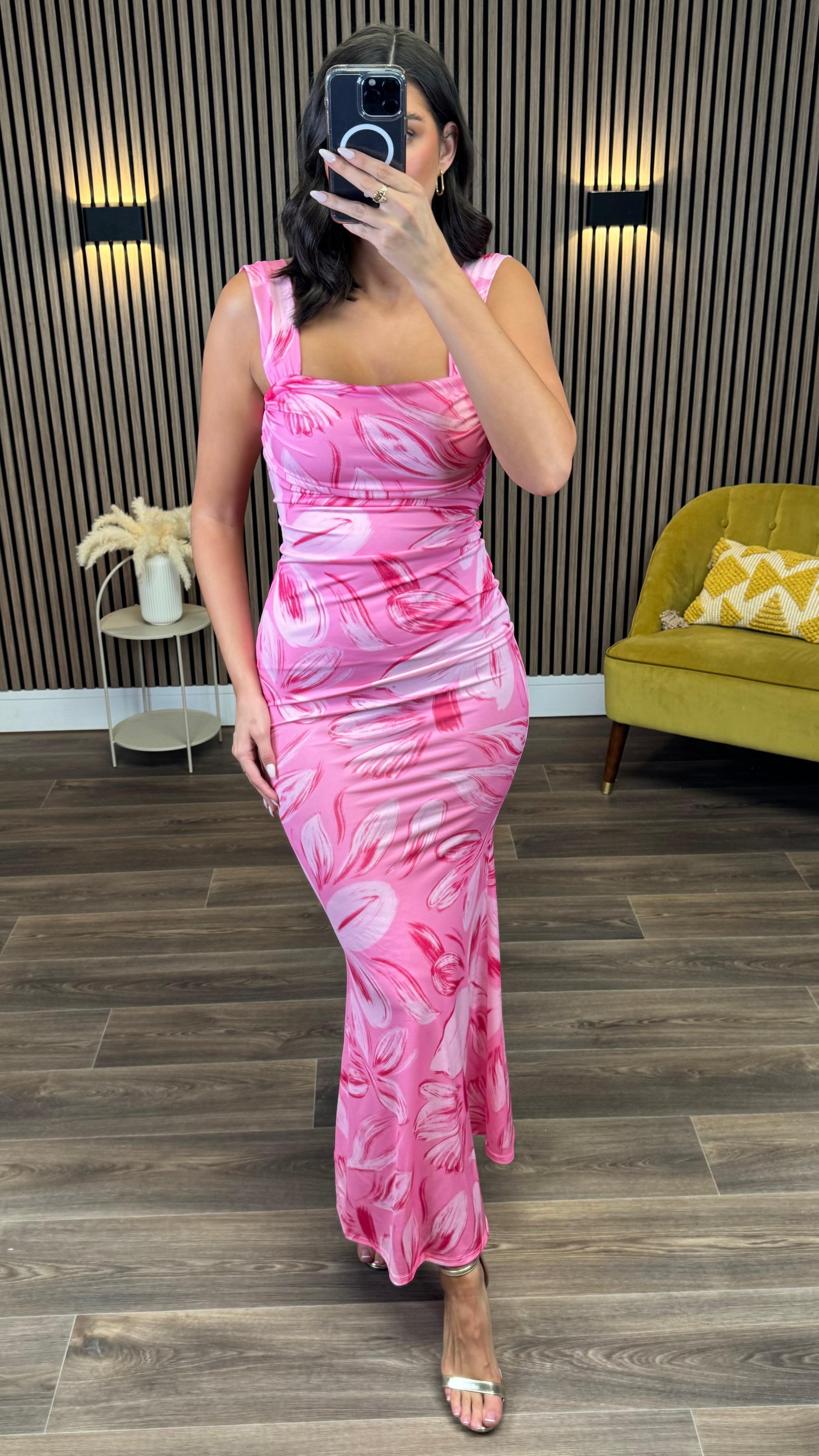 Jade Pink Floral Square Neck Tie Back Detail Midaxi Dress