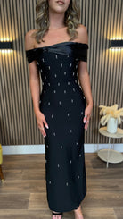 Slip into the Jen Black Embellished Bandage Midaxi Dress and shine at every special occasion! Crafted from stretchy bandage material, it hugs your curves perfectly while silver embellishments add a dazzling touch all over. The fitted design and concealed zip ensure a sleek silhouette, making you feel confident and ready to dance the night away. Perfect for turning heads with a playful sparkle!