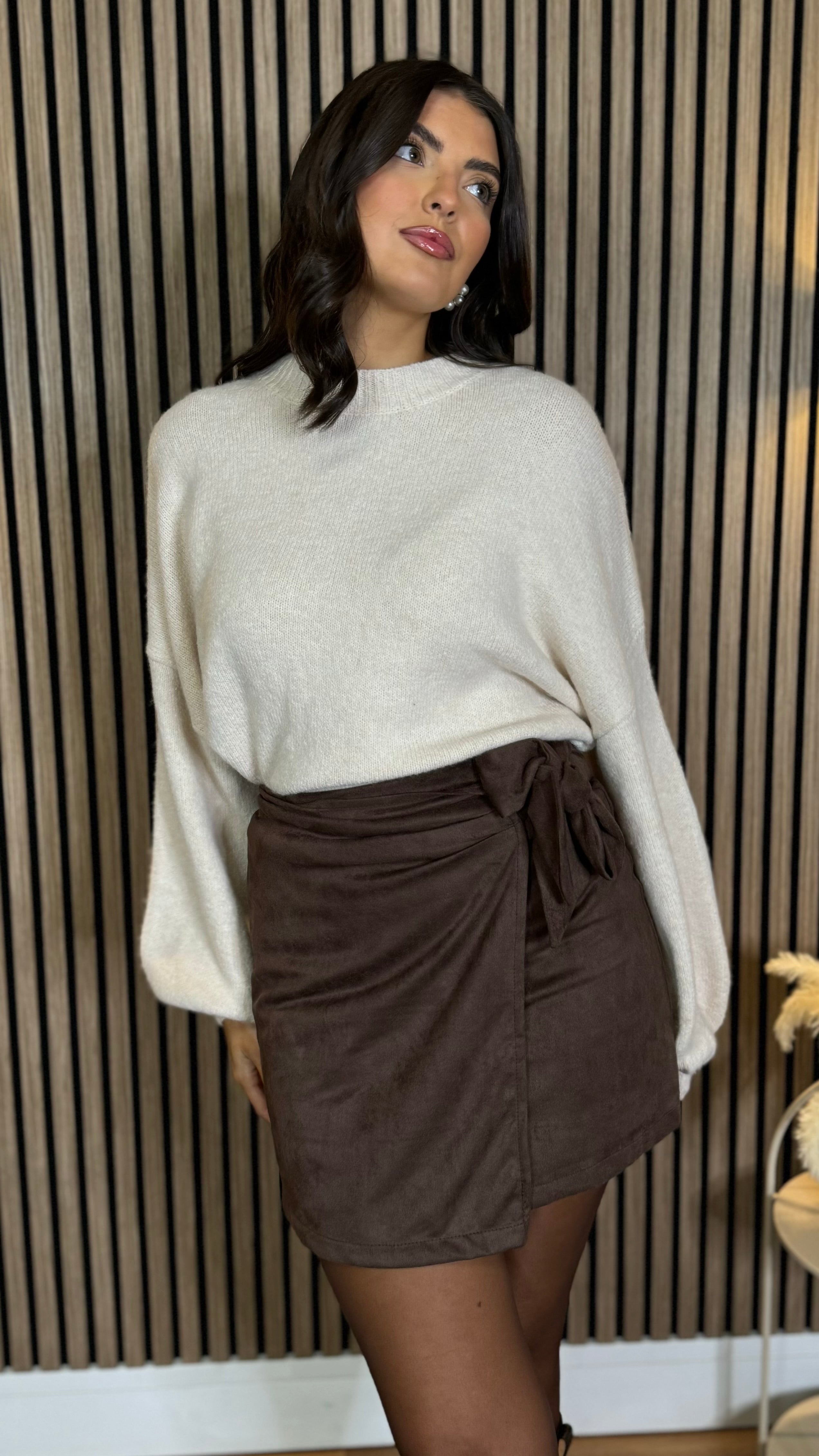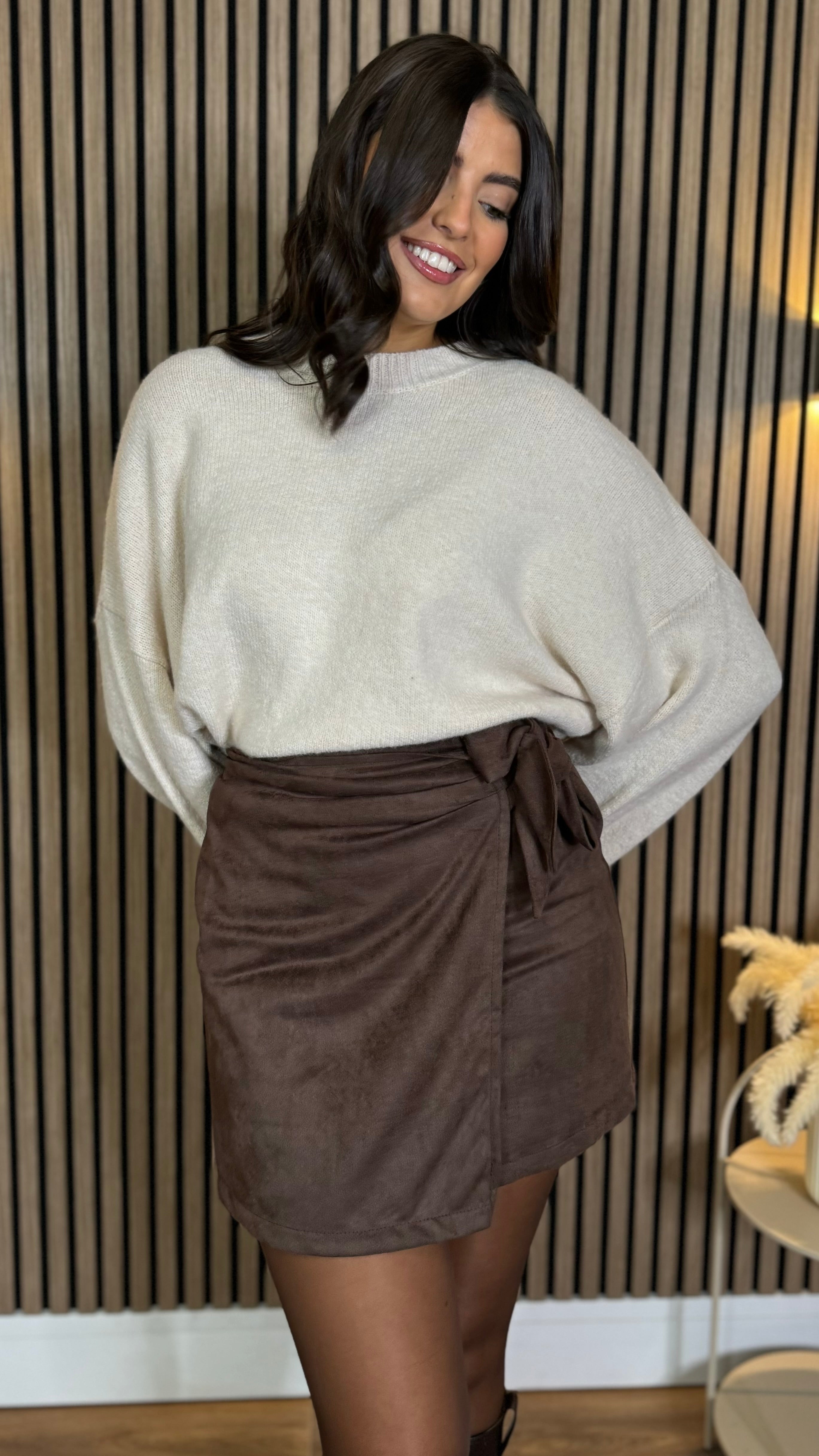Elevate your wardrobe with this gorgeous chocolate brown suede skirt that's equal parts chic and fun. Featuring a flattering wrap style with a charming side bow tie, this piece brings effortless elegance to any outfit. The luxurious suede fabric drapes beautifully while the ruched detailing adds texture and dimension for a modern silhouette. Perfect for dressing up or down, this skirt is your new go-to for looking polished with personality.