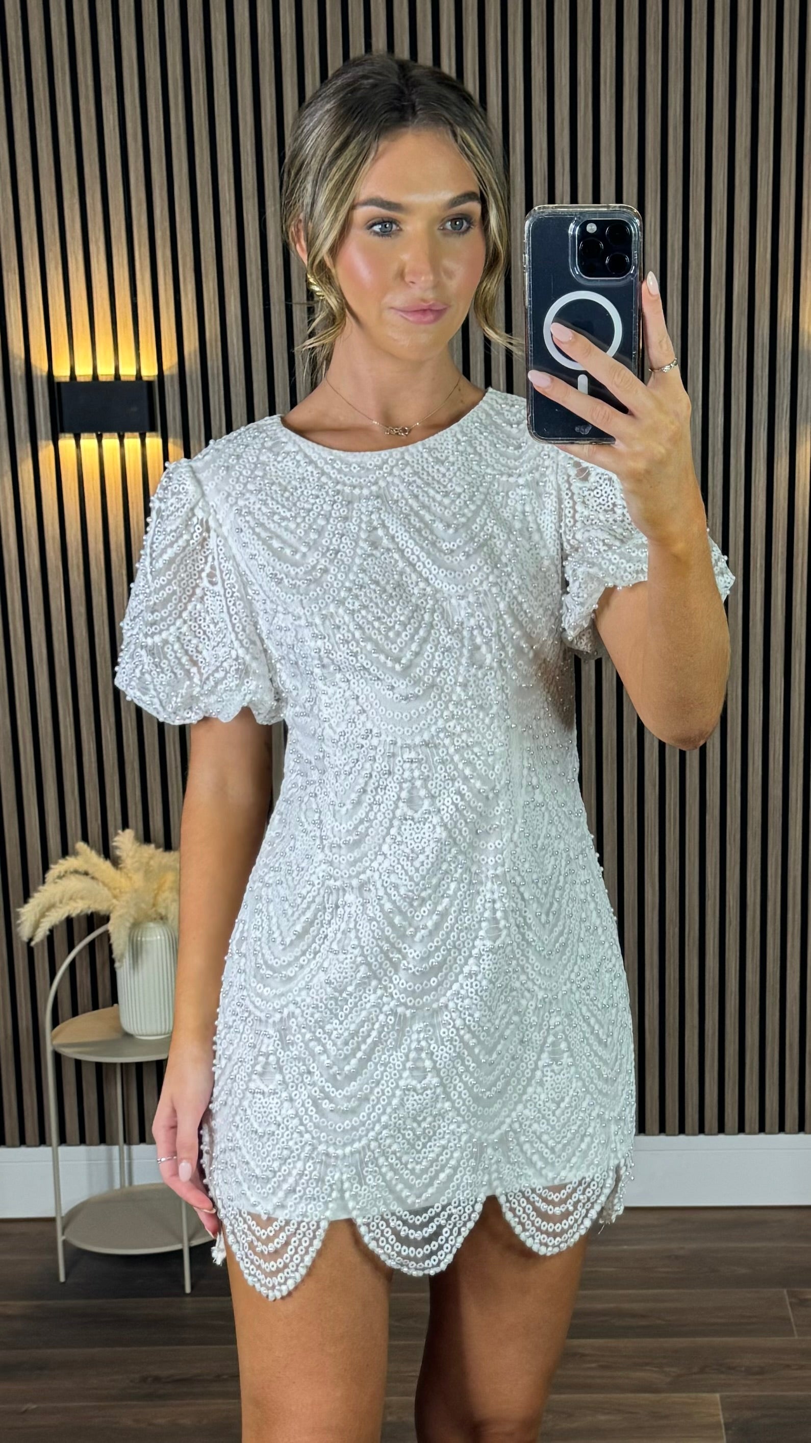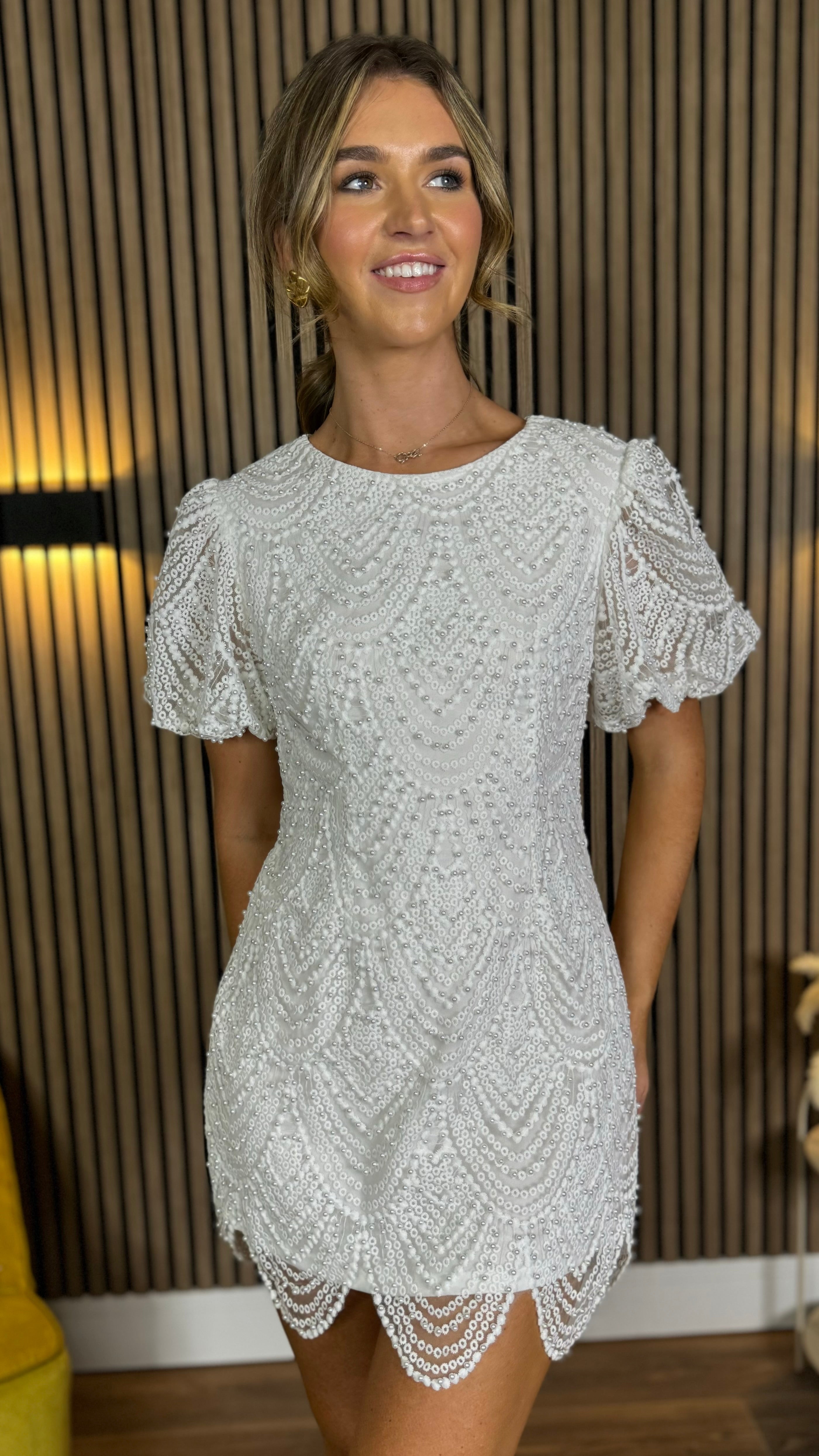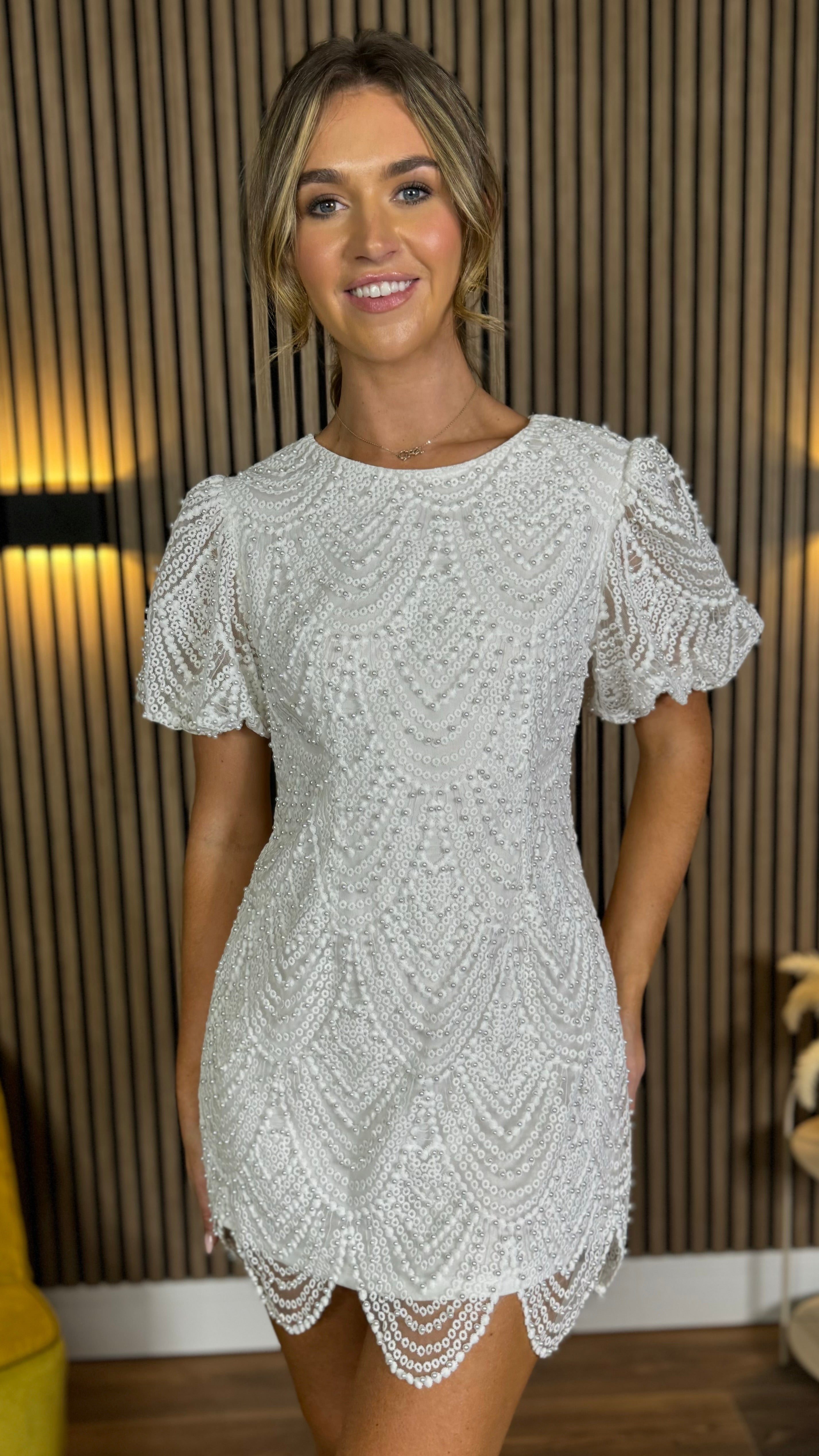 Add a splash of fun and elegance with the Jessica White Mini Dress ✨ Adorned with pearl embossing and playful puff sleeves, this dress shines with a round neckline and a charming detailed hem. Perfect for turning heads and making every moment special! 🎀👗
