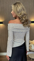 Turn heads in the Jessie Cream Off-Shoulder Sequin Top! Featuring a playful asymmetric hem and a draped bardot neckline, this top effortlessly blends charm and sparkle. The whimsical bell sleeves add a fun twist, while the full sequin coverage guarantees all eyes on you. Perfect for making every moment shine with style and confidence.