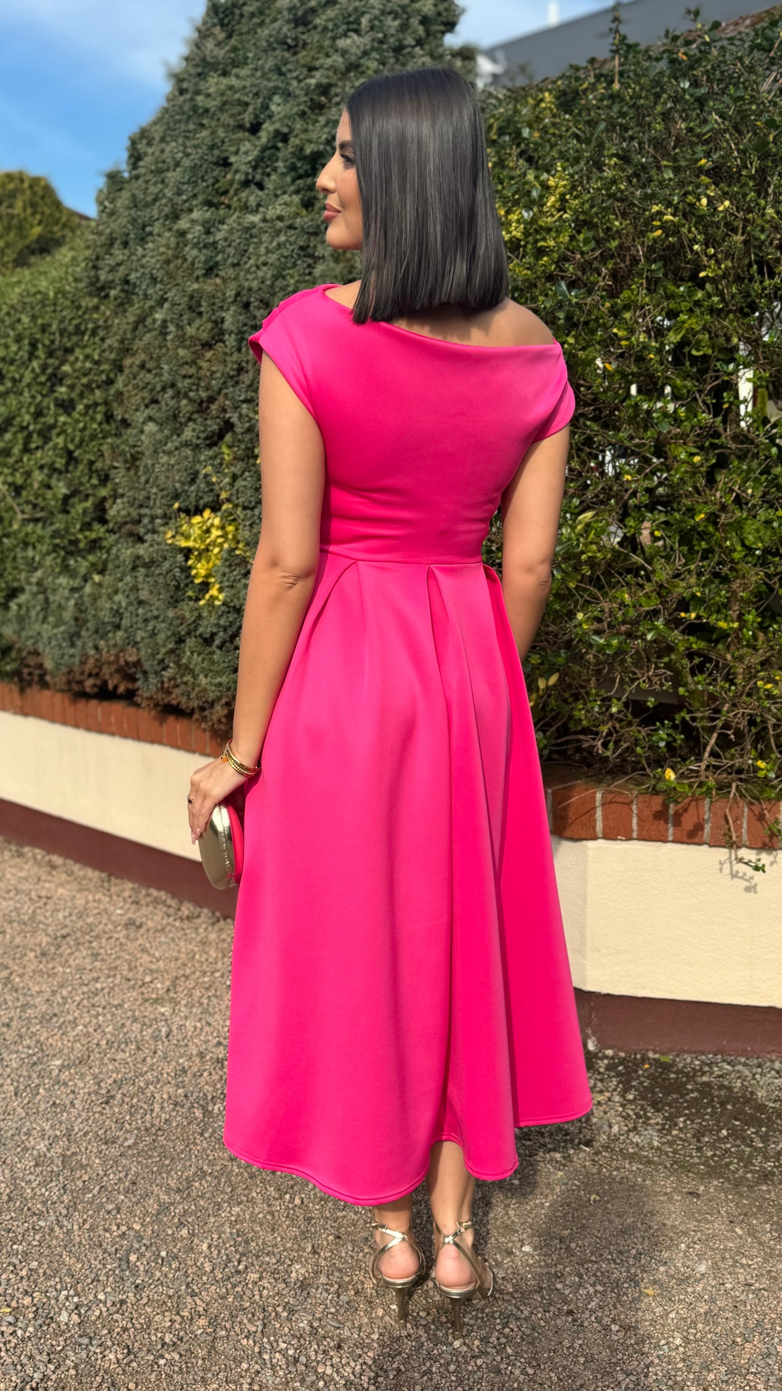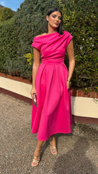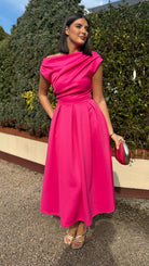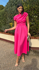 Jezebel Hot Pink Asymmetric Neck Midi Dress